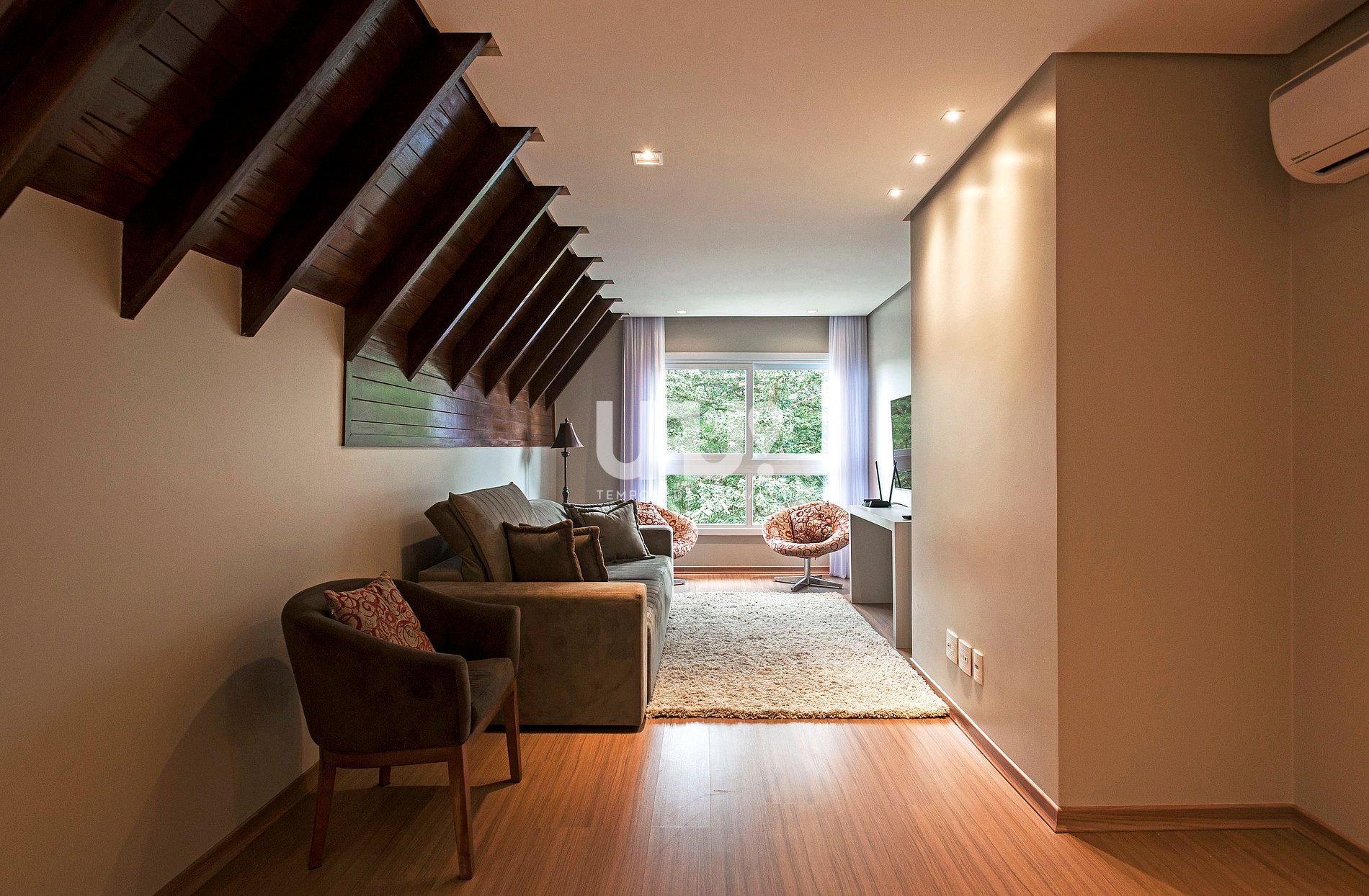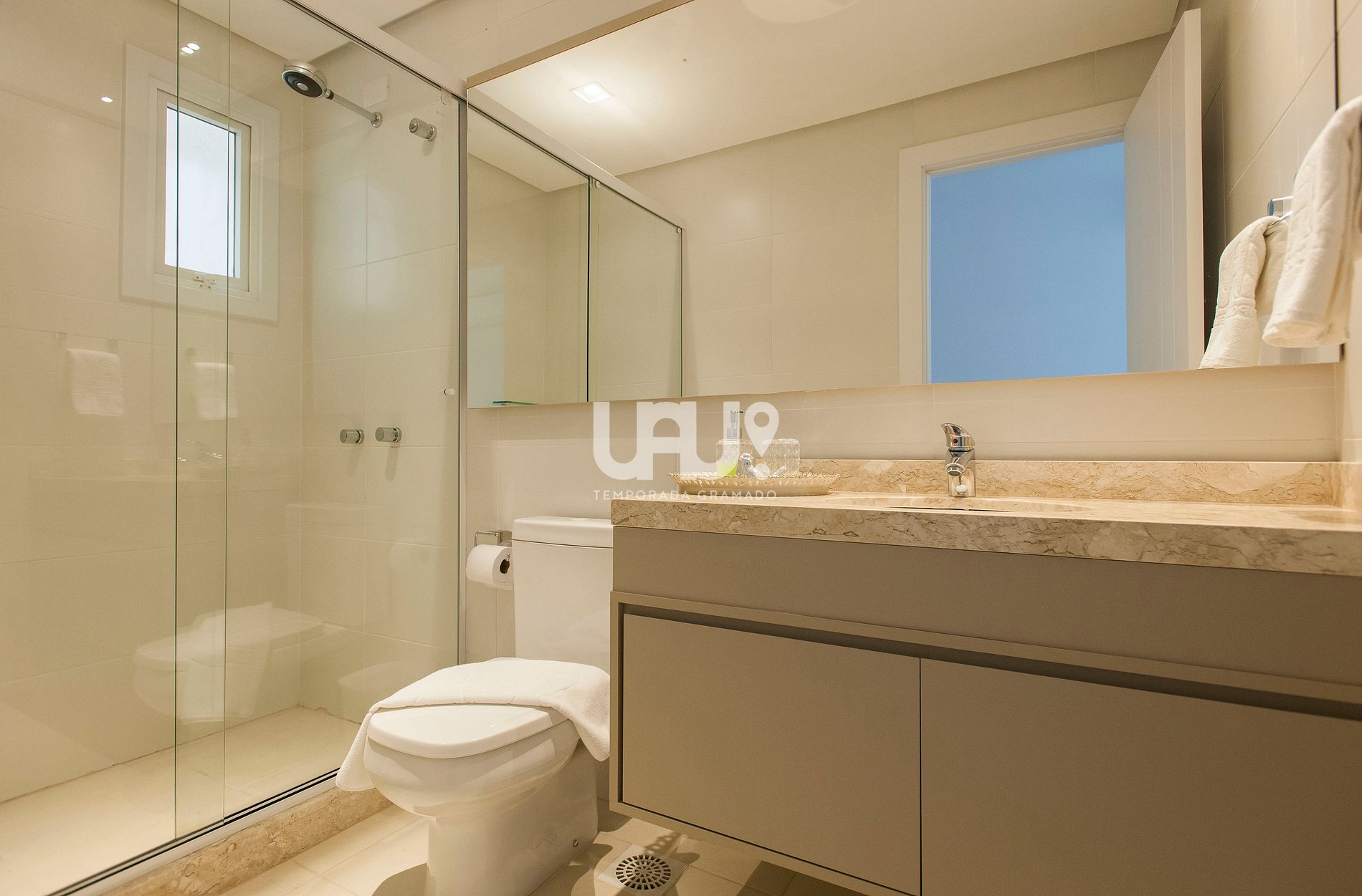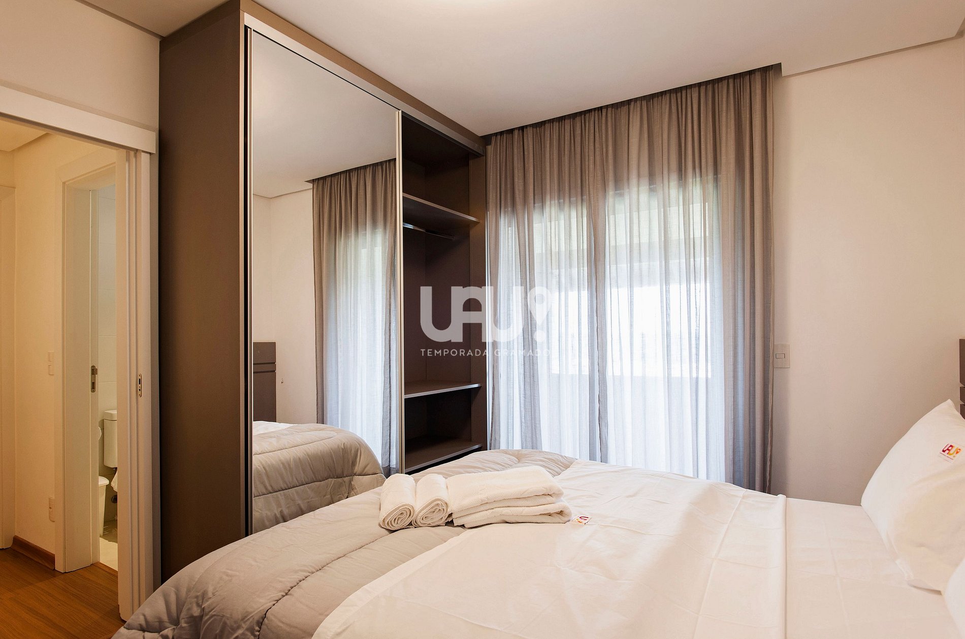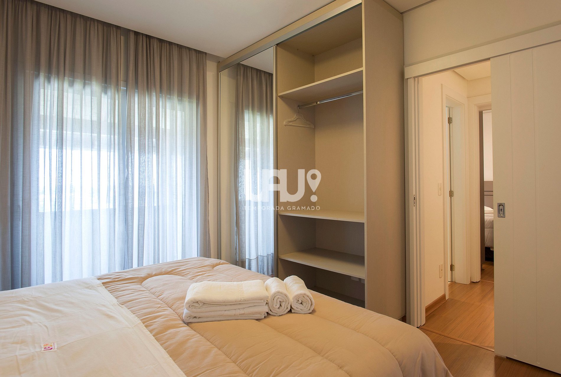 Duas amplas suítes com camas Queen e 2 camas auxiliares, Split Q/F e SmartTVs com Sky (uma com sacada com vista para a Aldeia do Papai Noel);