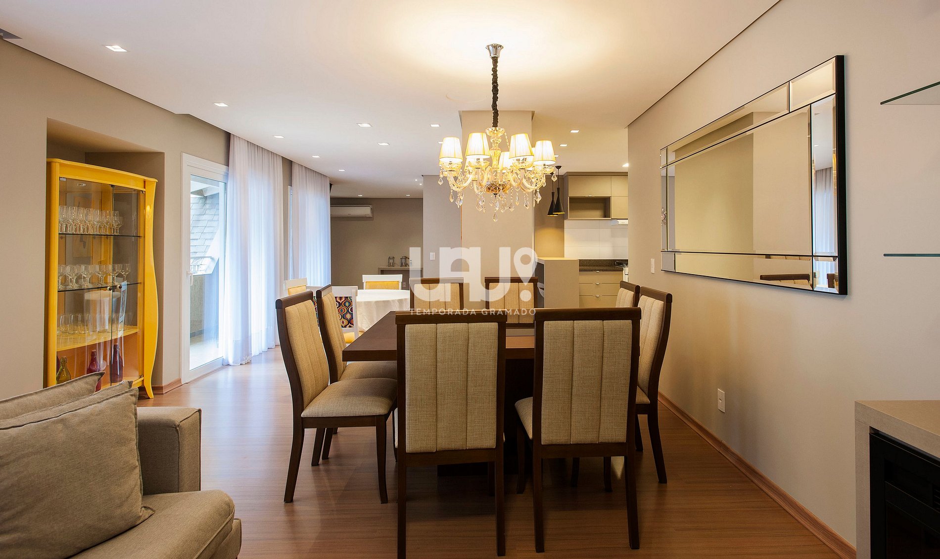 Apartamento com amplo Living em 3 ambientes com 2 mesas de jantar para 10 pessoas, confortáveis sofás e poltronas; SmartTV com Sky em ambas as salas; Split Q/F;