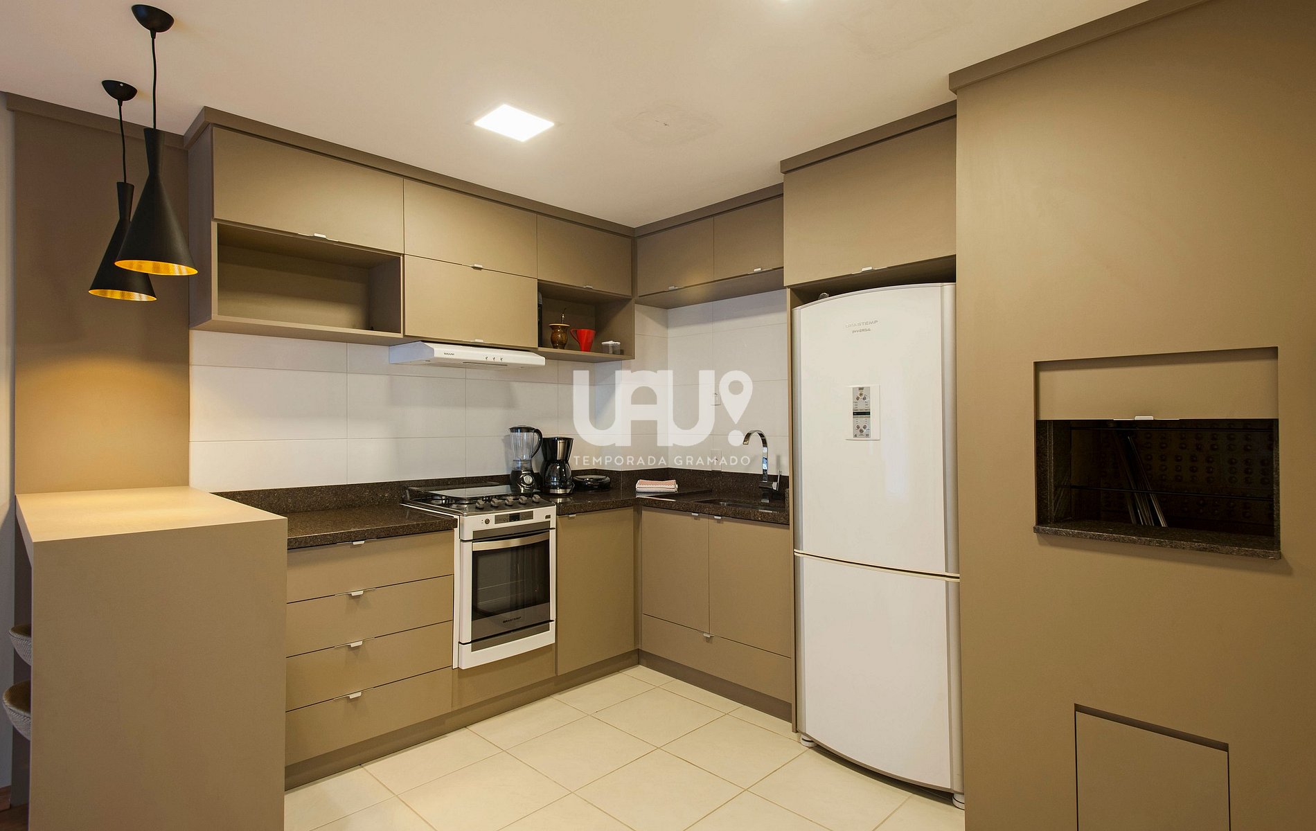 Cozinha em estilo americano totalmente equipada, com churrasqueira;