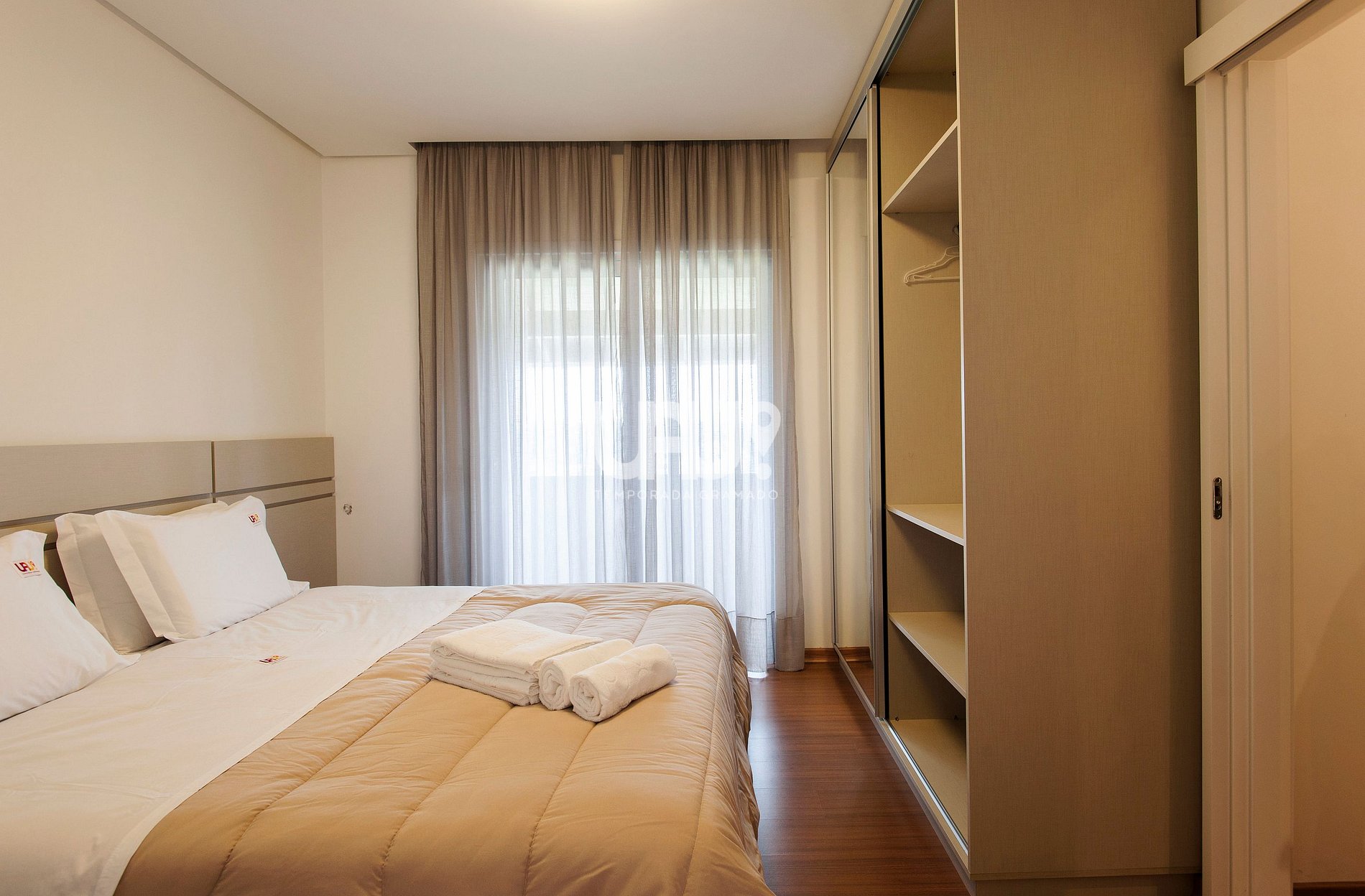 Dormitório com cama Quem Size e cama auxiliar, Split Q/F e acesso à sacada;