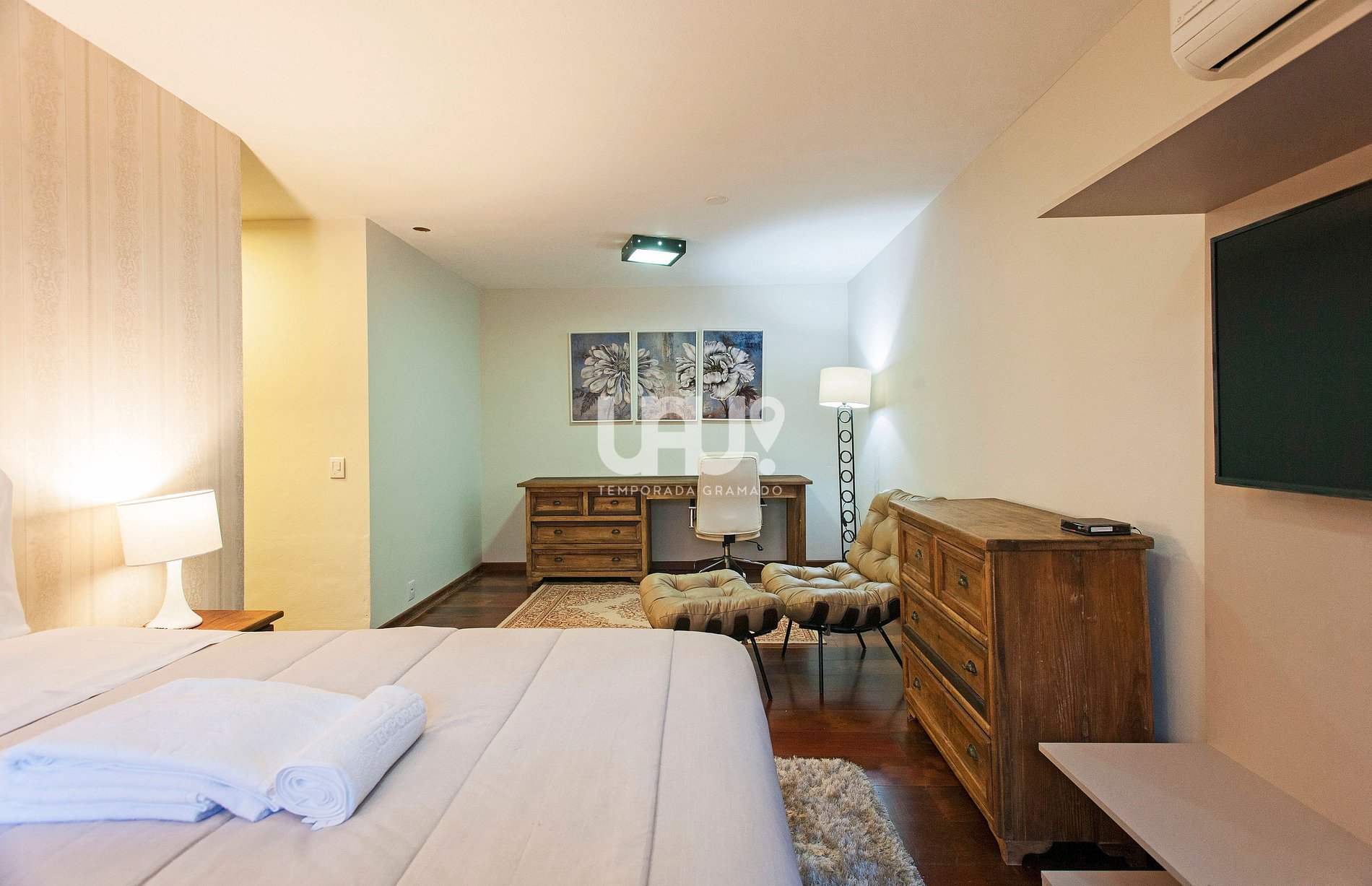 Dormitório com cama Queen Size, duas camas auxiliares e rouparia completa;