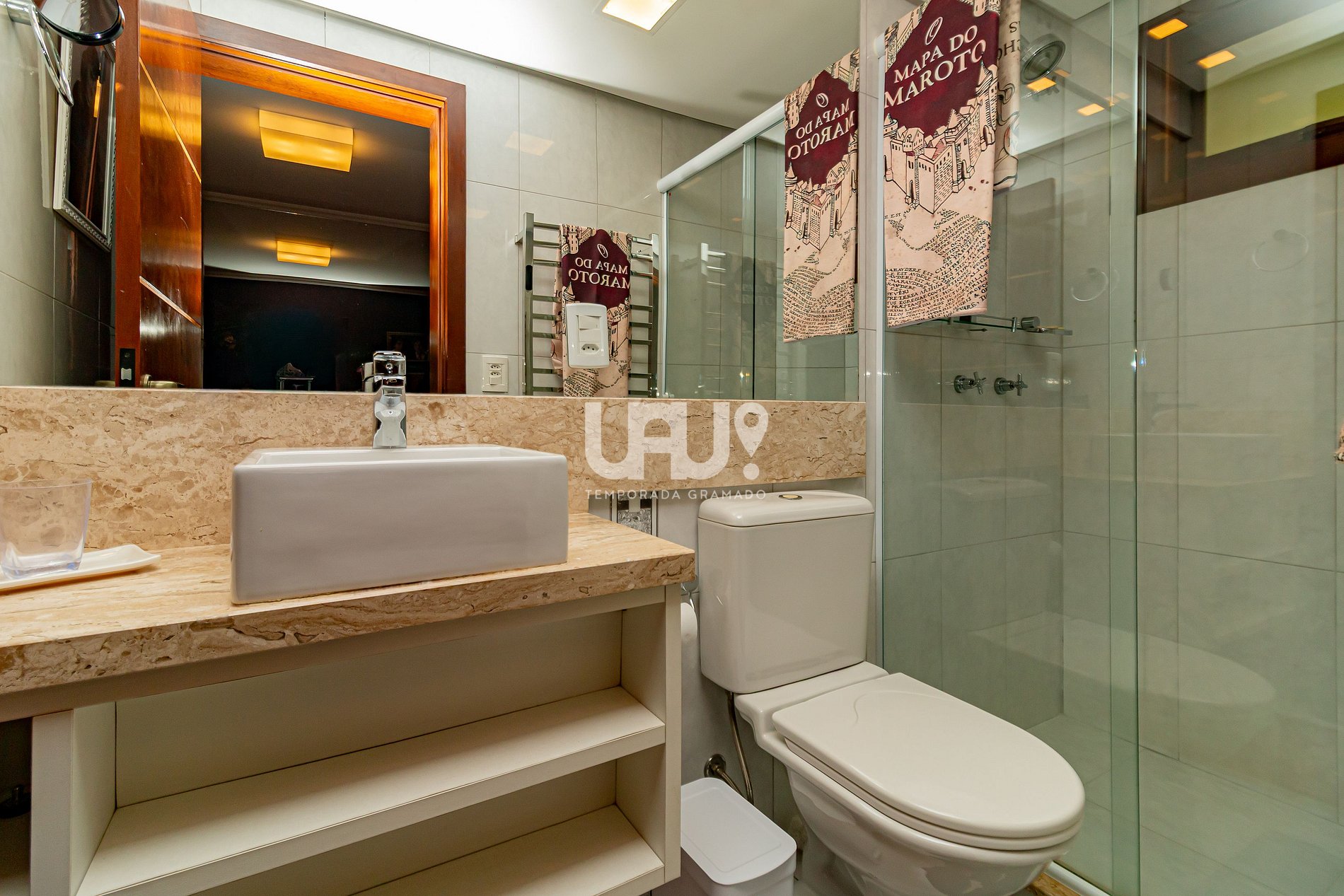 Não pode deixar de jantar à luz de velas na mesa da Grifinória esperando o correio-coruja, tirar uma soneca no sofá cama da Sonserina, tomar um cafézinho nas poltronas da Lufa-Lufa ou também degustar uma cerveja na bancada da Corvinal, com o olhar fulminante da jornalista Rita Skeeter. O Dobby está de férias eternas, mas você pode fazer uma deliciosa torta de abobora na cozinha que está toda equipada ou usar a churrasqueira para agradar seus parentes trouxas, também pode lavar seu uniforme de Hogwarts na máquina lava e seca. Temos um terminal do Banco Bruxo Gringotes, caso precise sacar algumas moedas de ouro para passeios pela cidade de Gramado. Esses passeios podem ser feitos com sua vassoura, pois o Mini Mundo dista apenas 500m, o Lago do Natal Luz, 600m e a Rua Coberta, 1200m. Mas corre o risco de quando você chegar ao terminal, esse ter sofrido um furto, pois Pedro Pettigrew já foi visto pela cidade. No caso de algum ataque de Dementadores, fique em casa e desfrute muitos livros antigos e a coleção Harry Potter, sem esquecer de estudar e copiar as receitas da nossa área de poções. Também ficou liberado para os trouxas duas SmartTV 50” com internet 350 mega e Splits. Murta Que Geme, fez questão de oferecer um enxoval completo e muito confortável, mas ela vai aparecer no banheiro para te assombrar. Importante alertar, que o local só possui estacionamento para vassouras dentro do apartamento. Caso você seja um trouxa, encontrará facilmente local para seu veículo na rua, em frente ao prédio. O apartamento Harry Potter está localizado na Rua Piratini, 619, junto à Avenida das Hortênsias, a mercados, padarias e aos melhores restaurantes da cidade, mas as escolas de bruxaria estarão fechadas, pois afinal, você está de férias. Na falta de sua criatura, seu pet de pequeno porte é bem- vindo em nosso apartamento, somente reiteramos as responsabilidades, em caso de avaria ou sujeira será cobrado. Em caso de sua criatura ser grande como um hipogrifo, é necessário entrar em contato conosco antes da confirmação da reserva.Texto da Cacau, proprietária (10 anos)!