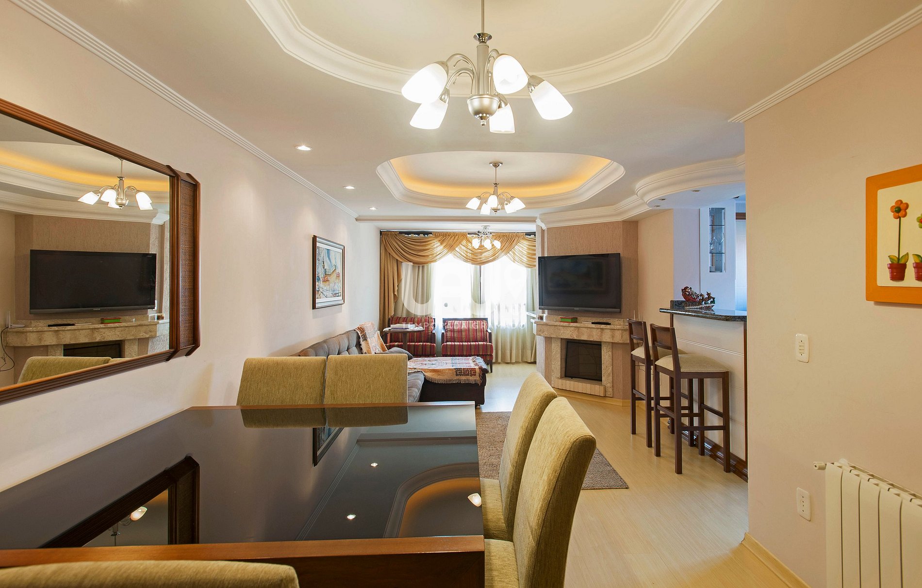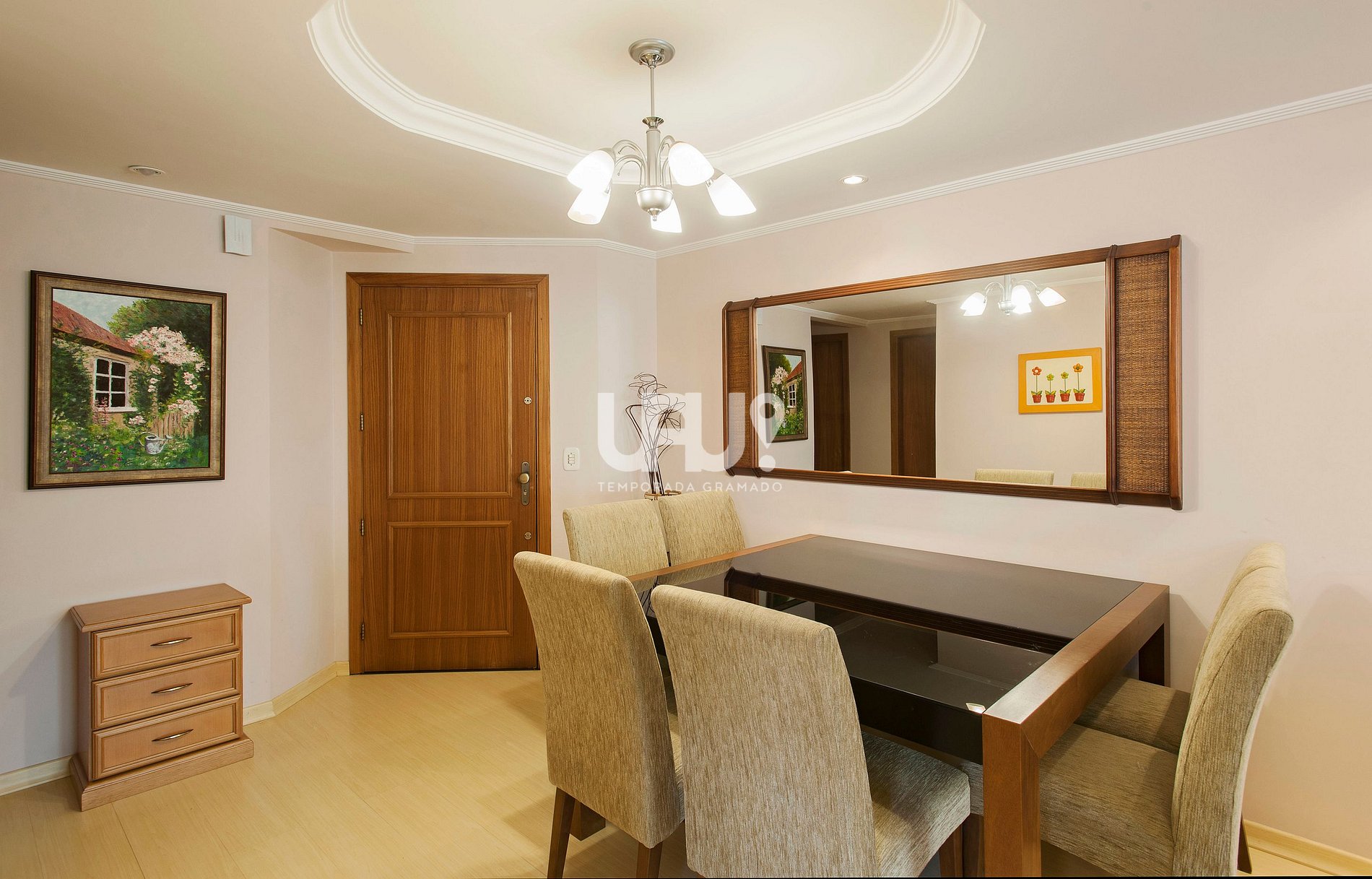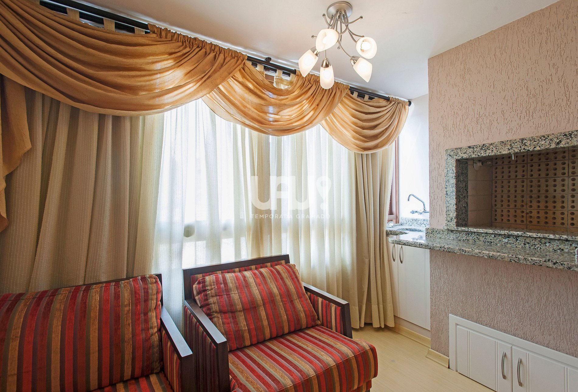 Exuberante Cobertura com 3 dormitórios, sendo uma suíte, no coração de Gramado, a menos de 100m da Rua Coberta. Amplo living com com sala de estar, jantar para 6 pessoas, confortável sofá cama, churrasqueira e lareira;