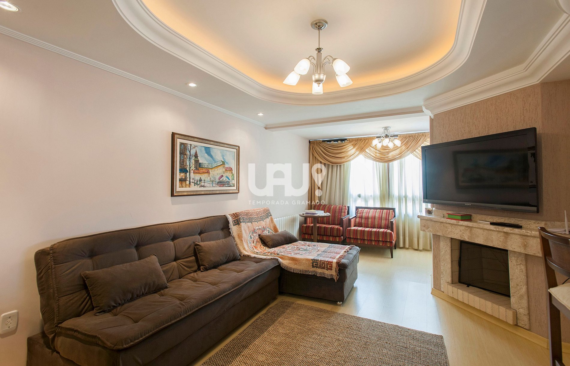 Exuberante Cobertura com 3 dormitórios, sendo uma suíte, no coração de Gramado, a menos de 100m da Rua Coberta. Amplo living com com sala de estar, jantar para 6 pessoas, confortável sofá cama, churrasqueira e lareira;