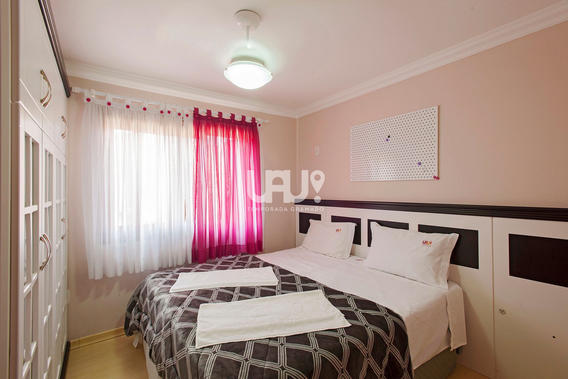 Dormitório com cama Queen Size e 2 camas auxiliares e ar condicionado split Q/F. ;
