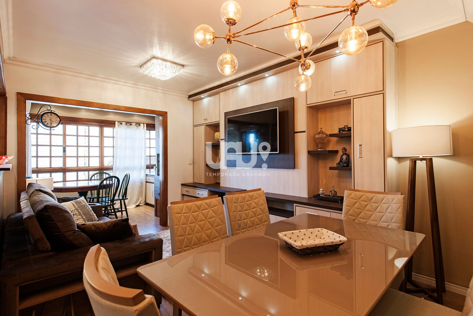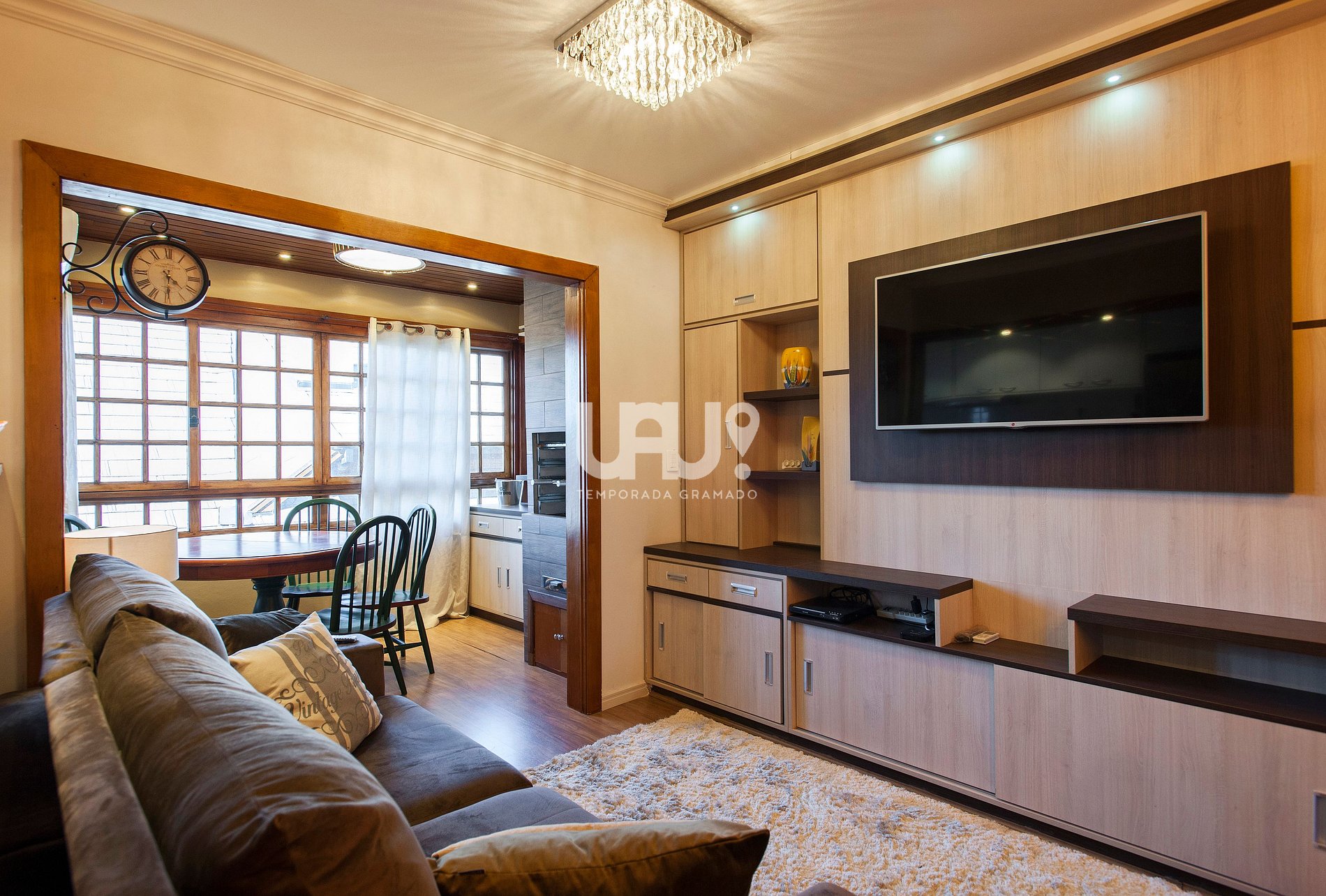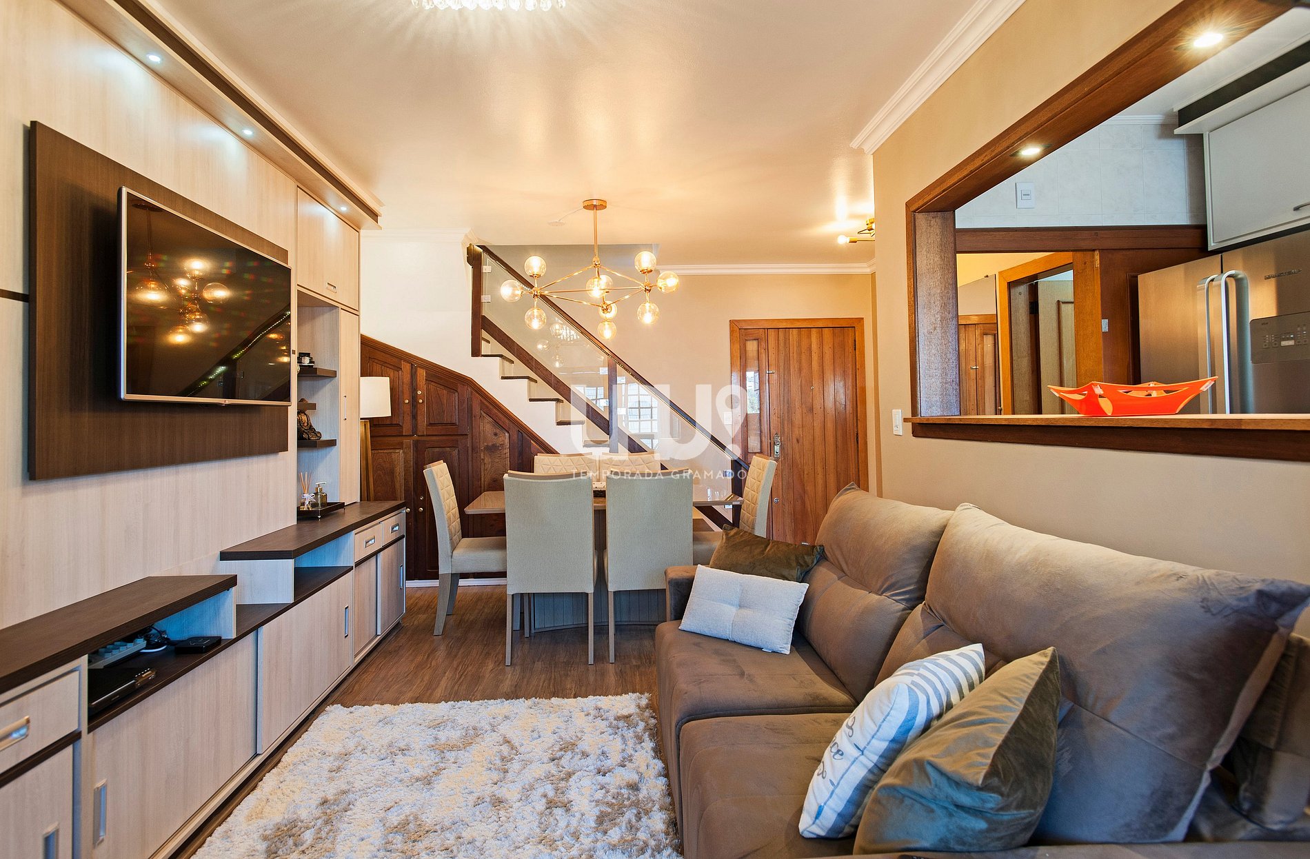 Living em dois ambientes. Sala de estar com SmartTV 50', Split quente e frio, sofá retrátil e jantar, com churrasqueira, integrado à cozinha em estilo americano, totalmente equipada;