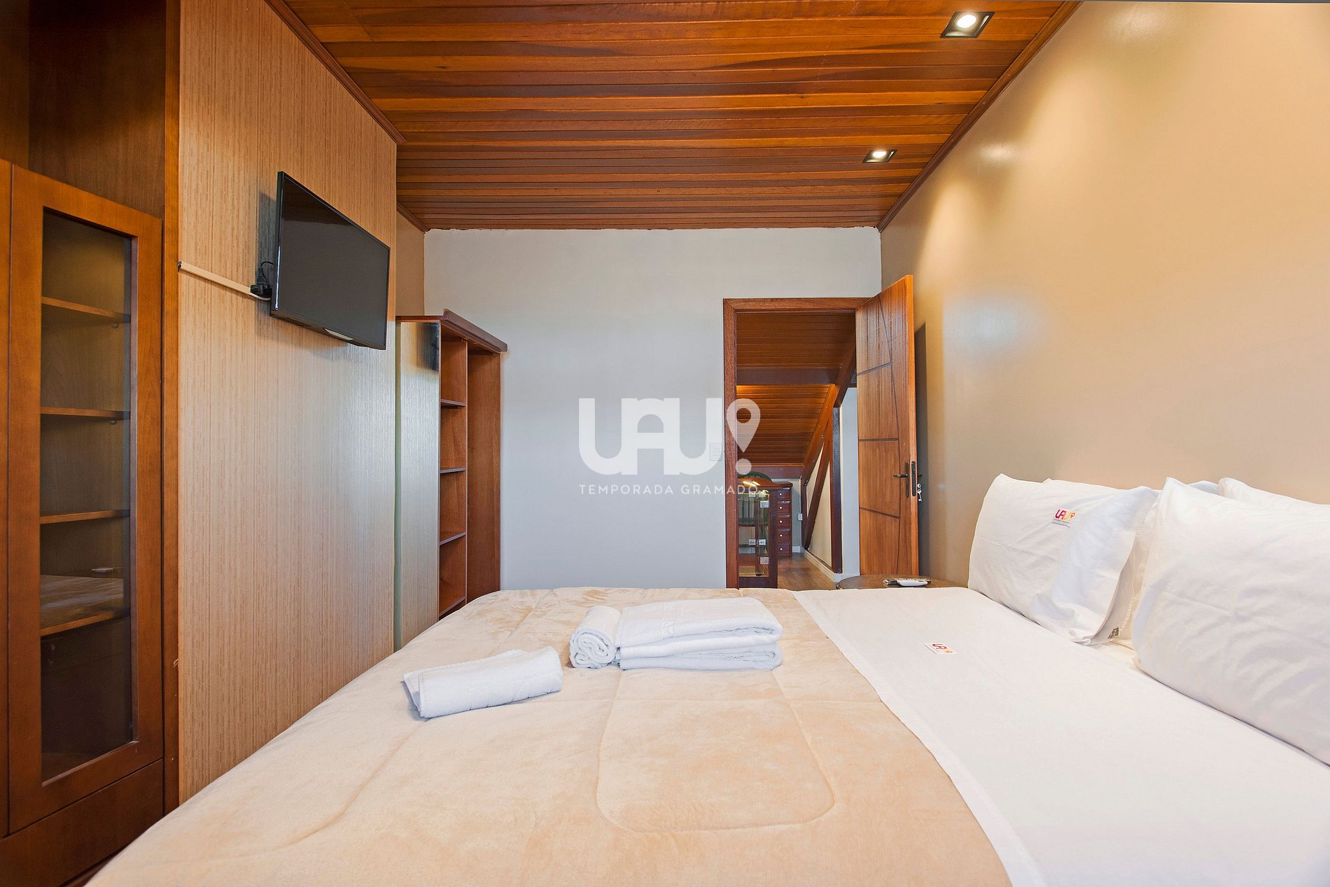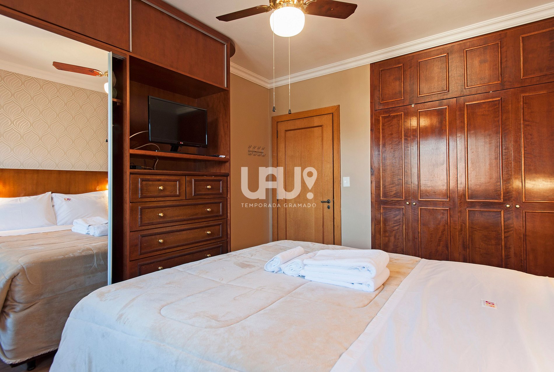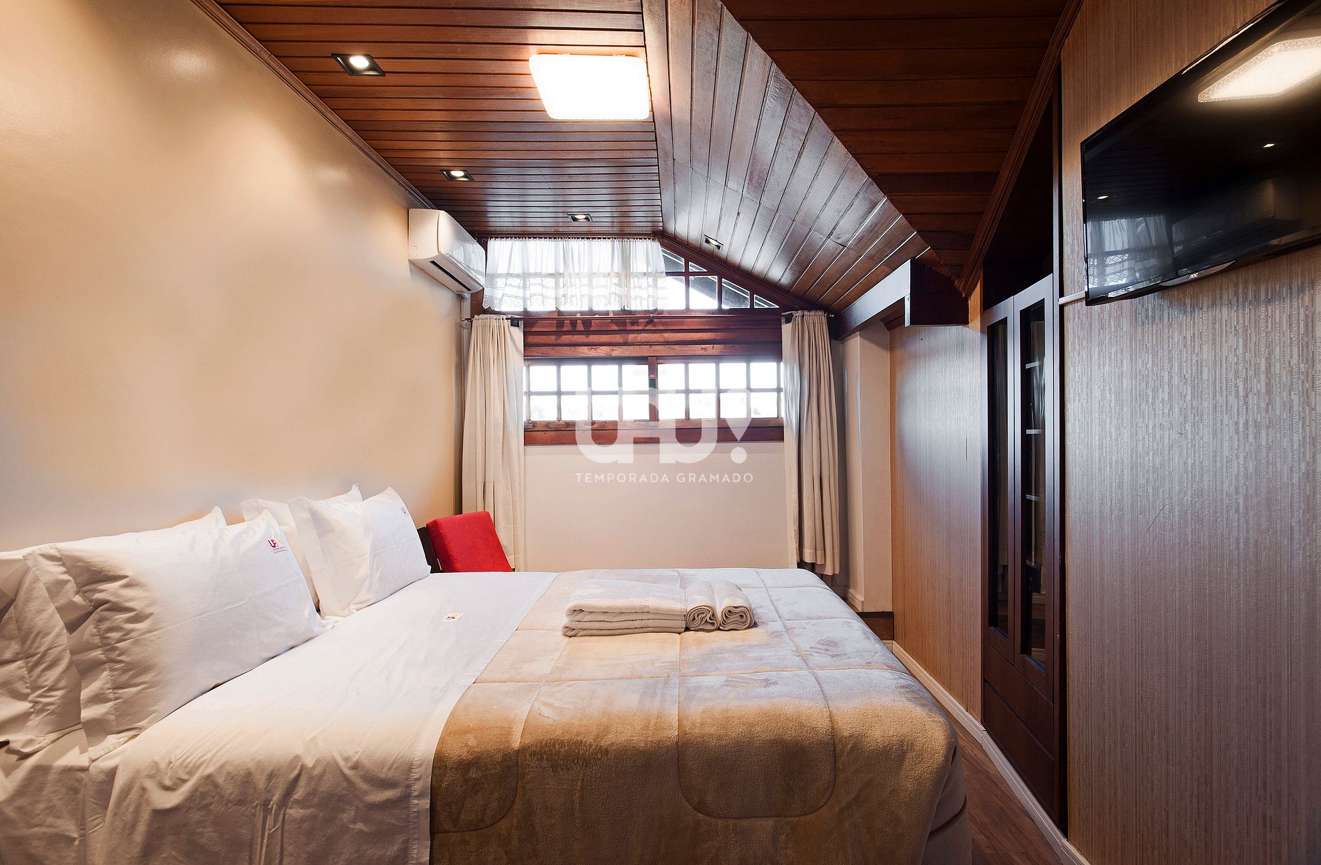 Dormitório com cama Queen Size, 2 camas auxiliares, SmartTV 32', split q/f e rouparia completa;