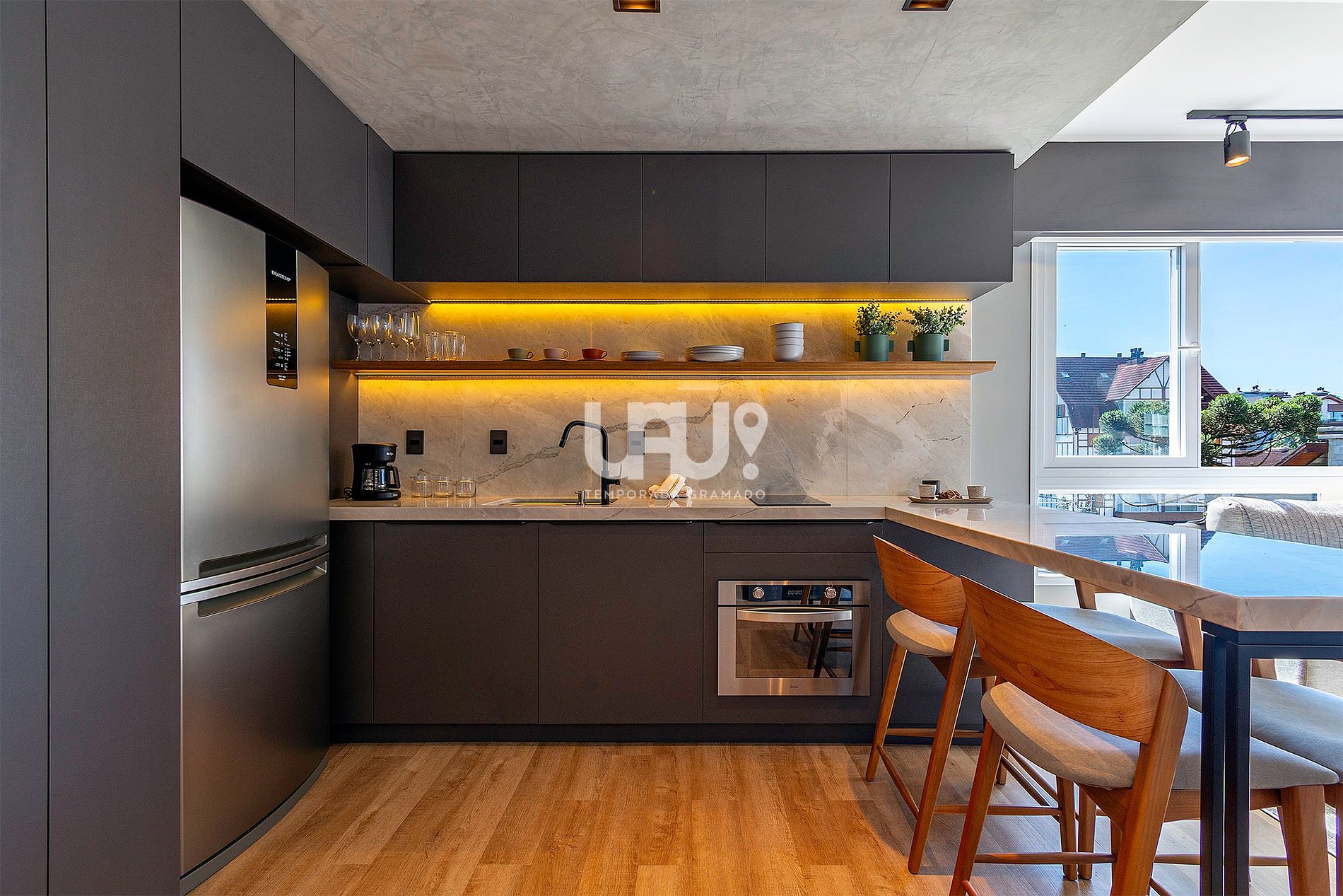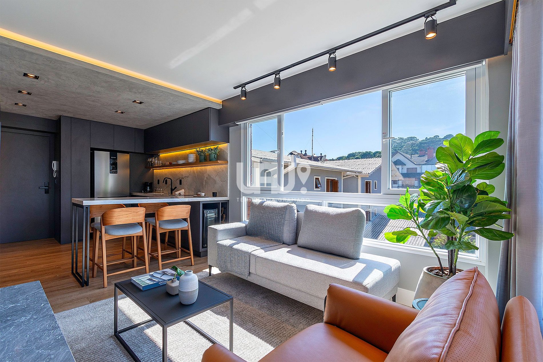 Living integrado com cozinha estilo americano totalmente equipada, bancada com 4 lugares e sofá cama ;