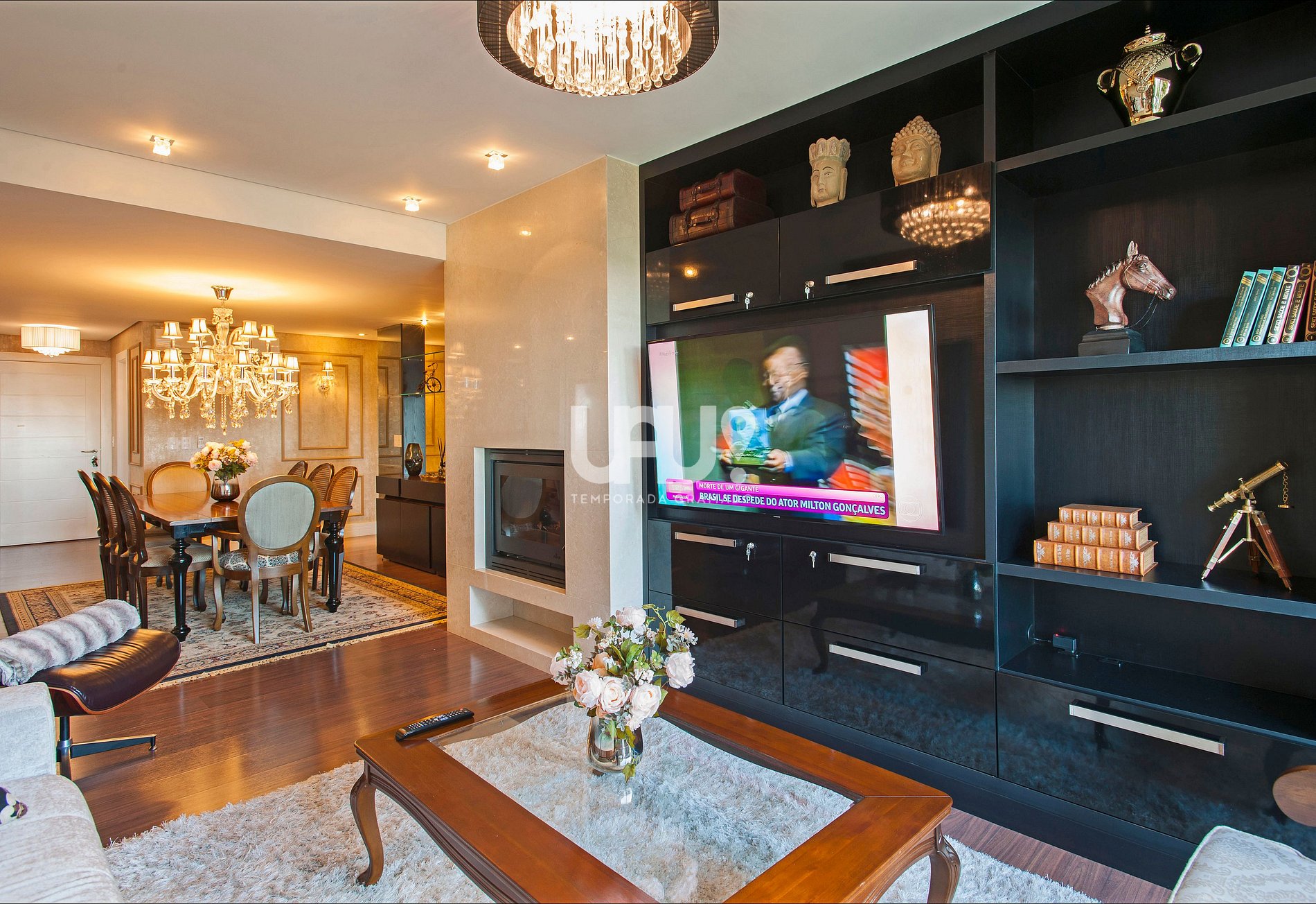 Apartamento com amplo Living em 3 ambientes com mesa de jantar para 8 pessoas, confortáveis sofás e poltronas, SmartTV 60’, Split Q/F, estufa à lenha, deslumbrante decoração e linda vista para o Vale do Quilombo;