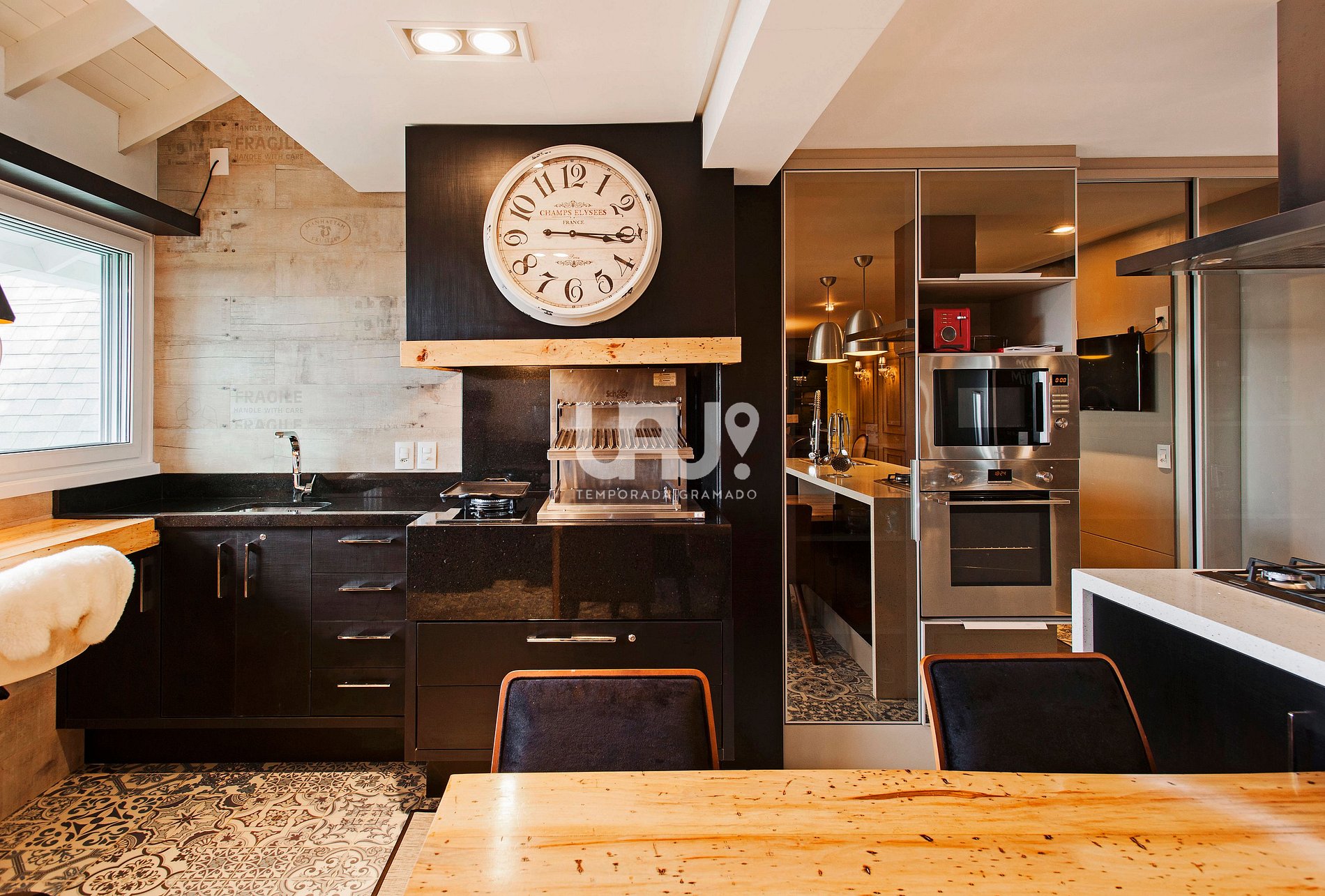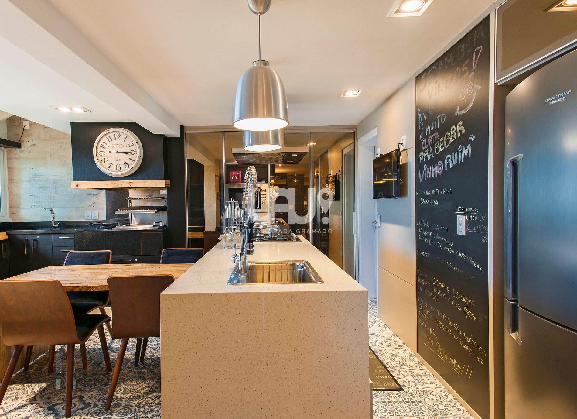 Cozinha em estilo americano totalmente equipada, com churrasqueira tipo “parrilla”, cervejeira, adega climatizada, mesa para 4 pessoas e bancada com vista para o Vale do Quilombo;