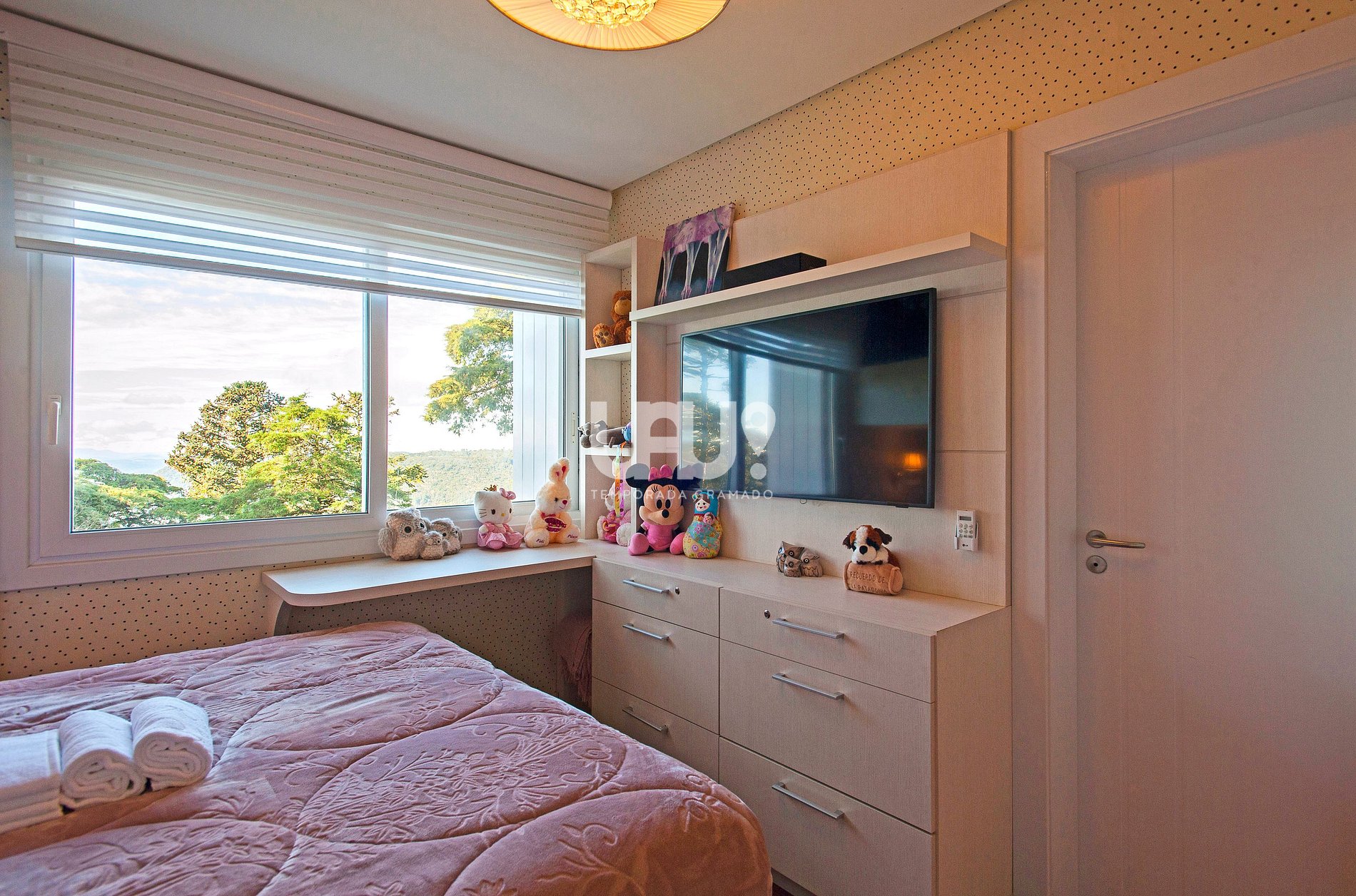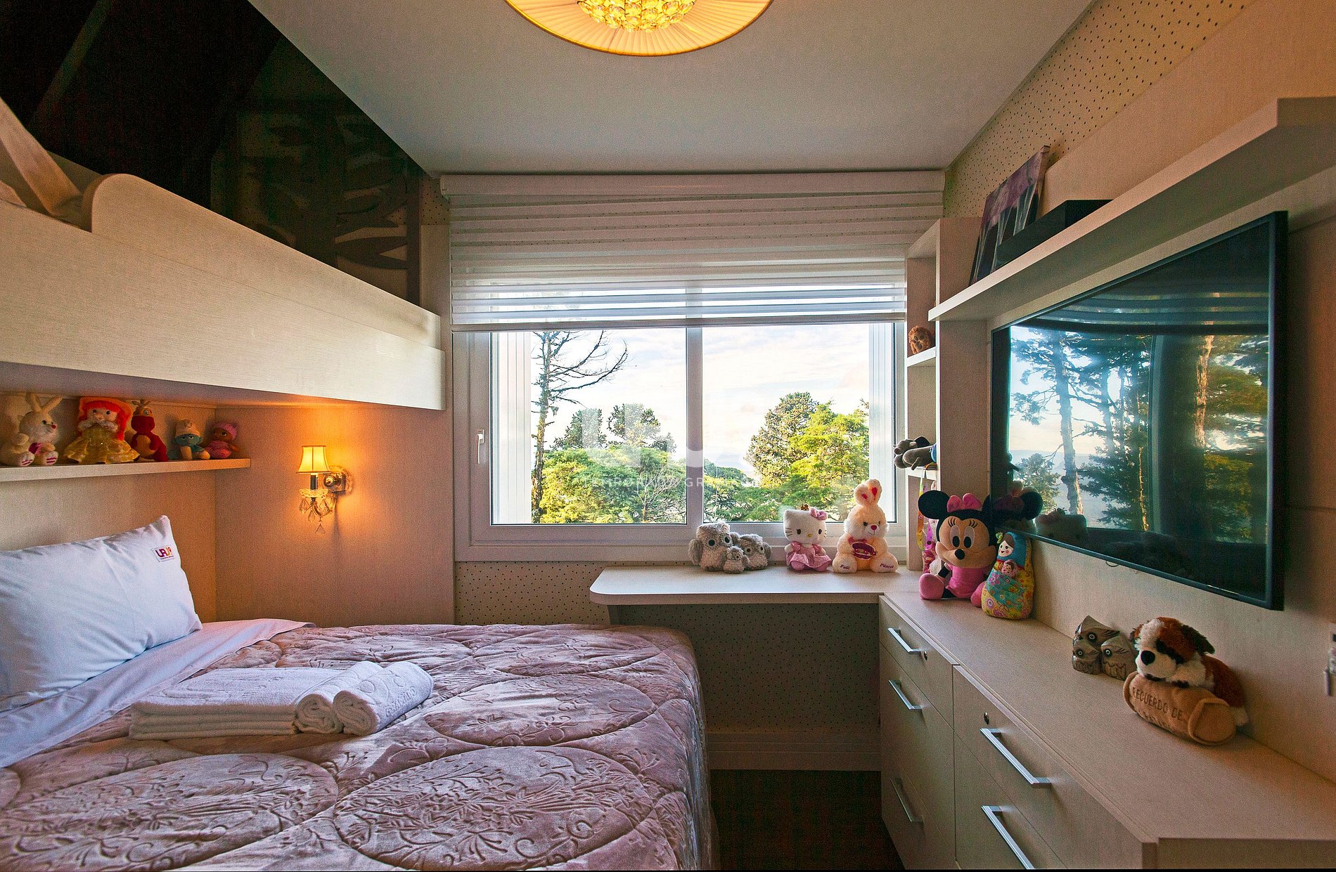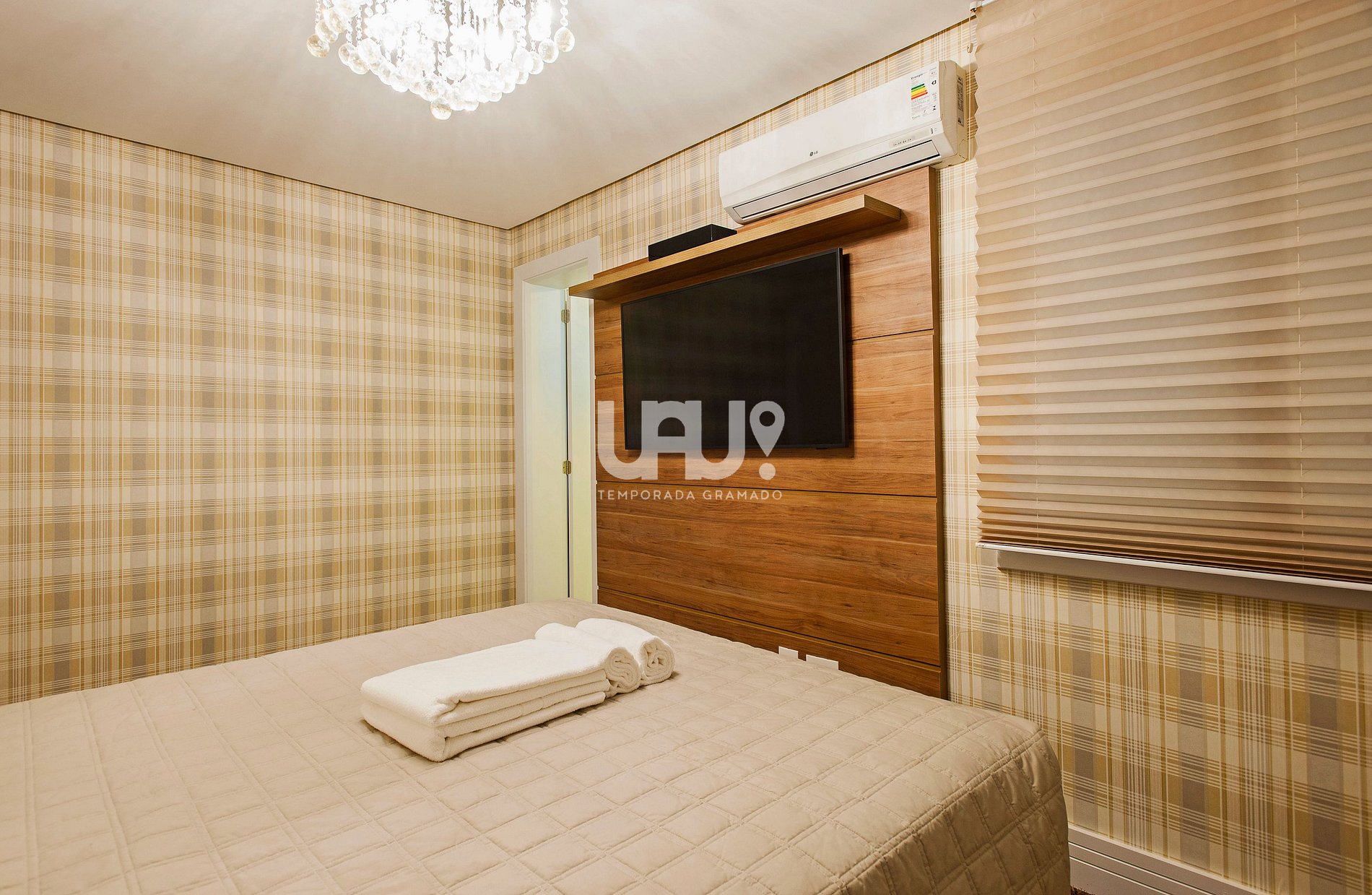 Suíte com cama Queen Size, beliche com cama de solteiro, cama auxiliar, rouparia completa, SmartTV e Split Q/F;