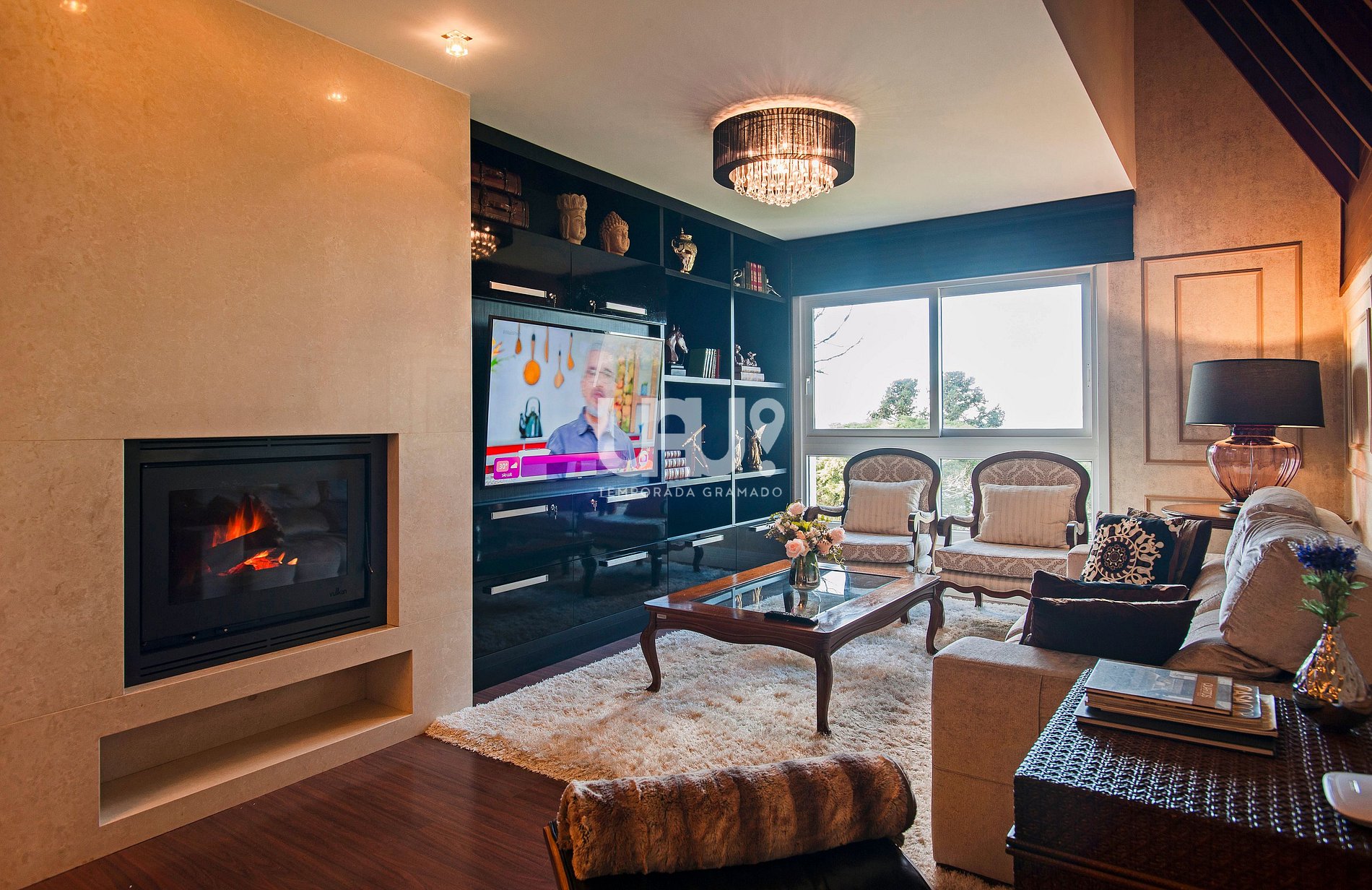 Apartamento com amplo Living em 3 ambientes com mesa de jantar para 8 pessoas, confortáveis sofás e poltronas, SmartTV 60’, Split Q/F, estufa à lenha, deslumbrante decoração e linda vista para o Vale do Quilombo;