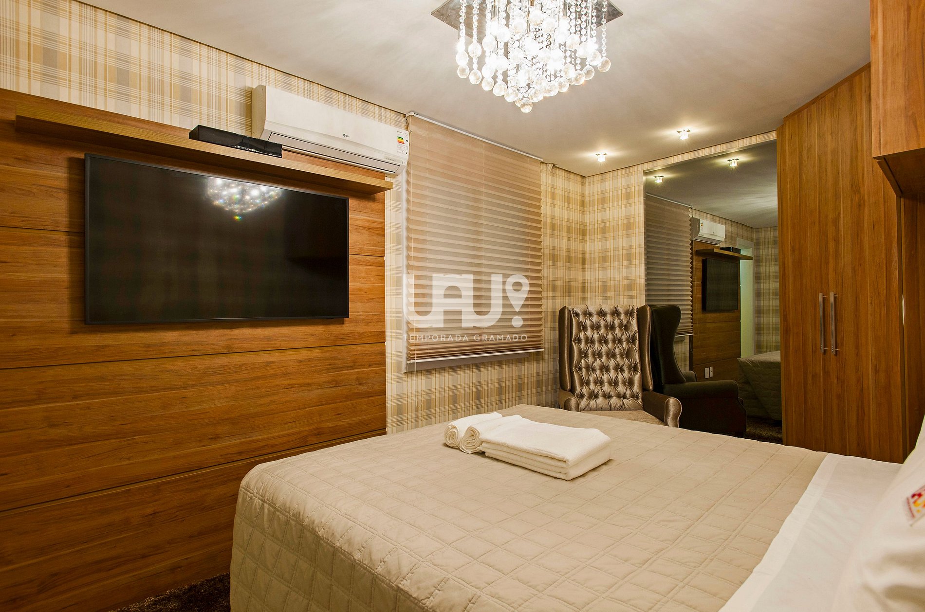 Suíte com cama Queen Size, duas camas auxiliares, rouparia completa, SmartTV e Split Q/F;