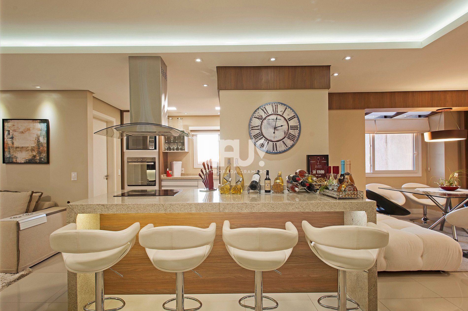 Cozinha em estilo americano totalmente equipada, bancada de apoio para 4 pessoas, utensílios e eletrodomésticos;