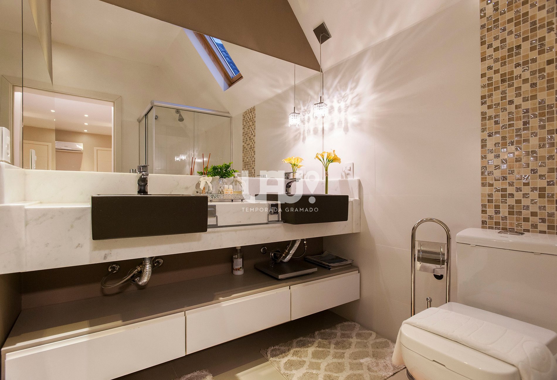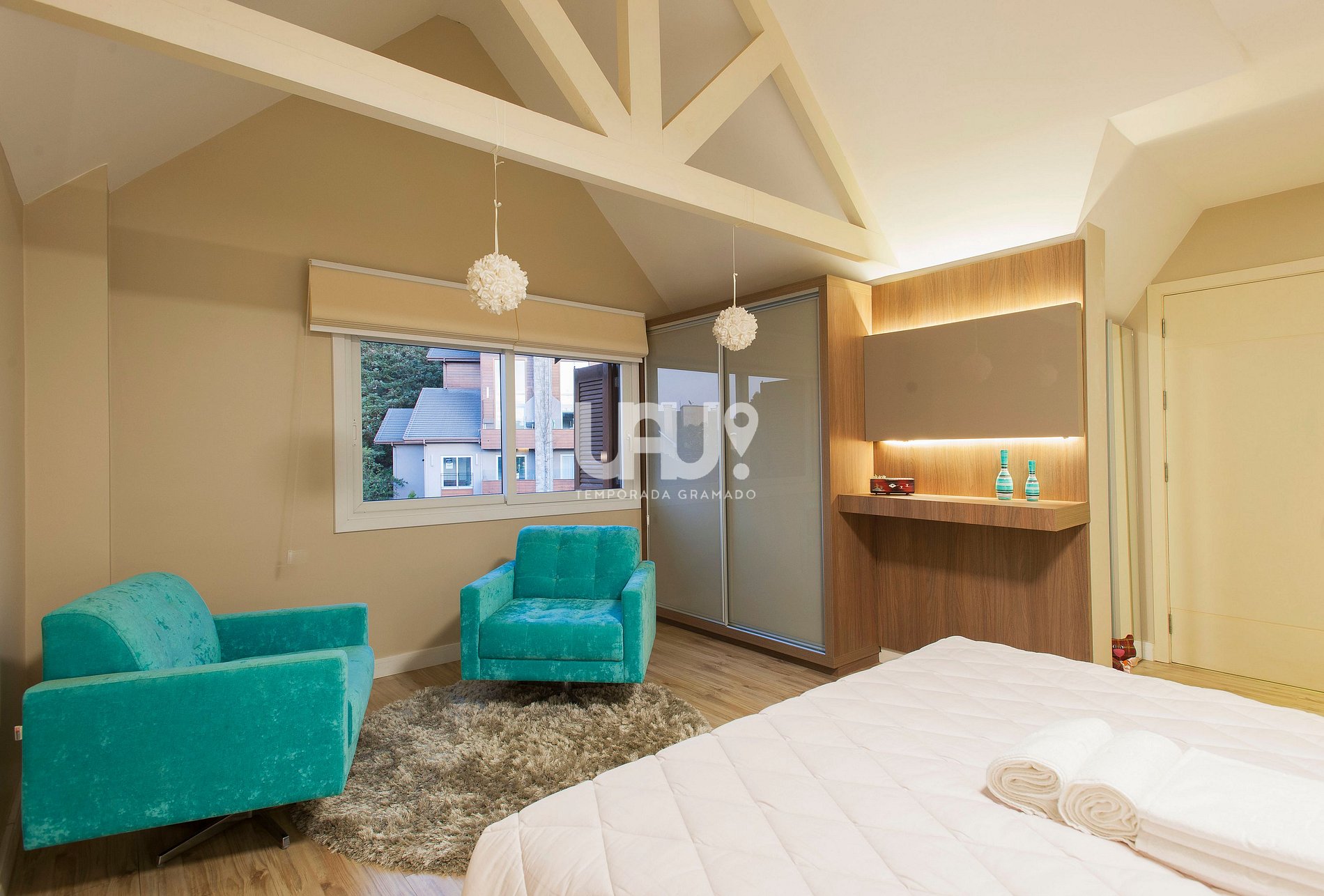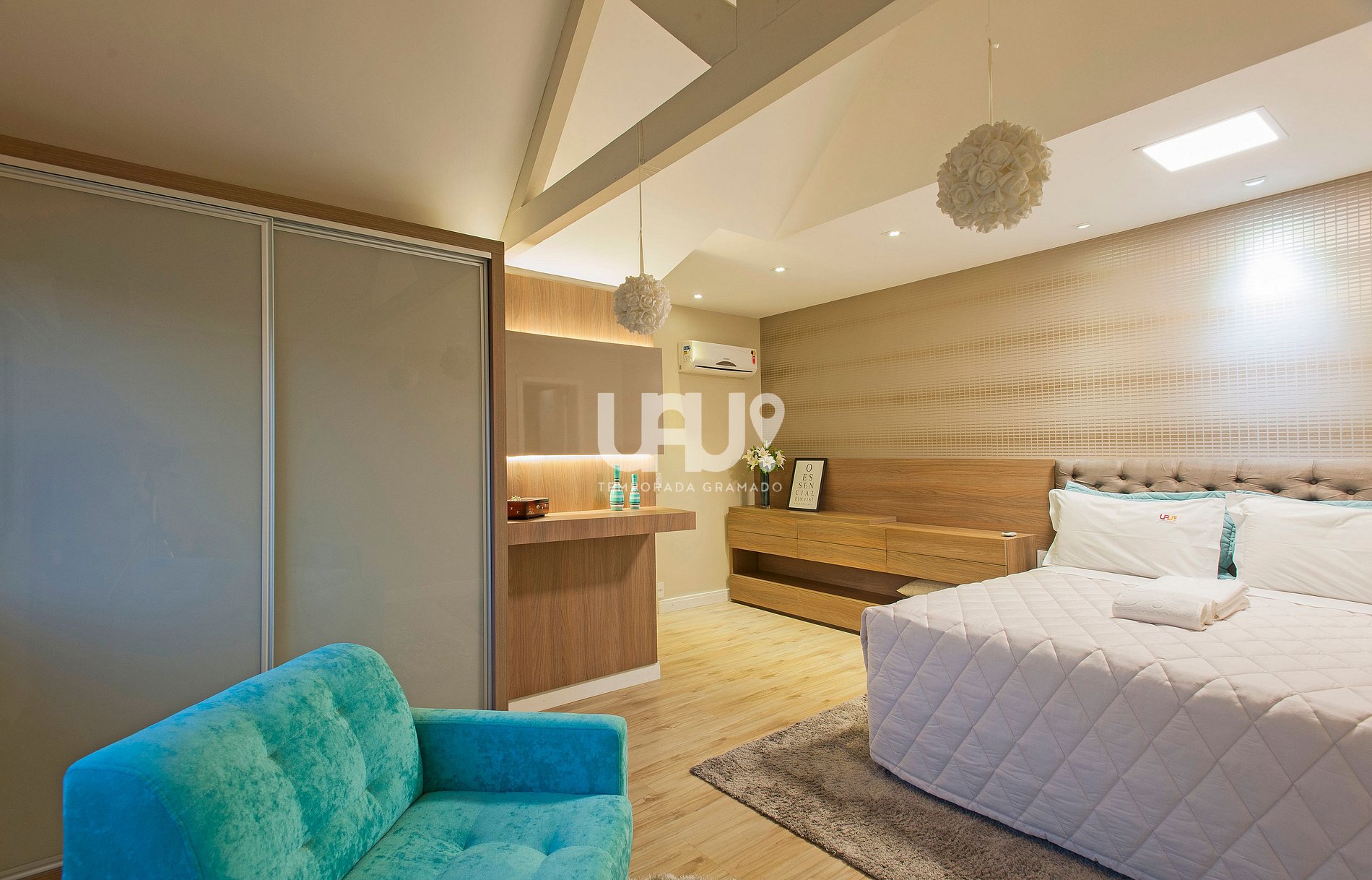 Suíte master com cama Queen Size, rouparia completa e Split Q/F;