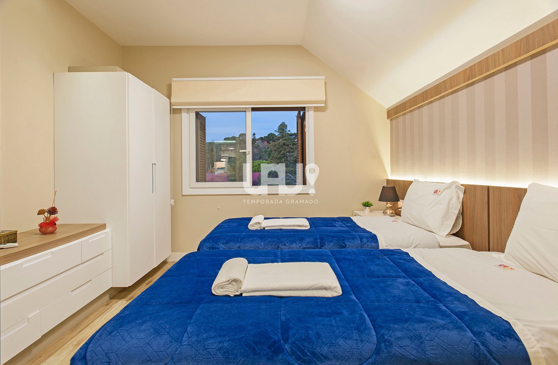Suíte com duas camas de solteiro (que, unidas, formam outra tamanho Queen Size), rouparia completa e Split Q/F;