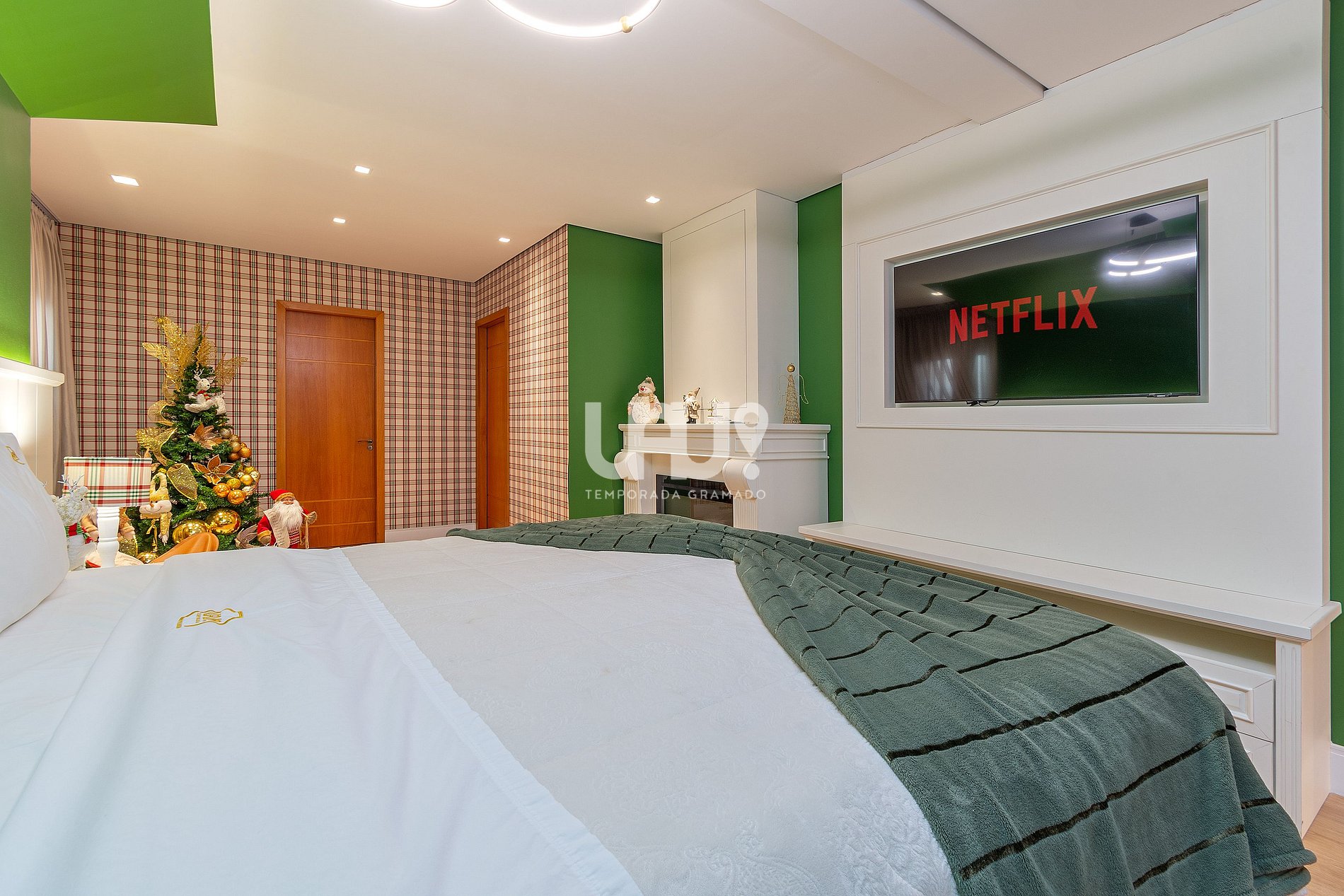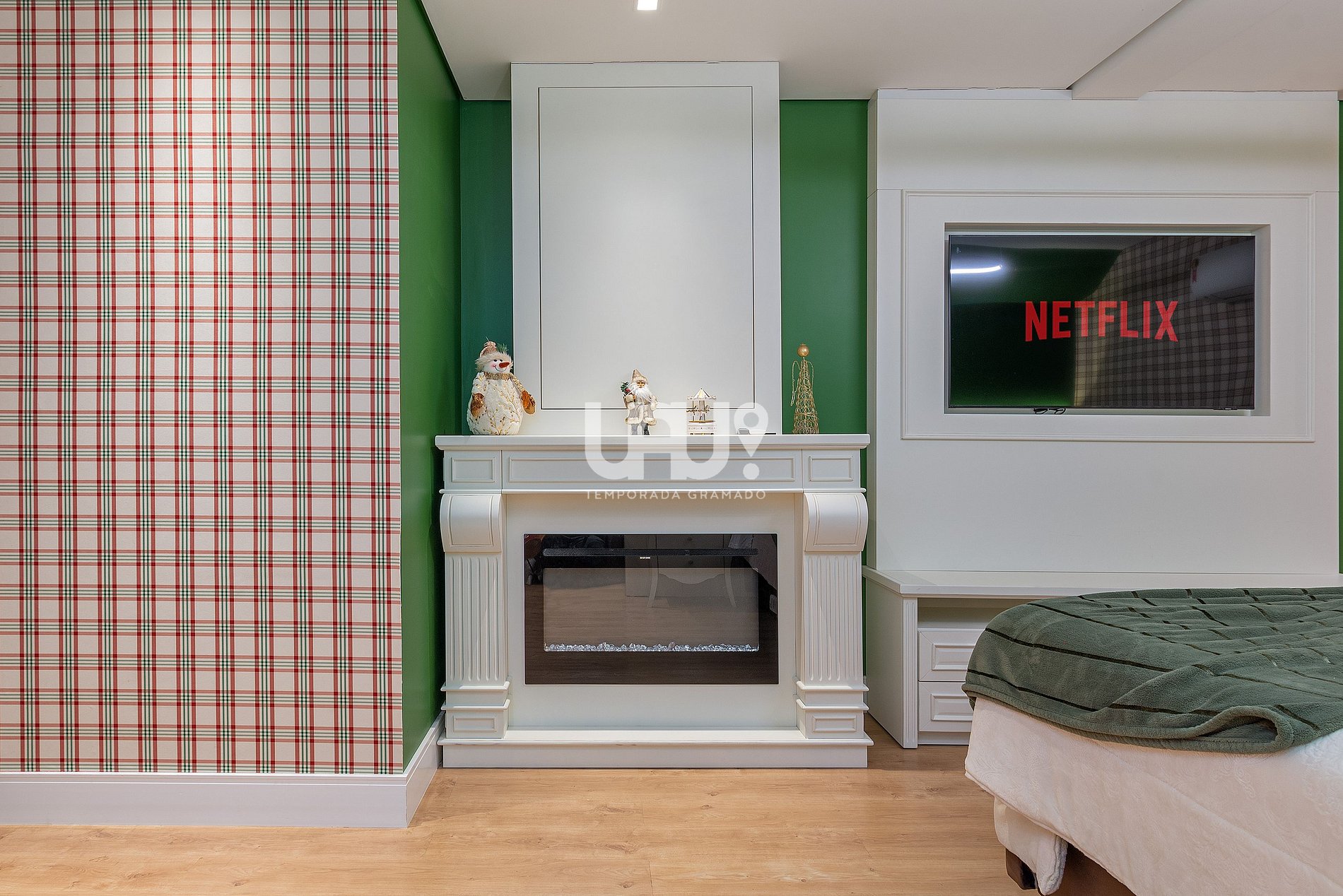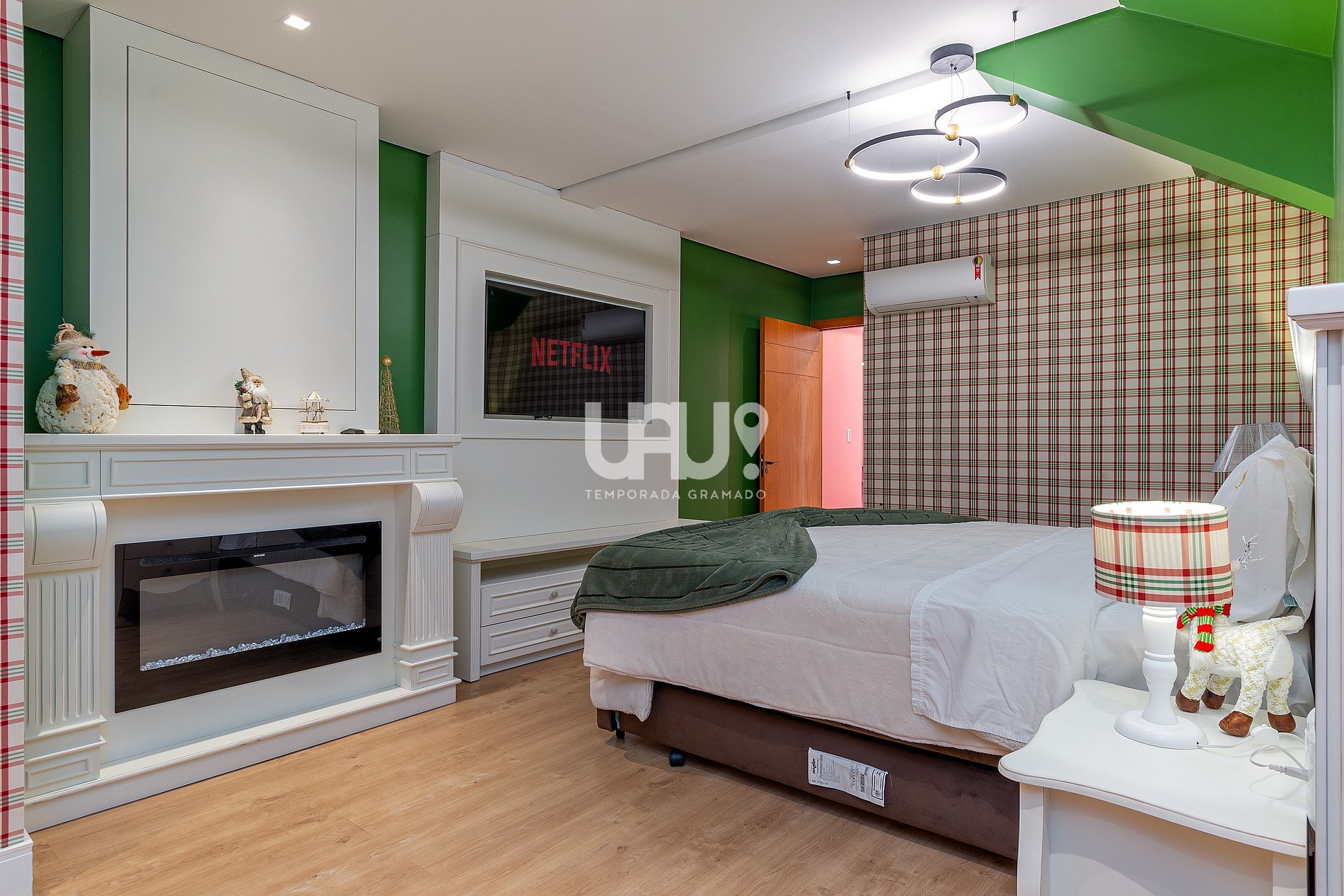 Cama King Size, (2) camas auxiliares, lareira elétrica, SmartTV 55', sala de esta onde é Natal o ano todo, closet e banheiro completo, com ducha e banheira hidromassagem para 2 pessoas...