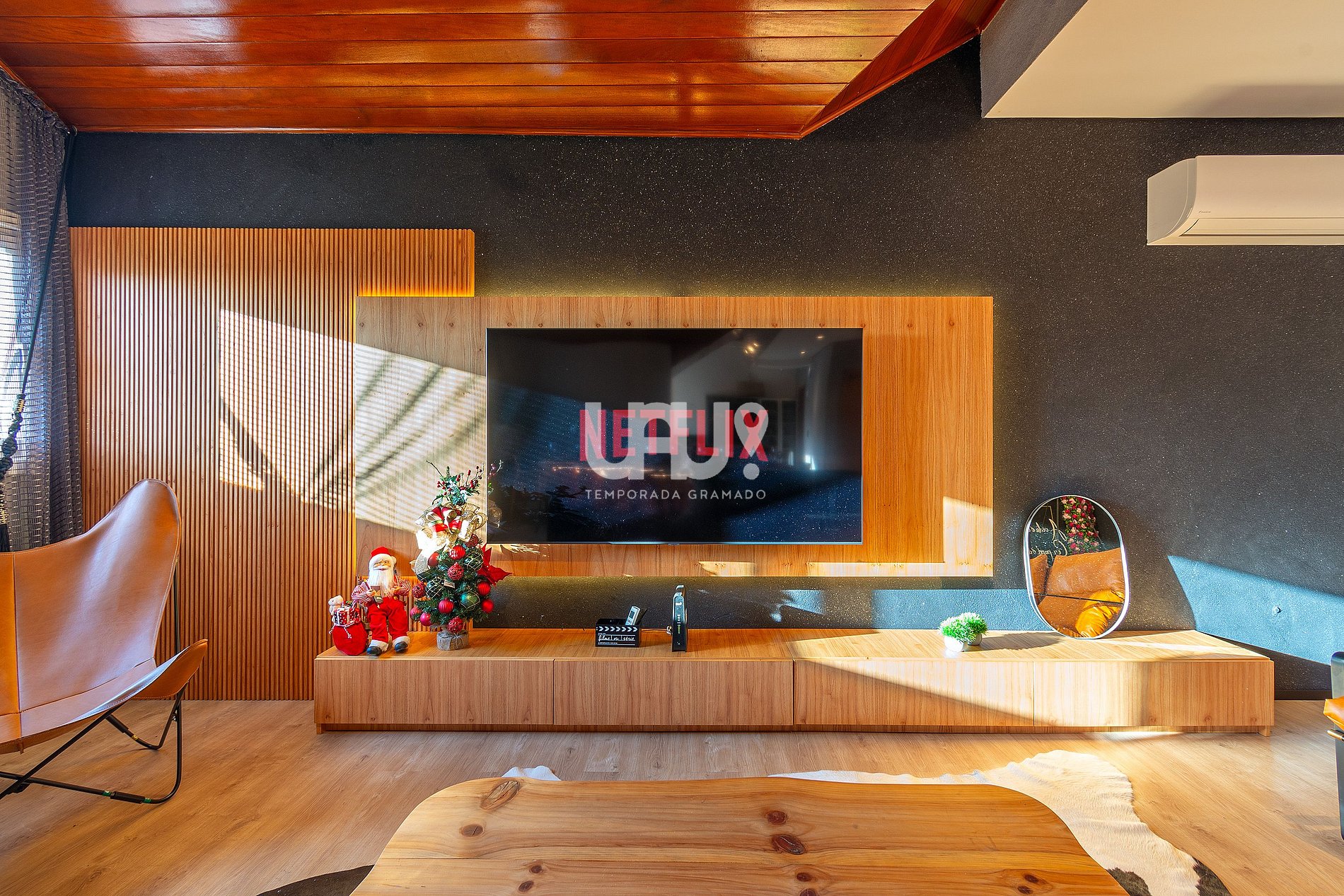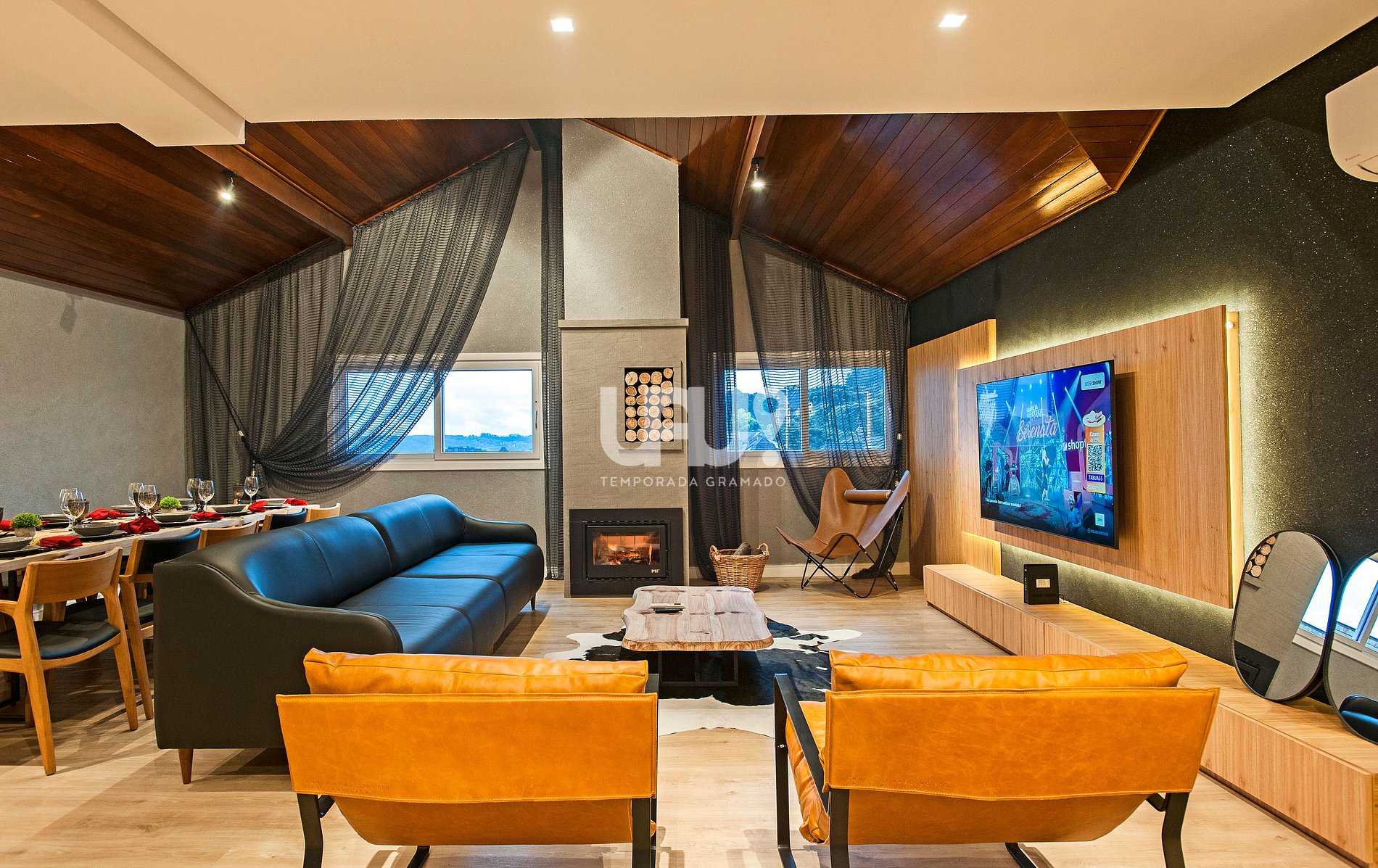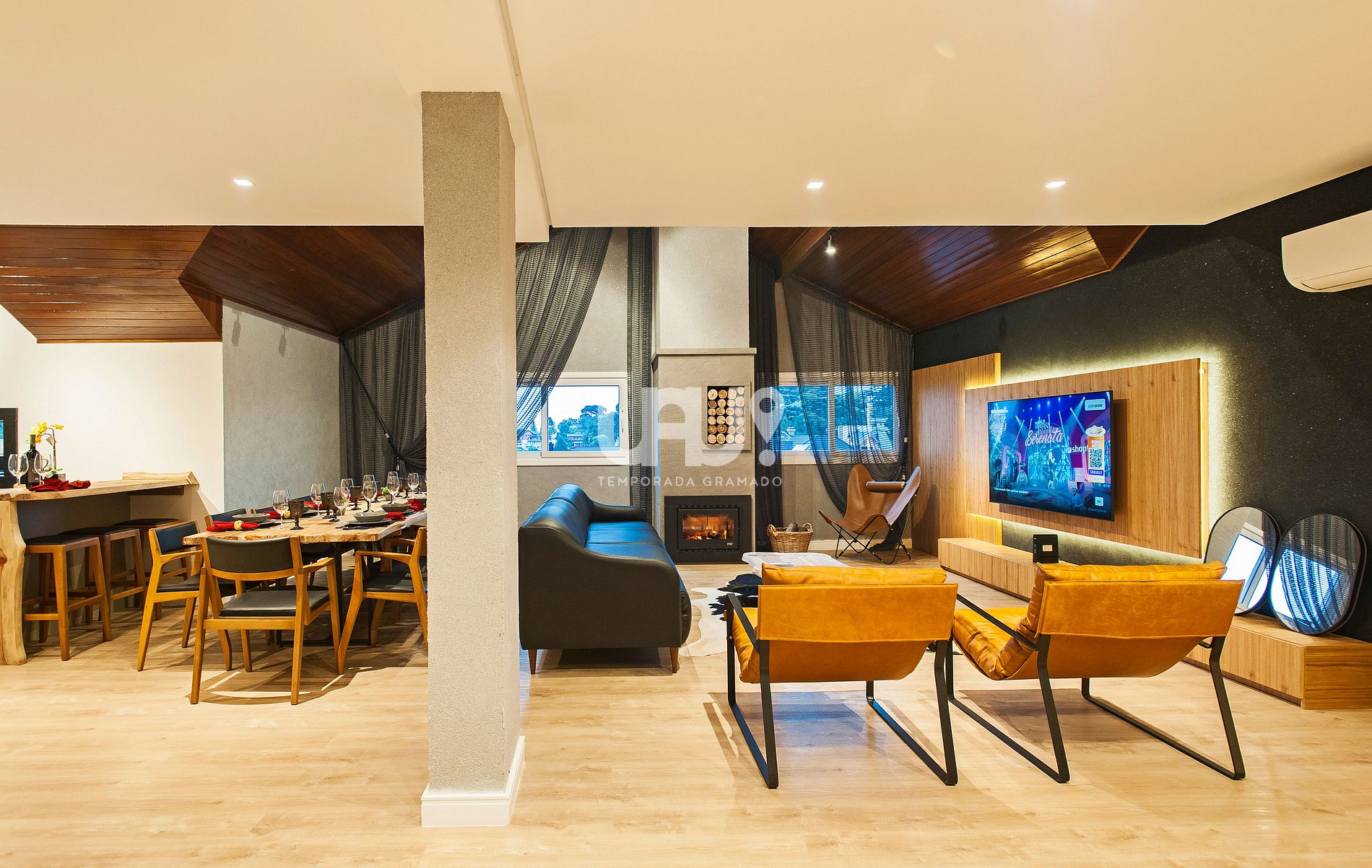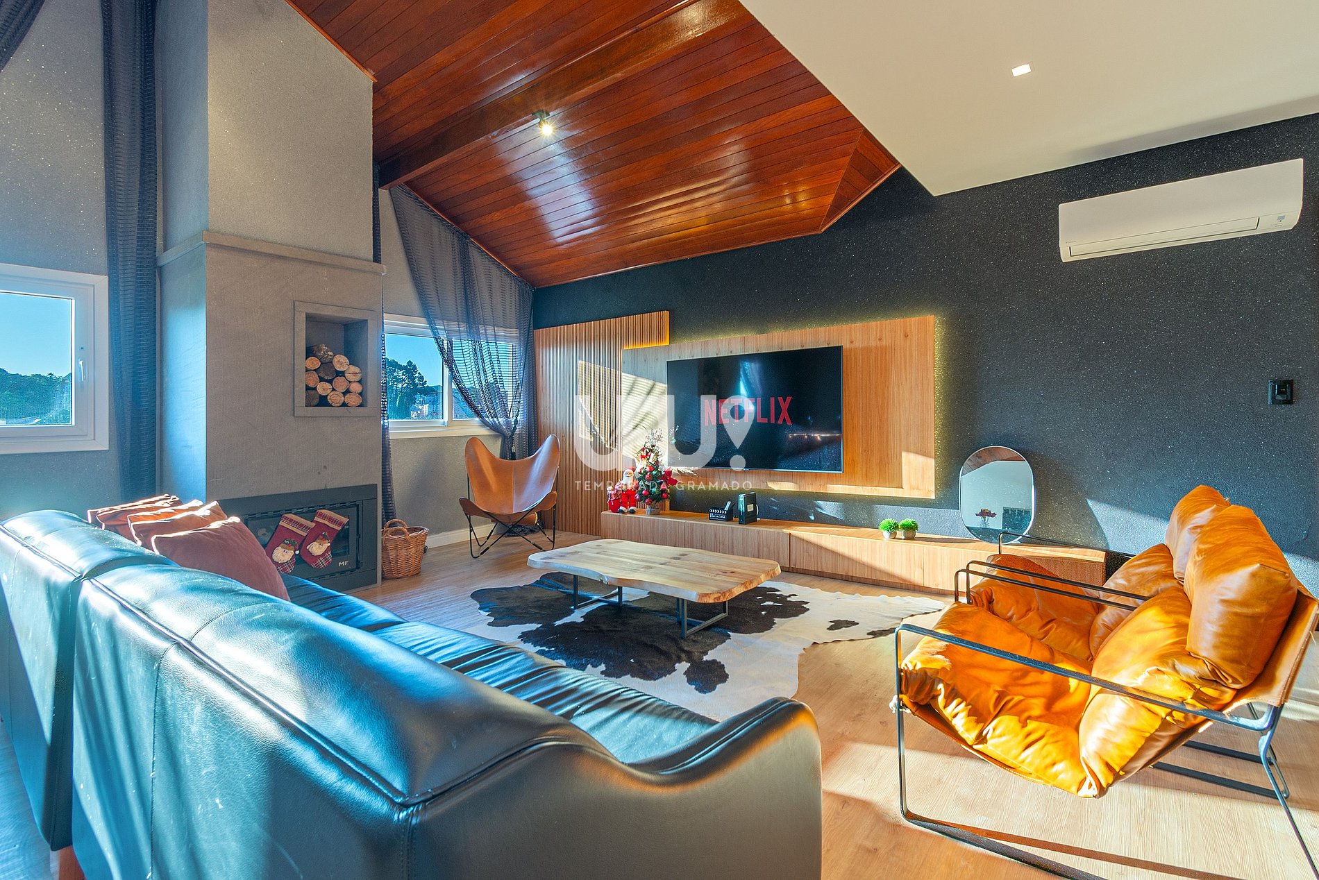 Ampla sala de estar com estufa a lenha, SmartTV 70' com Sky, "Sala do Diretor" personalizada com pintura assinada e equipamentos de cinema, jantar para até 12 pessoas, adega climatizada, frigobar...