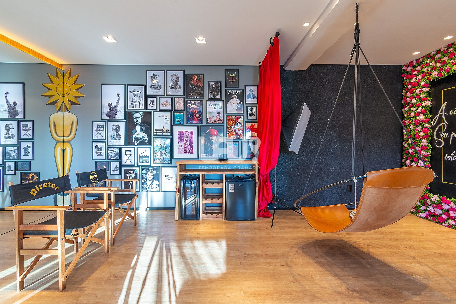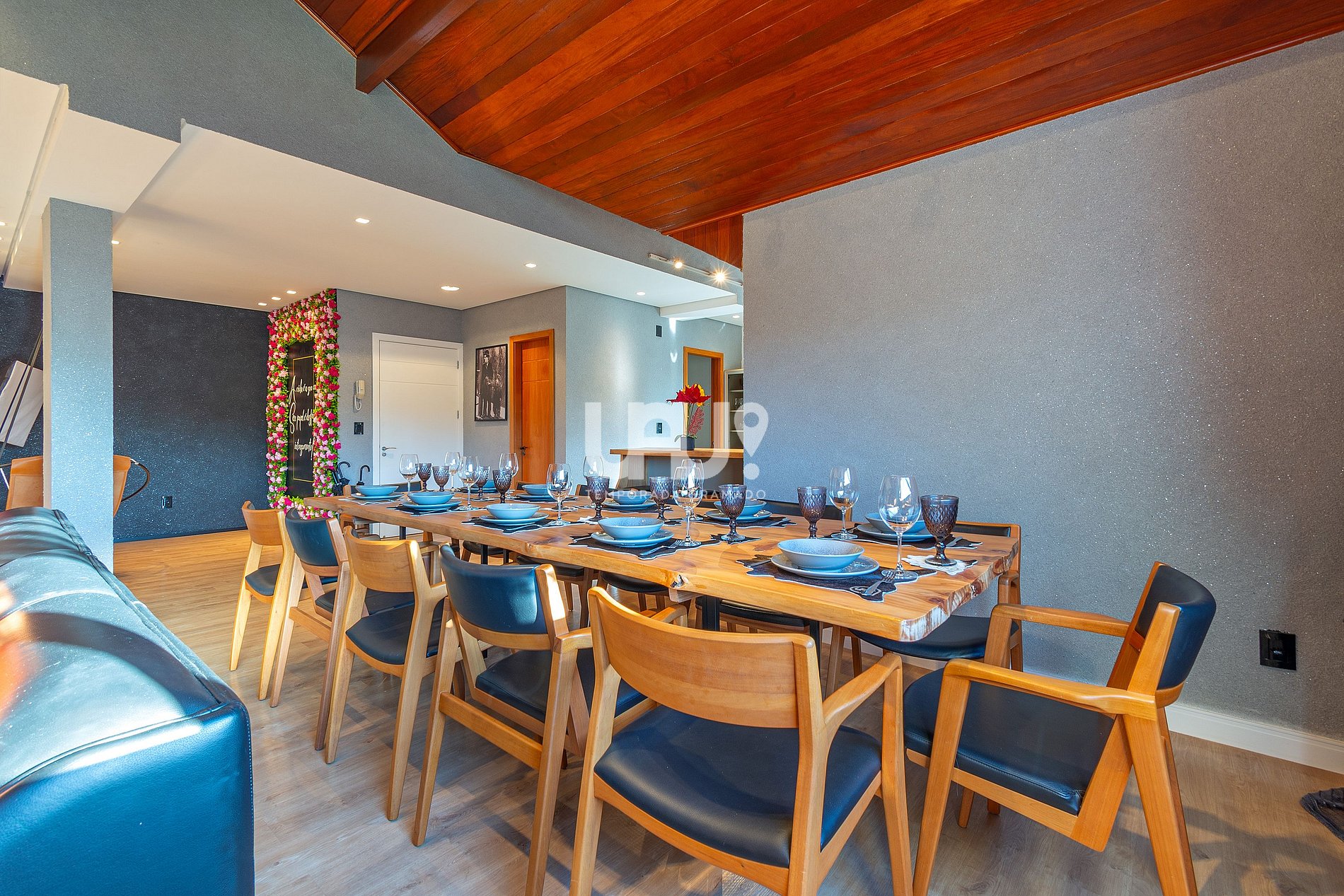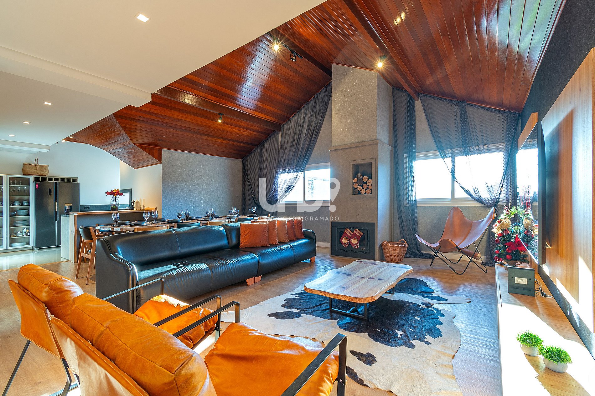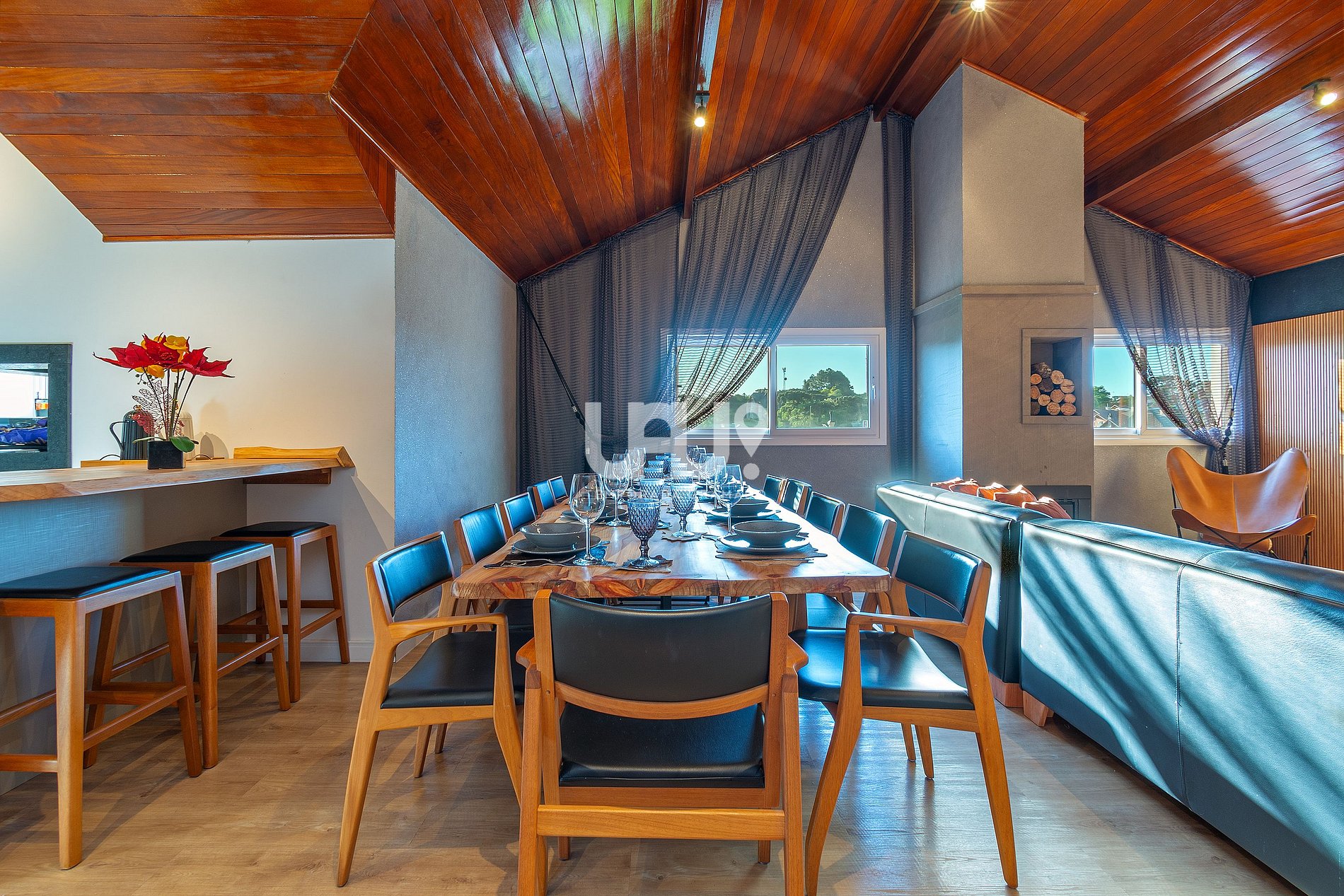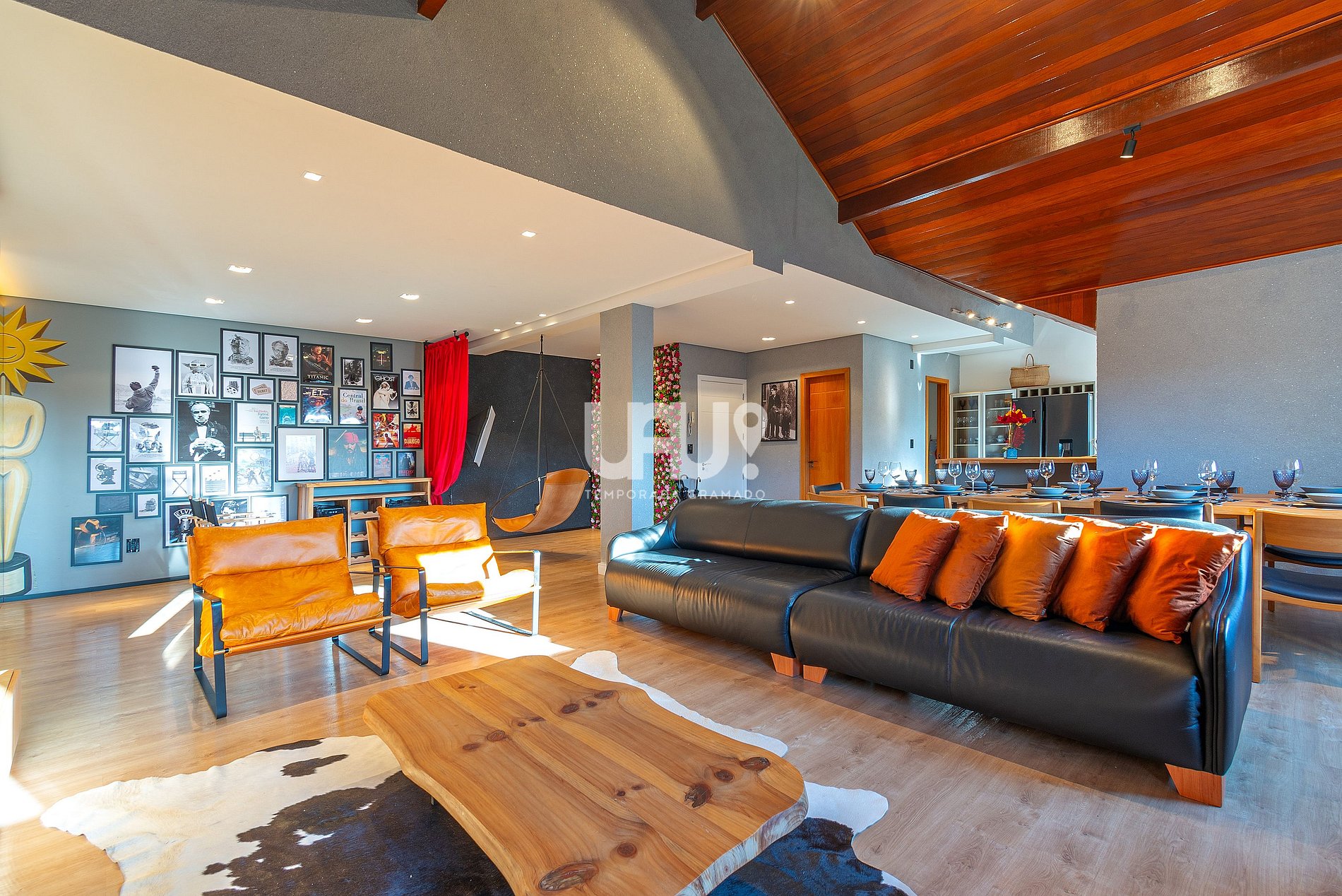 Ampla sala de estar com estufa a lenha, SmartTV 70' com Sky, "Sala do Diretor" personalizada com pintura assinada e equipamentos de cinema, jantar para até 12 pessoas, adega climatizada, frigobar...