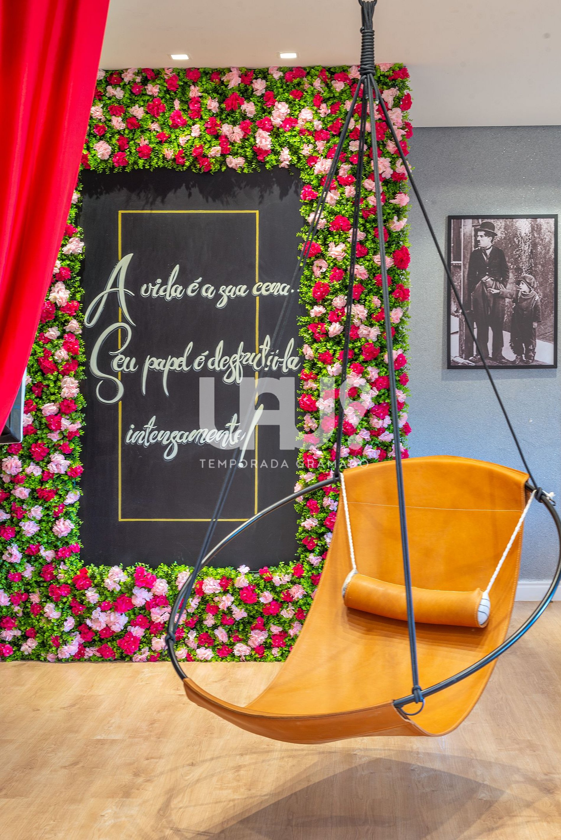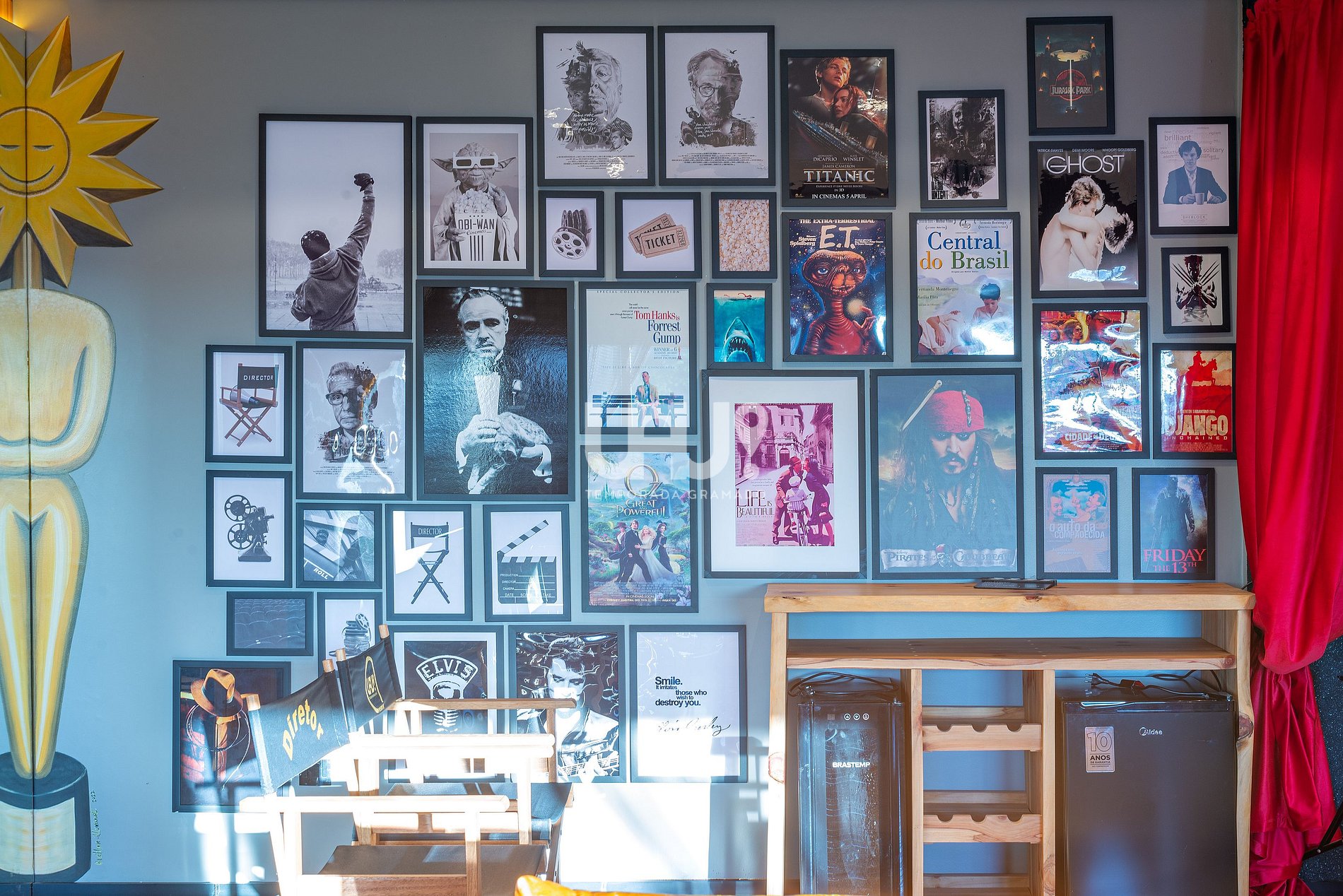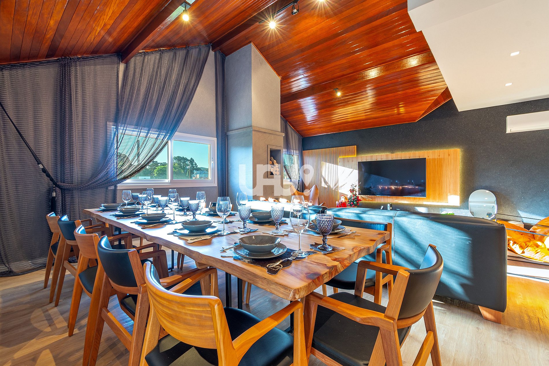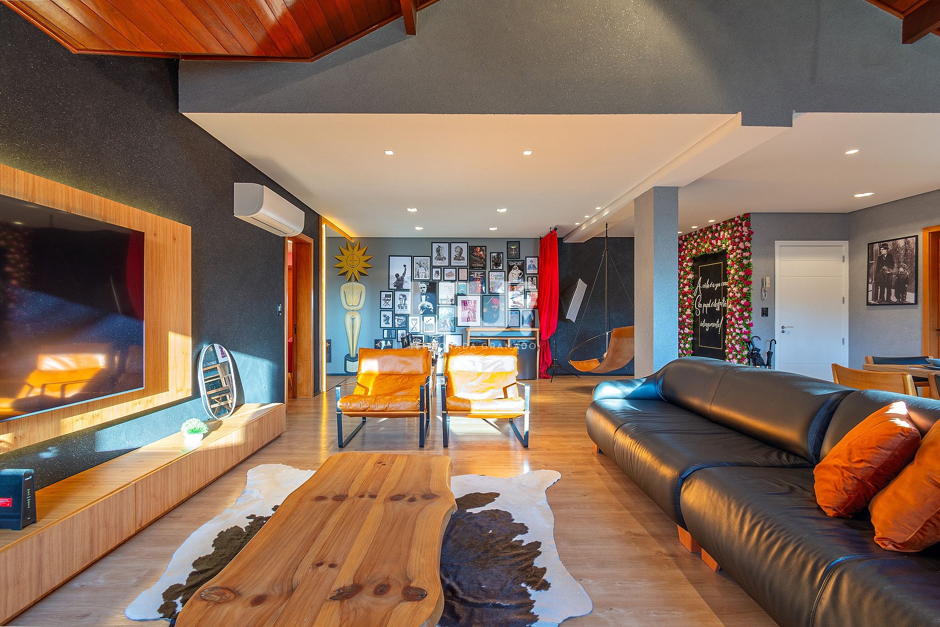 Ampla sala de estar com estufa a lenha, SmartTV 70' com Sky, "Sala do Diretor" personalizada com pintura assinada e equipamentos de cinema, jantar para até 12 pessoas, adega climatizada, frigobar...