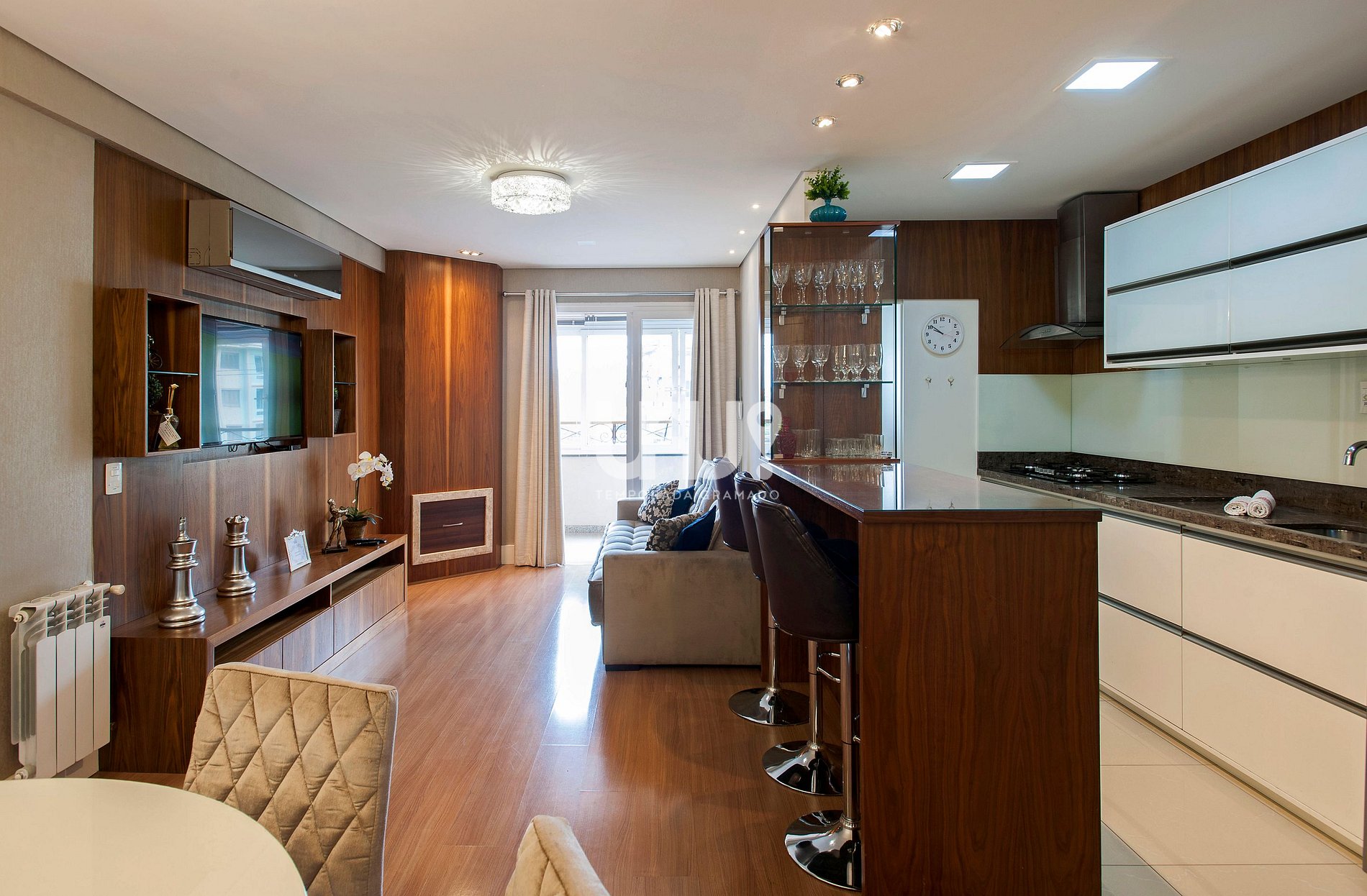 Living em 3 ambientes SmartTV 50', sofá cama, split q/f, lareira, sacada integrada com churrasqueira, de frente para a avenida;