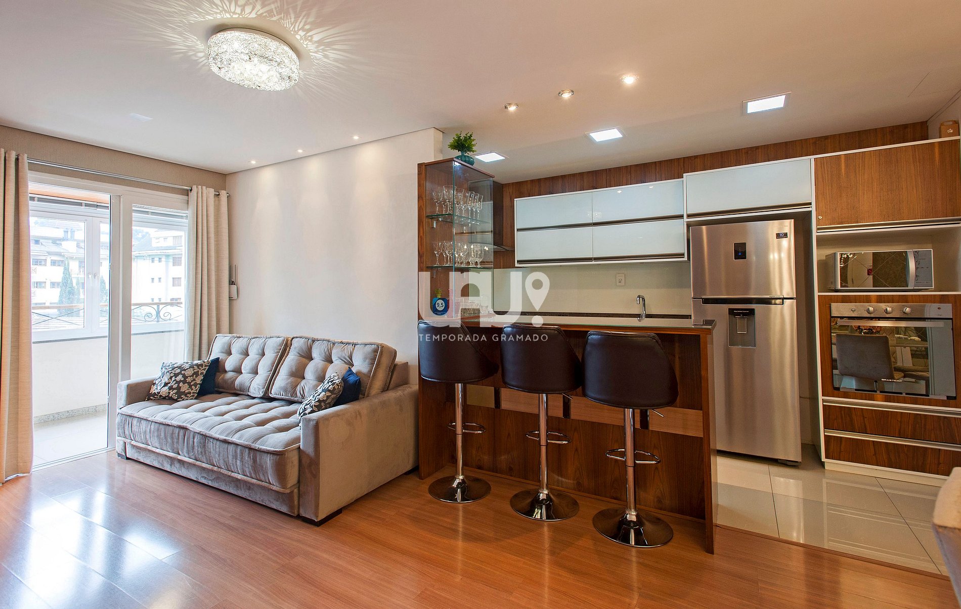 Living em 3 ambientes SmartTV 50', sofá cama, split q/f, lareira, sacada integrada com churrasqueira, de frente para a avenida;