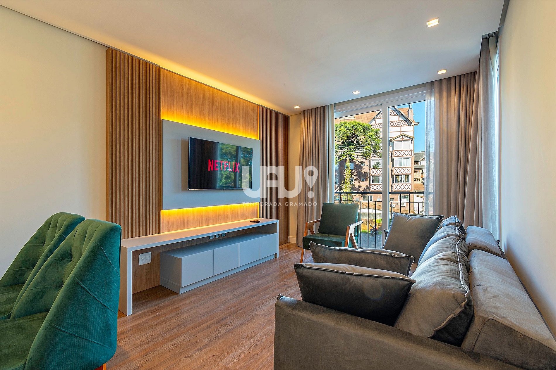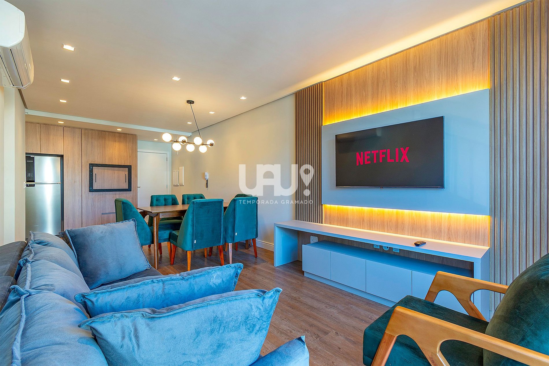 Living em 2 ambientes com jantar para 4 pessoas, confortável sofá cama, SmartTV 60' e split quente e frio;