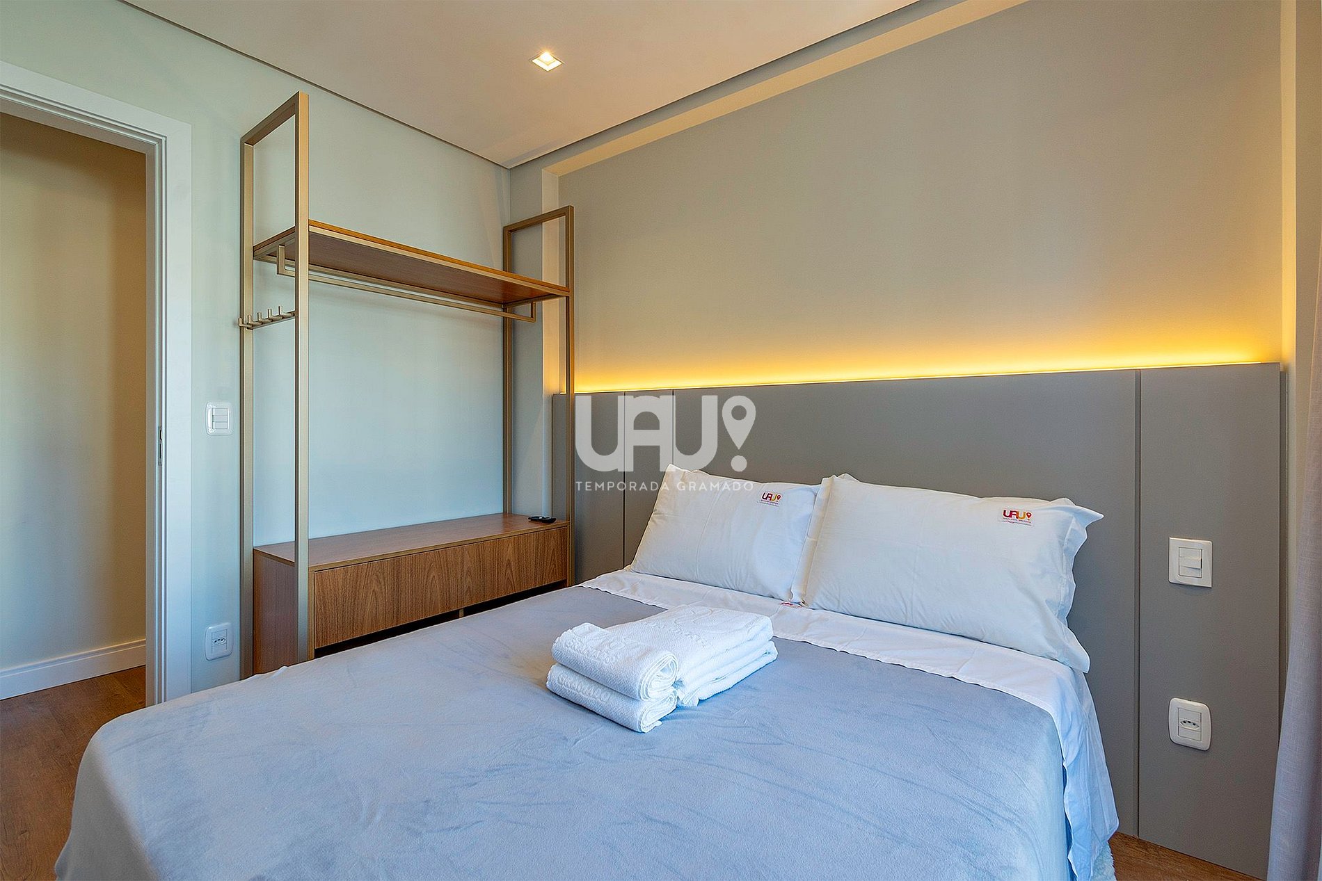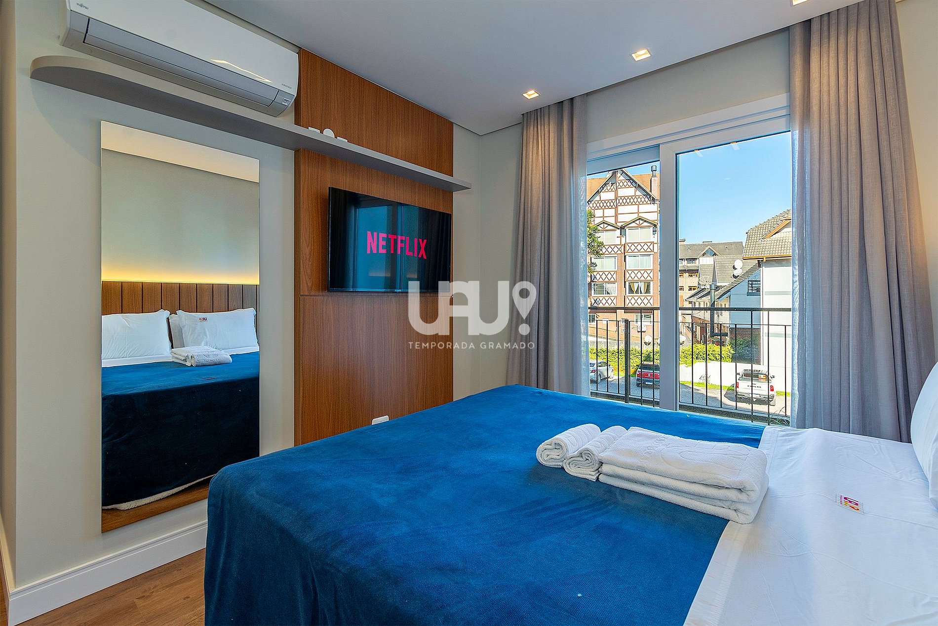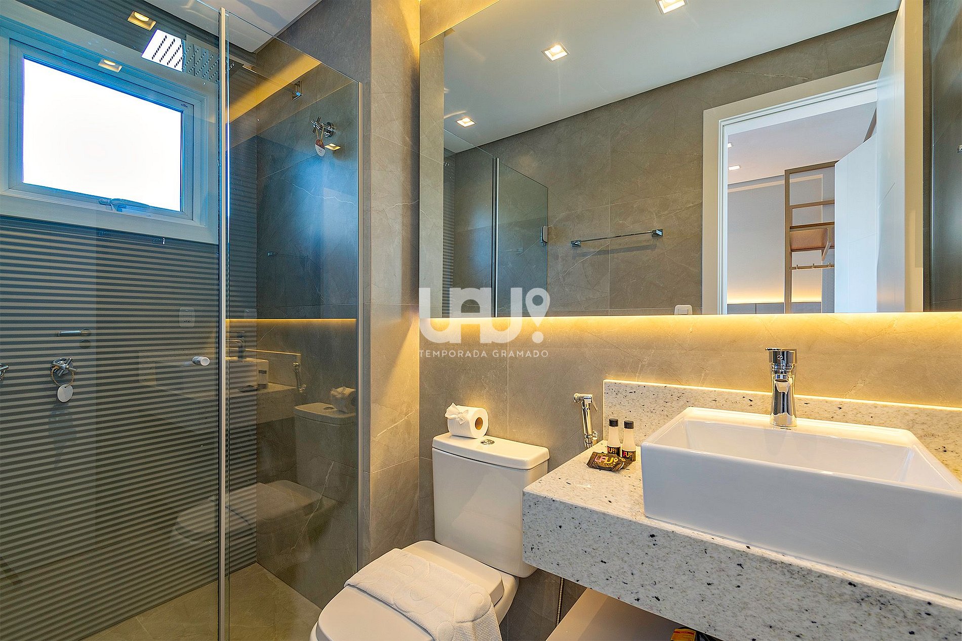 Suíte com cama Queen Size e duas camas auxiliares, rouparia completa, split quente e frio e smartTV; banho completo;