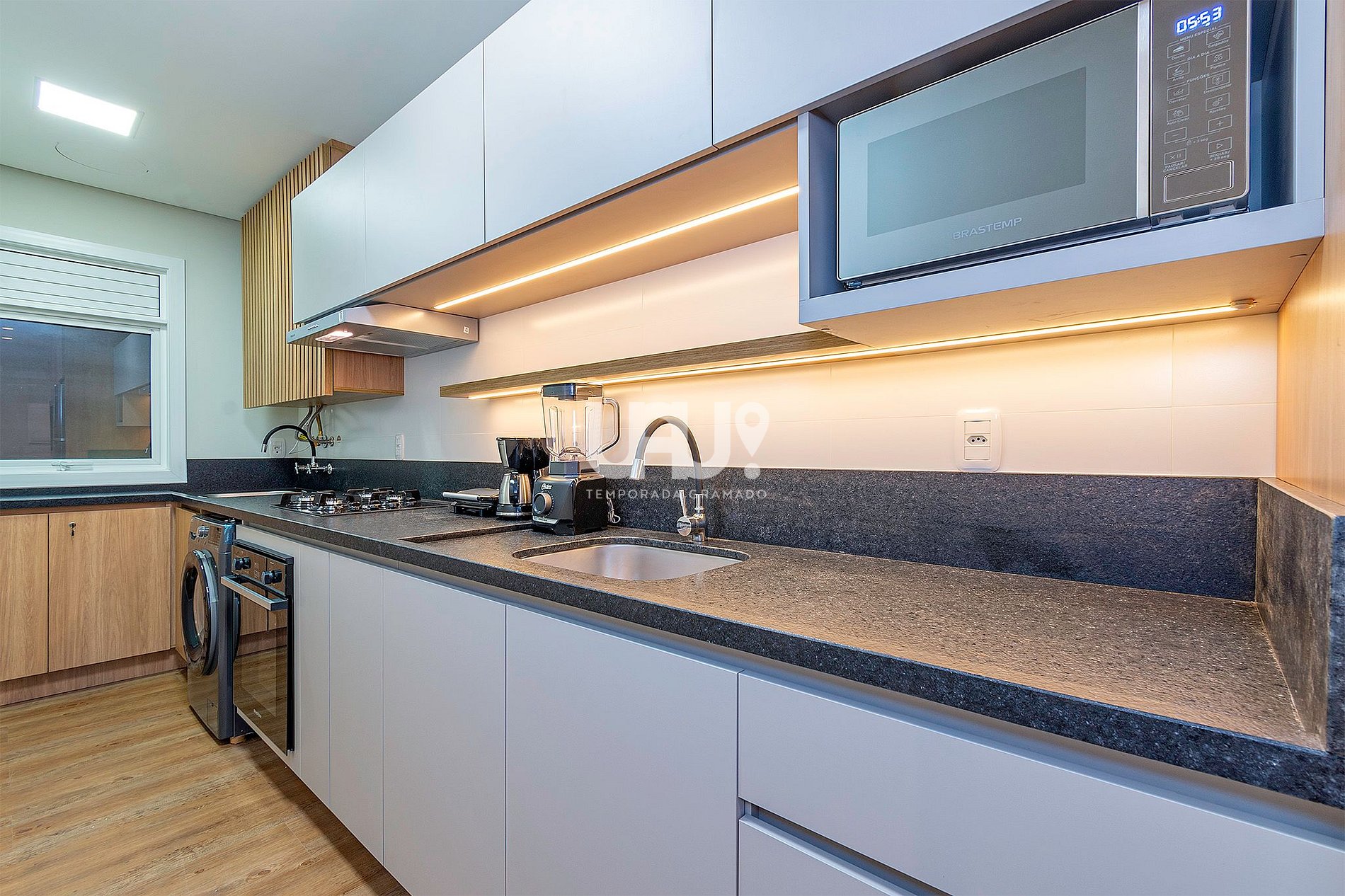 Cozinha completa em estilo americano, com churrasqueira, lavanderia com máquina lava e seca e lavabo.