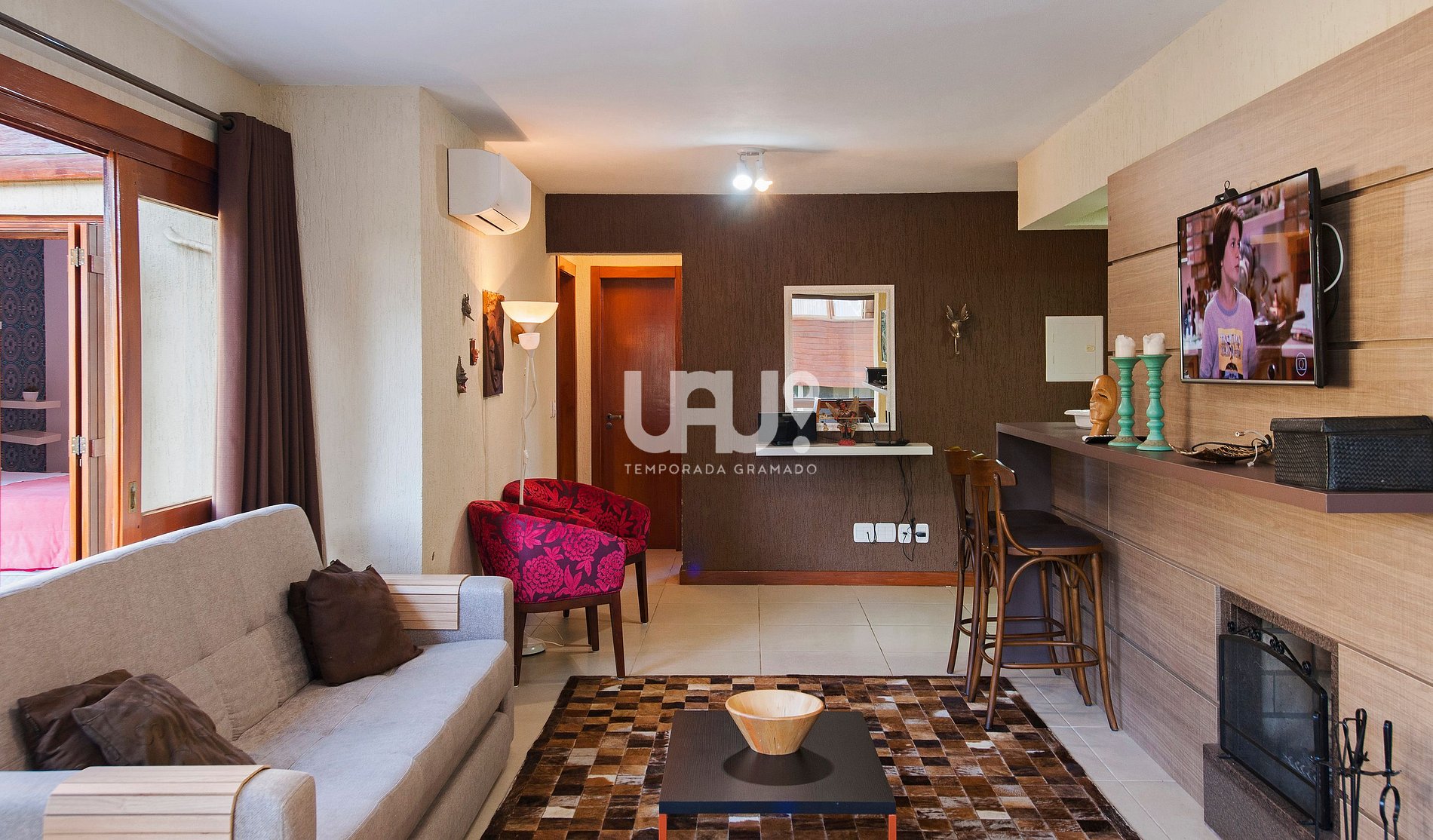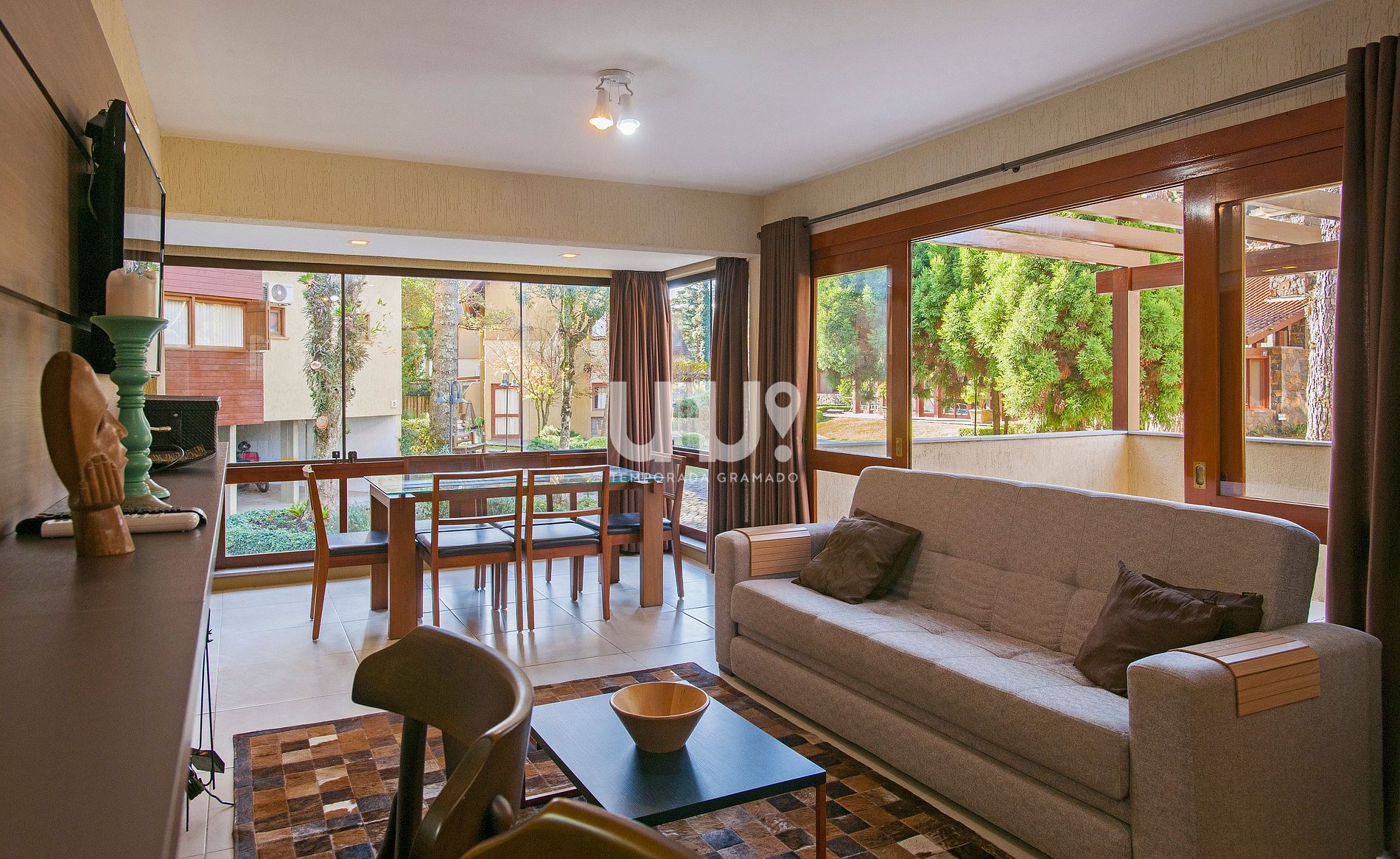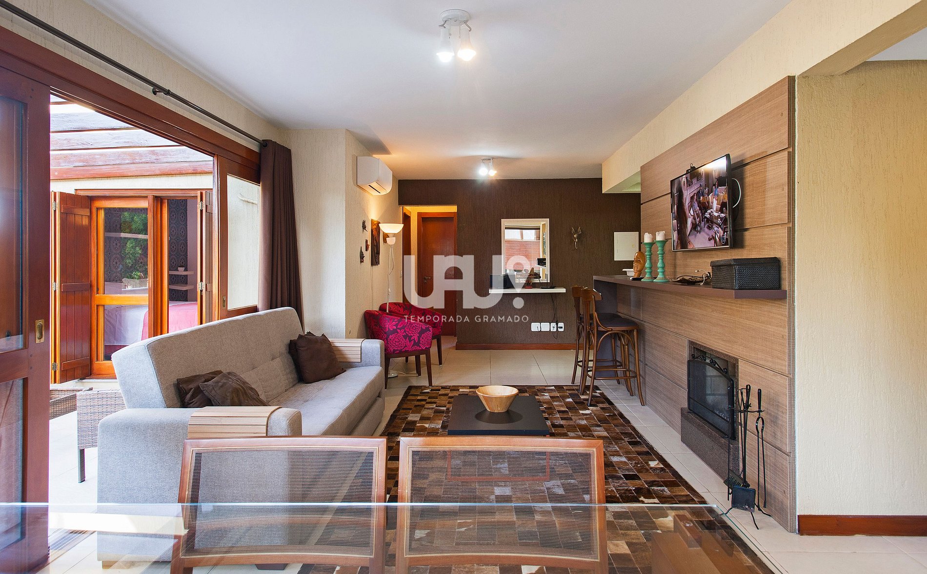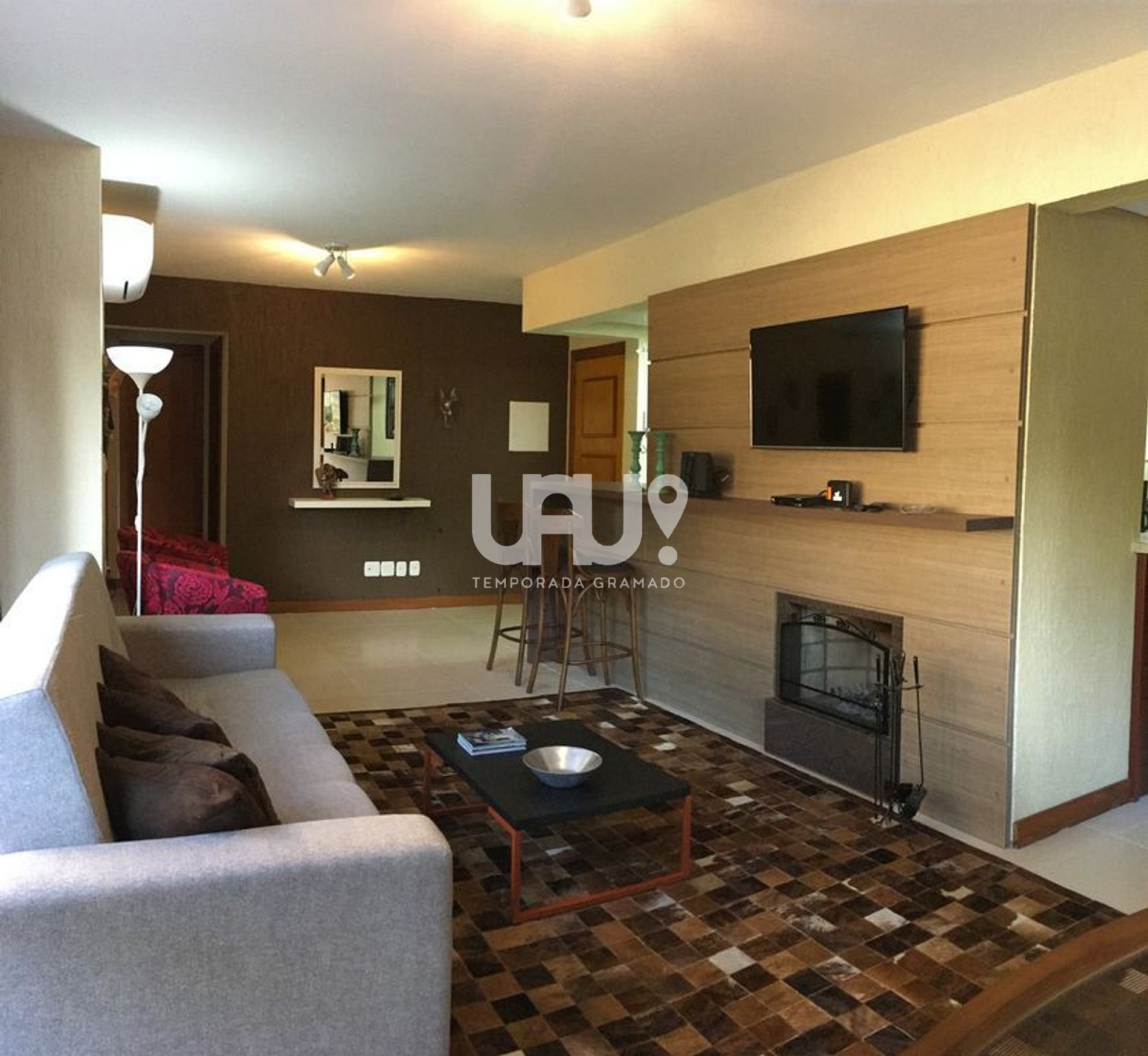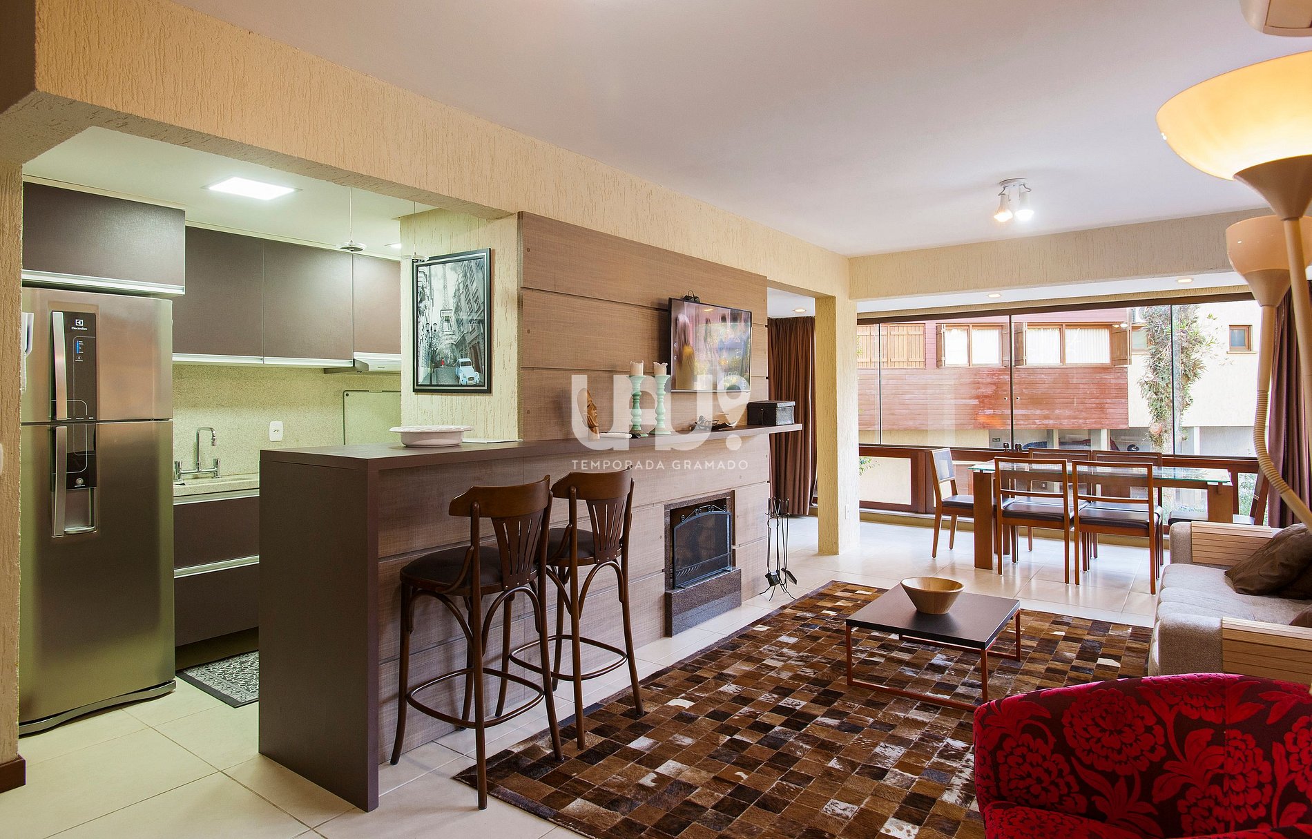 Living em 2 ambientes com confortável sofá cama, lareira, sala de estar/TV, mesa de jantar com 6 cadeiras, Ar Condicionado Q/F, bancada integrada à cozinha, totalmente equipada;