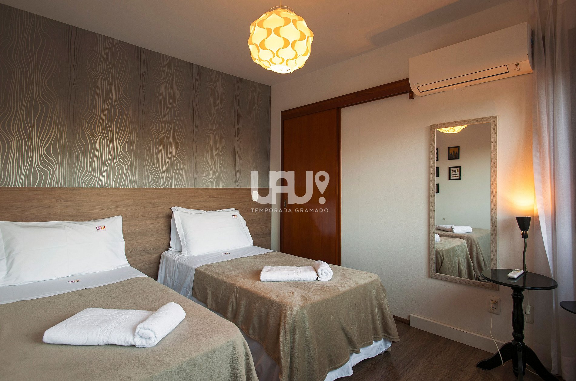 Dormitório com 2 camas de solteiro (que, juntas, formam outra, tamanho Queen Size), cama auxiliar, rouparia e Ar Condicionado Q/F;