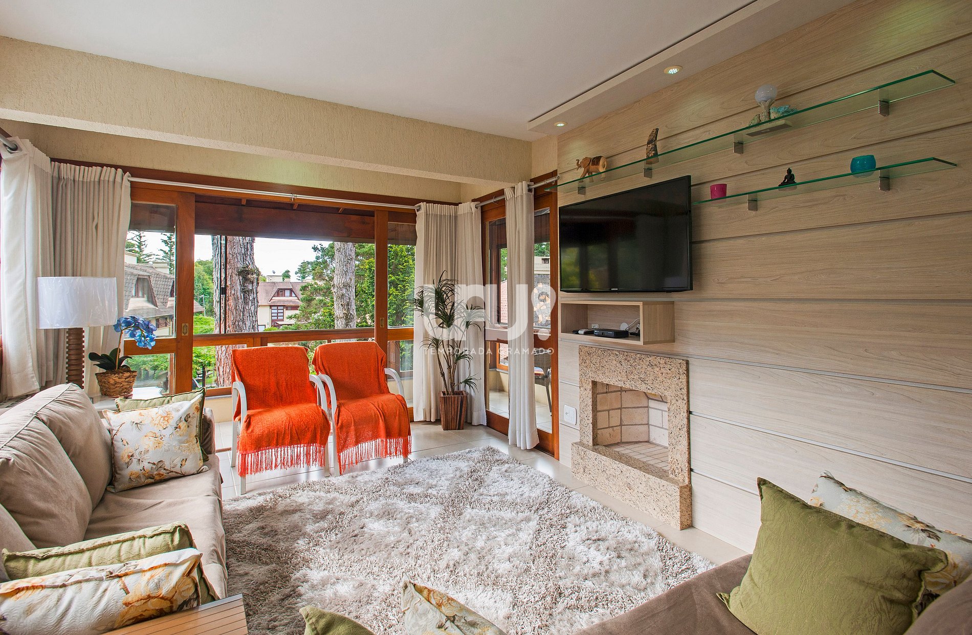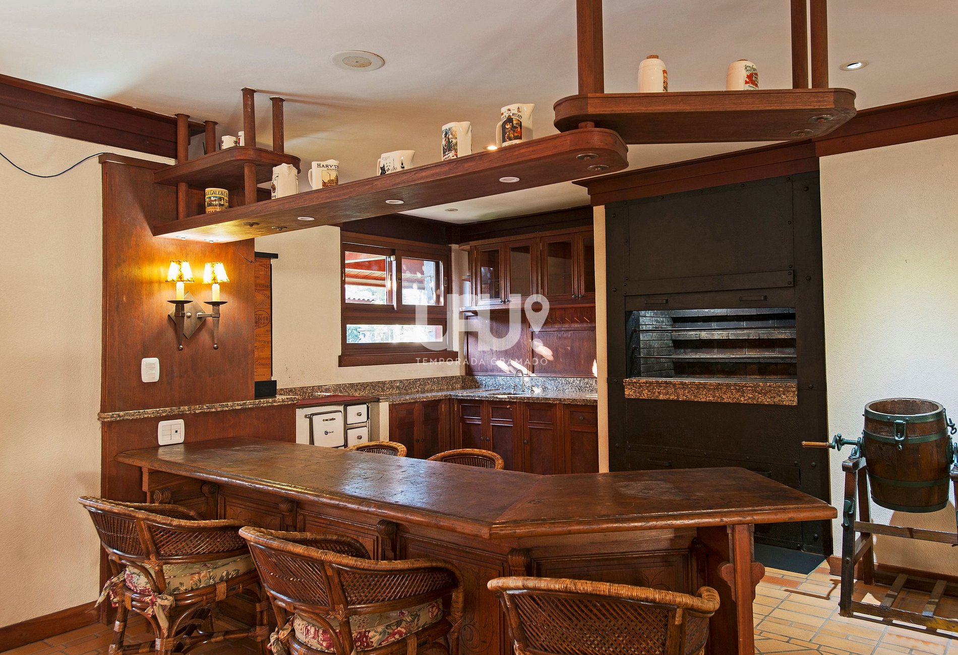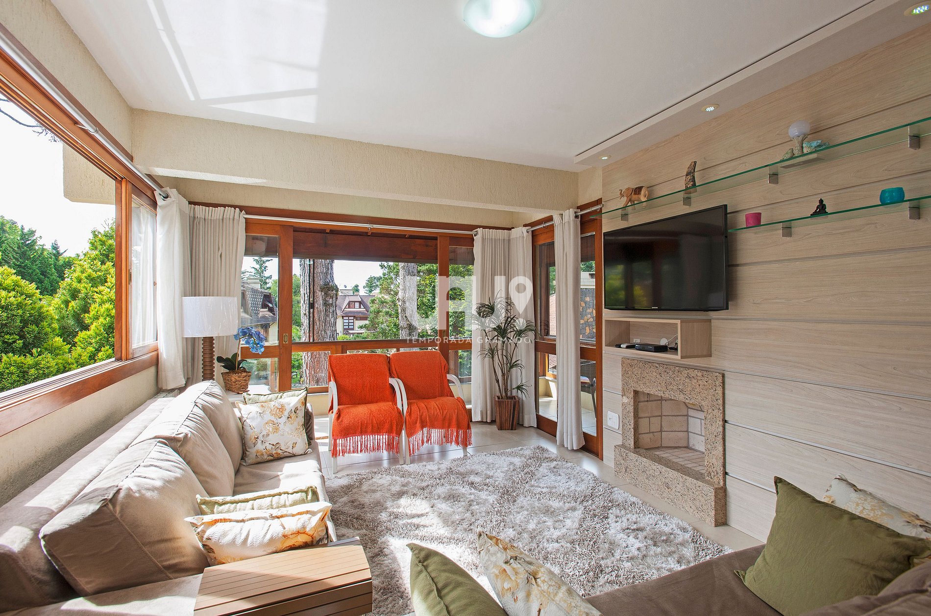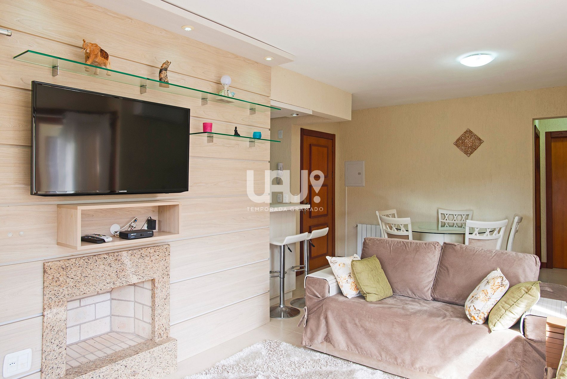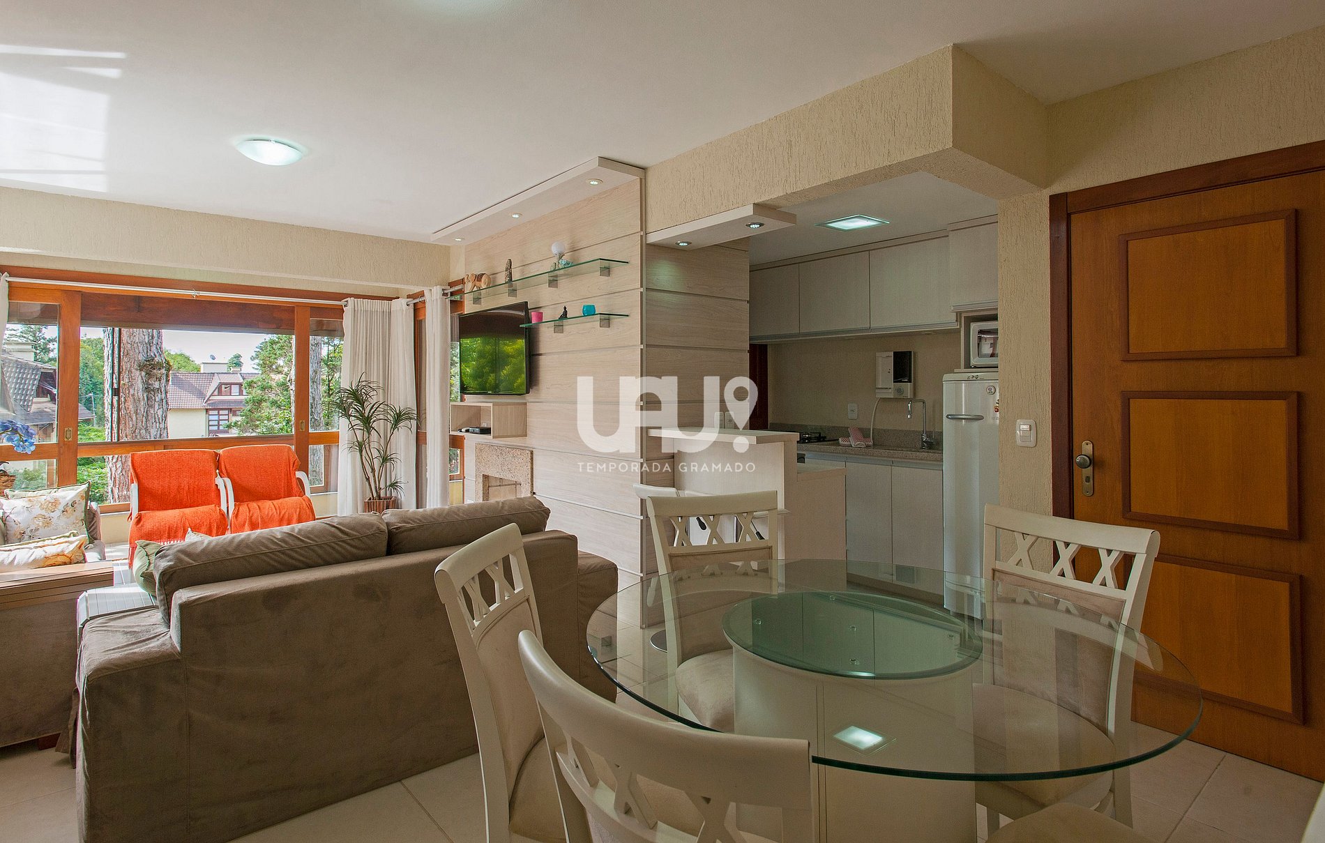 Living em 2 ambientes com confortável sofá, lareira, sala de estar/TV, mesa de jantar com 6 cadeiras, Ar Condicionado Q/F, bancada integrada à cozinha, totalmente equipada, com churrasqueira;
