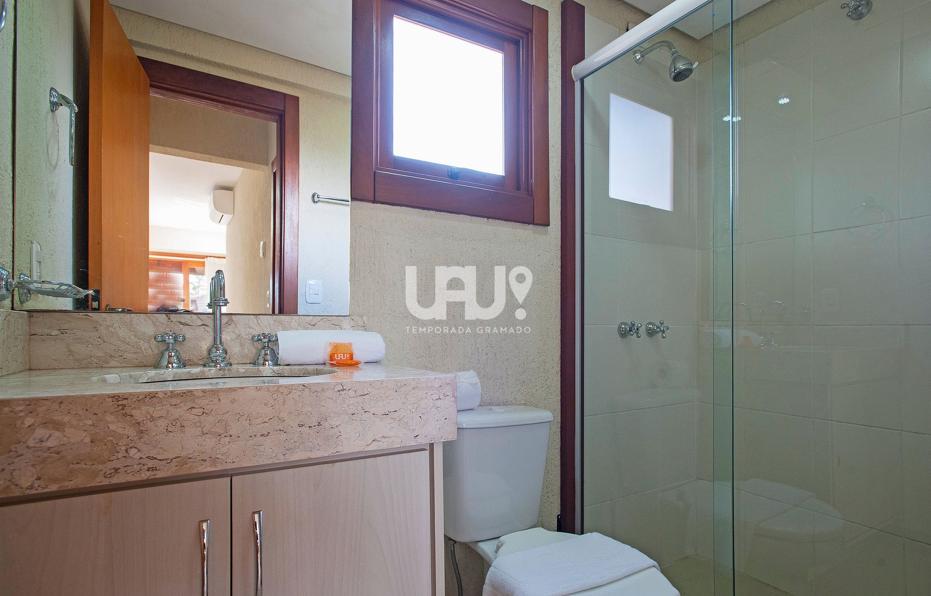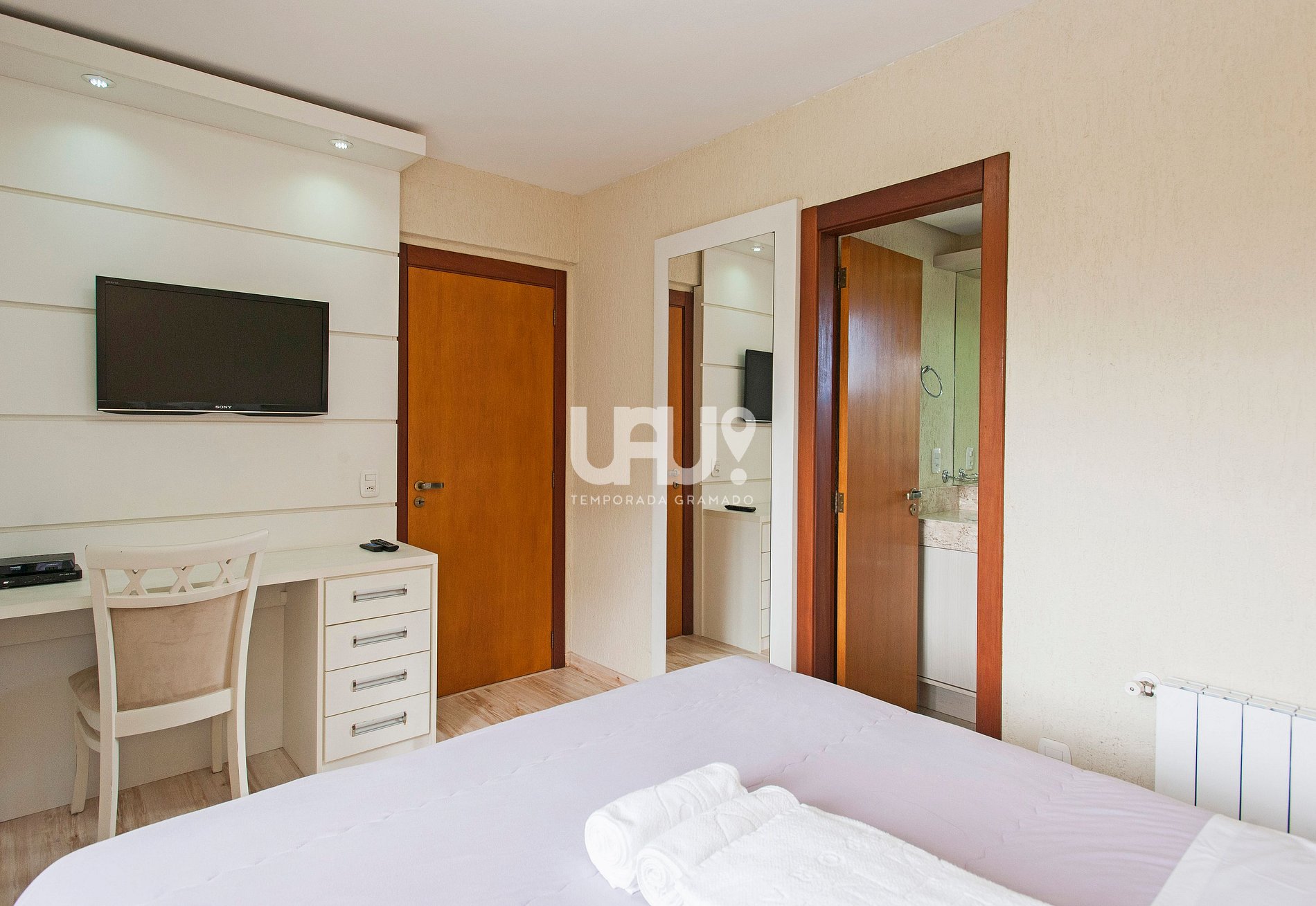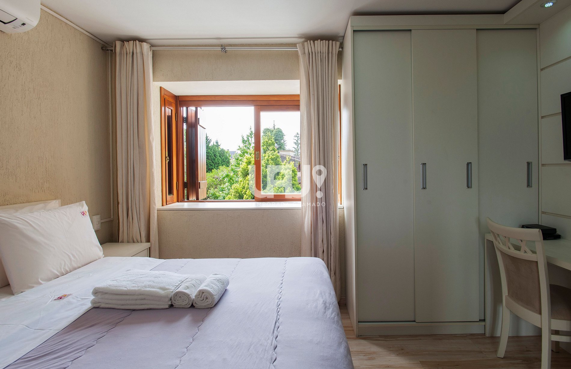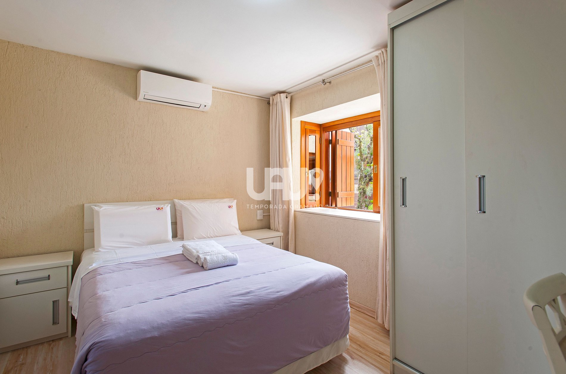 Suíte com cama de casal, rouparia e Ar Condicionado Q/F;