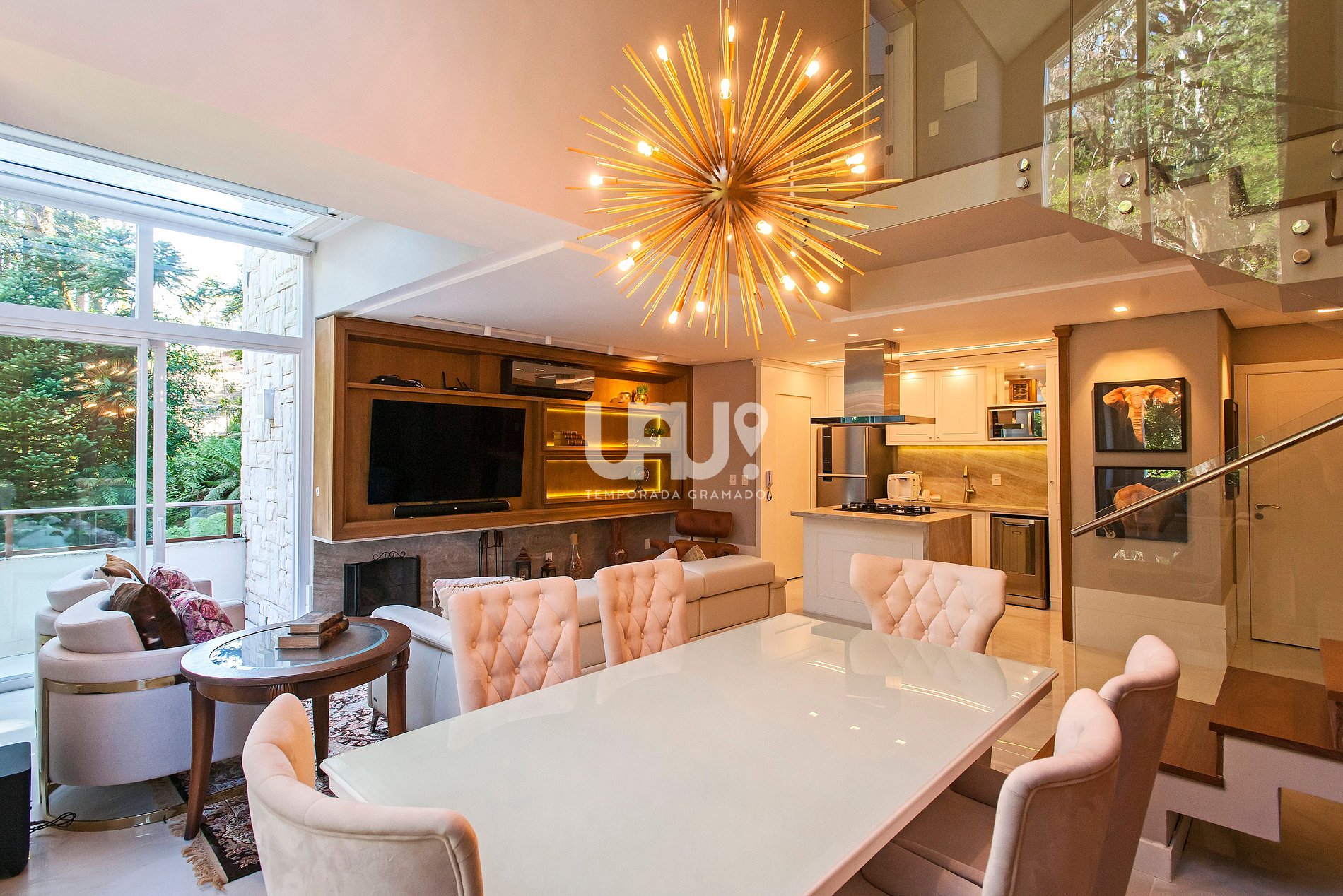 Living com pé direito duplo, jantar e estar decorados com sofisticação, climatização para inverno e verão...