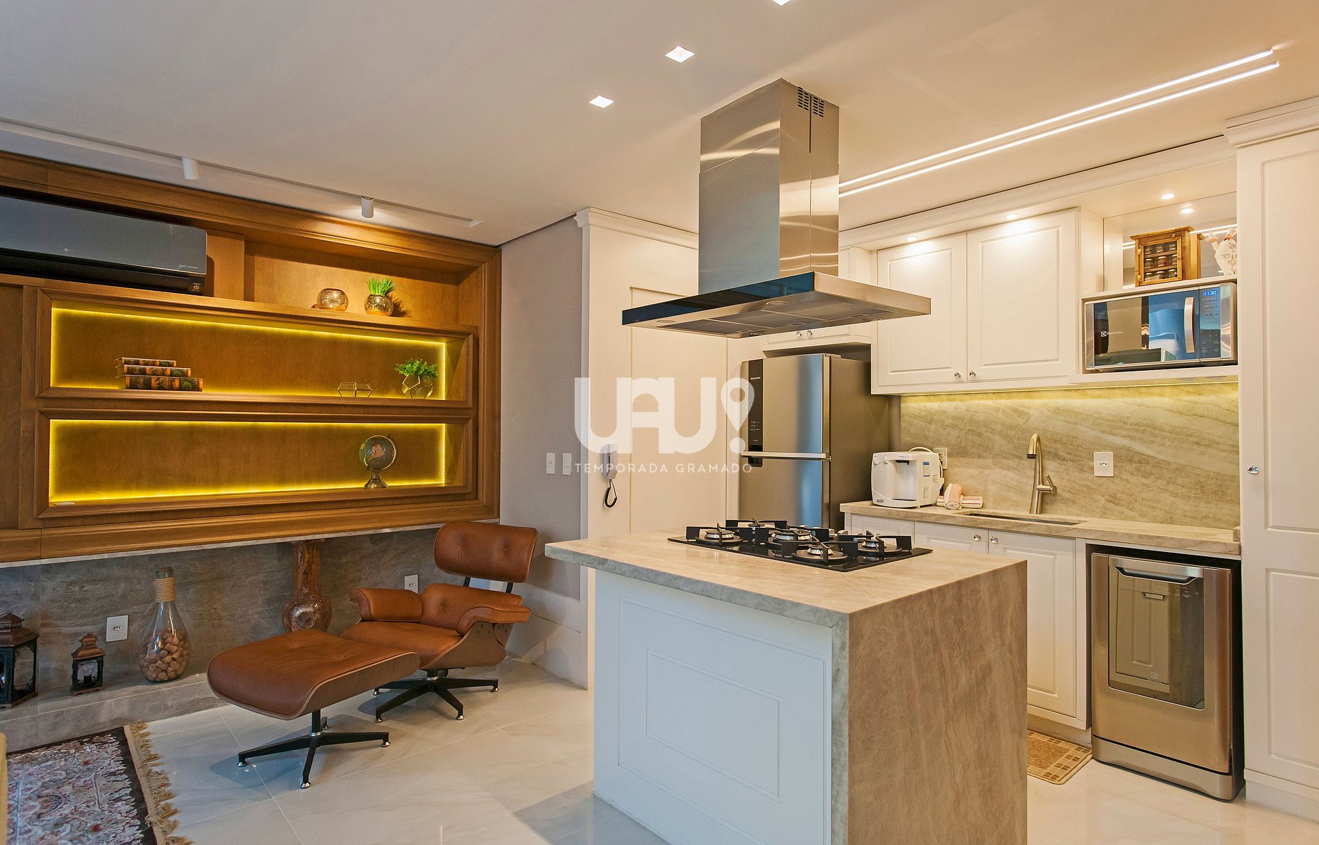Ah! Para quem gosta de preparar aquele jantar especial, uma cozinha em estilo americano, totalmente equipada, com churrasqueira, integrada ao living...