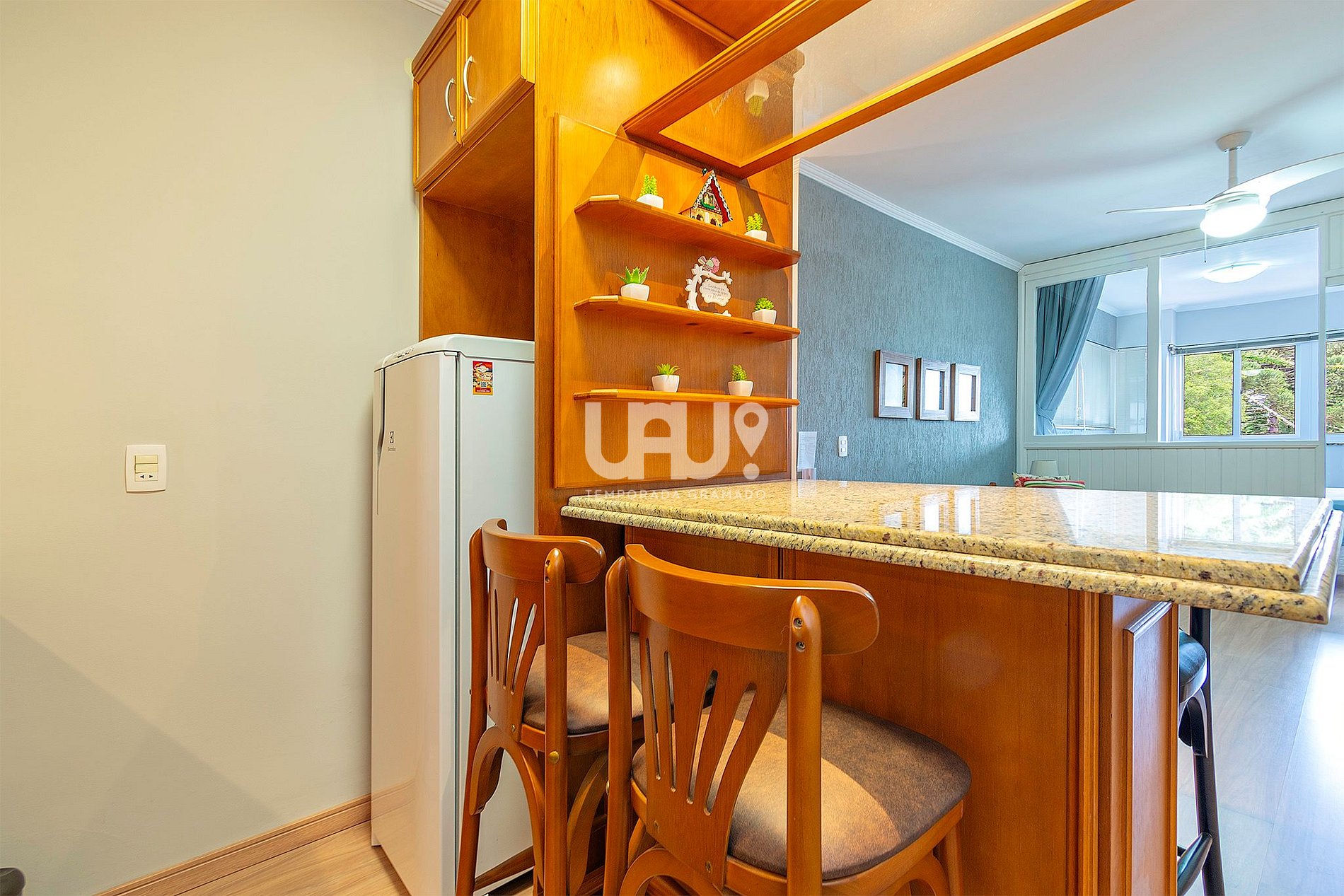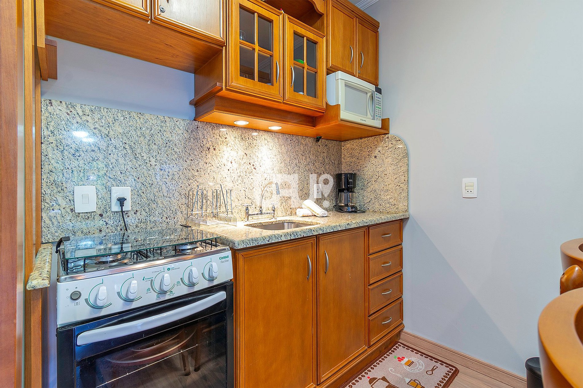 O Estúdio dispõe de 1 quarto, sala de estar com TV e cozinha ¨porém é extremamente proibido fazer frituras em razão da falta de exaustão do apartamento¨.