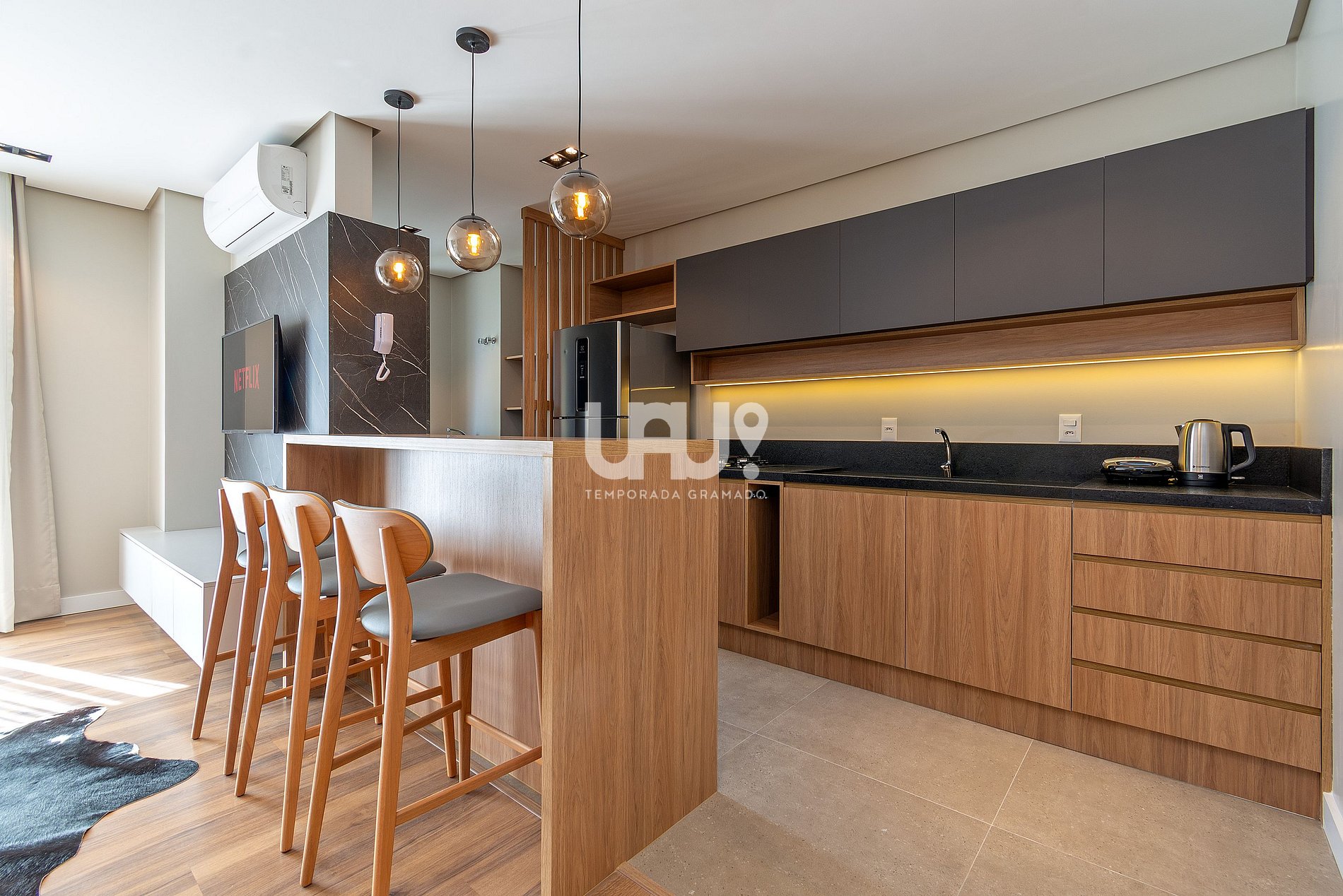 Sala de estar/jantar com SmartTV 50', split quente e frio e sofá cama, integrado à cozinha em estilo americano, totalmente equipada;