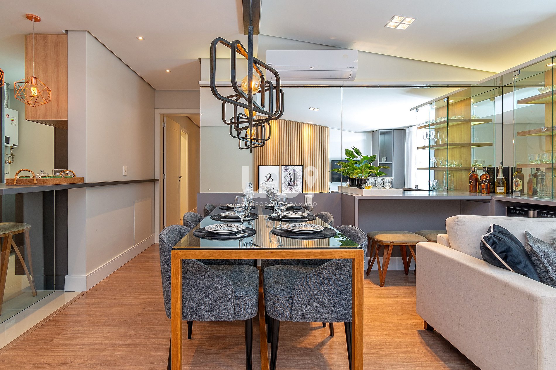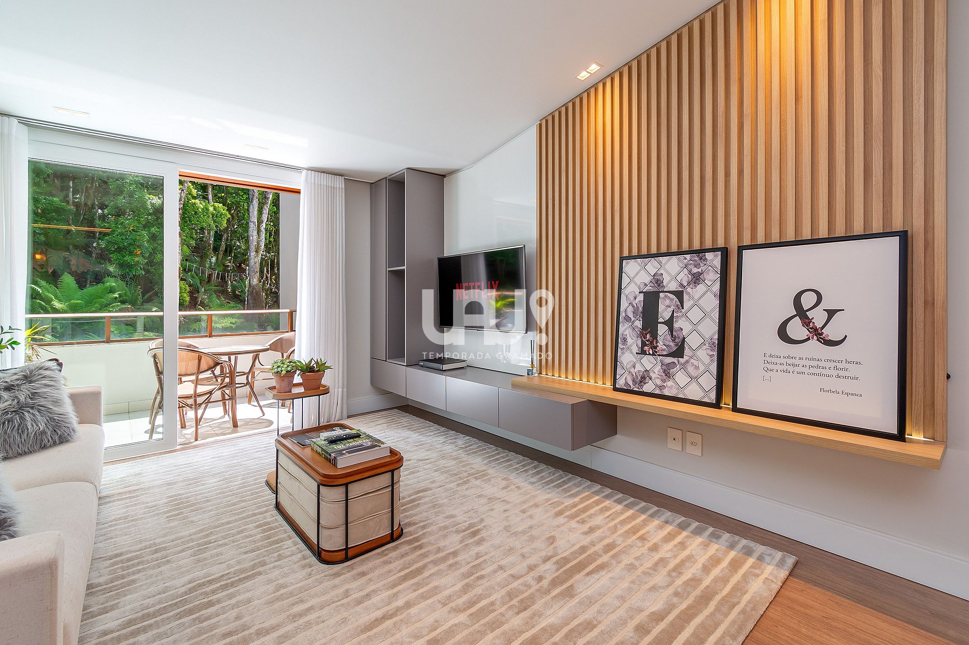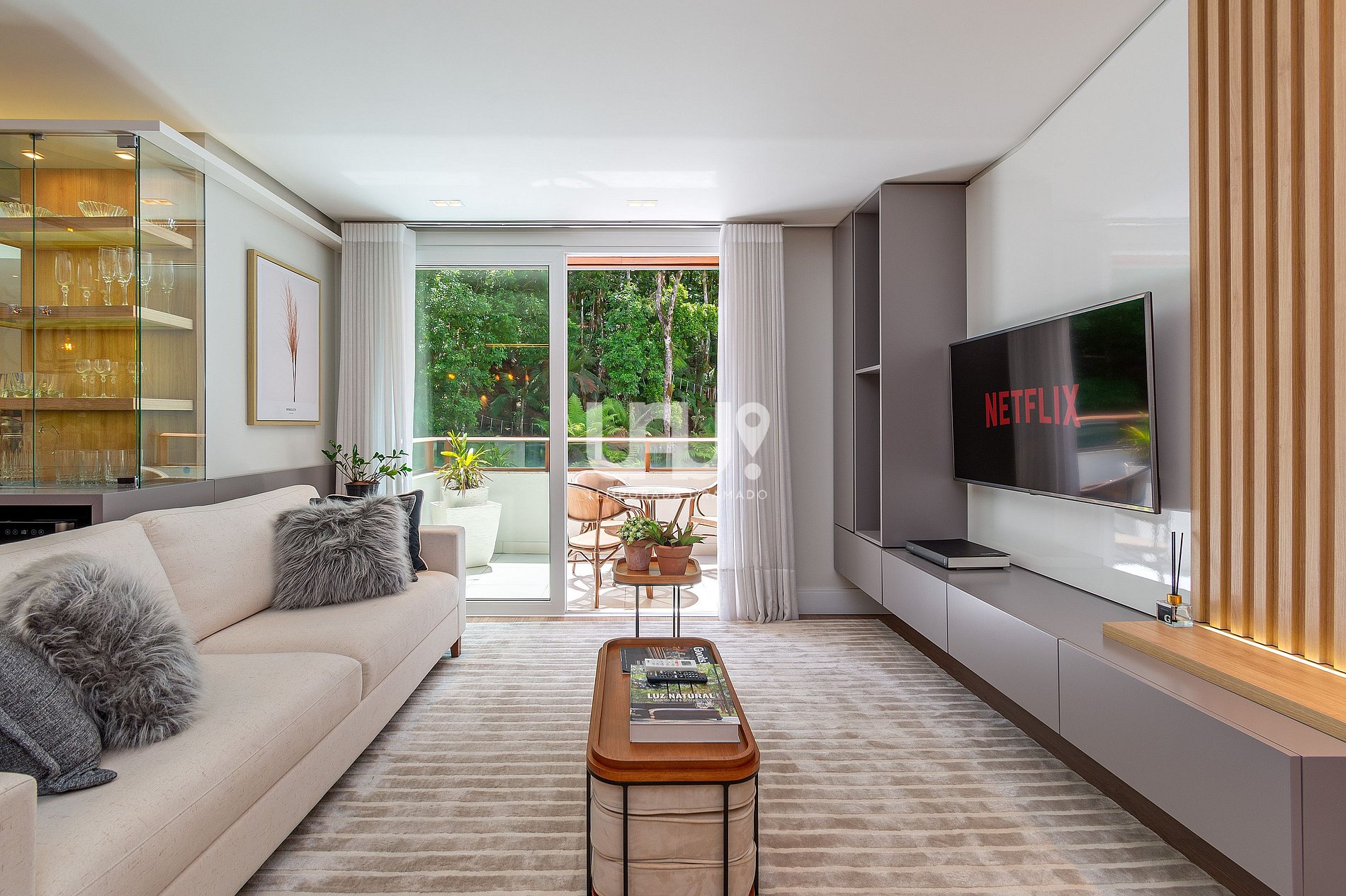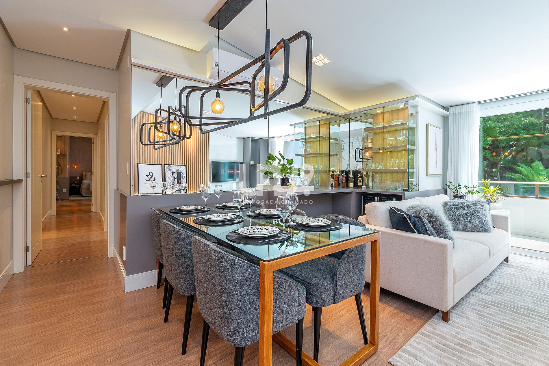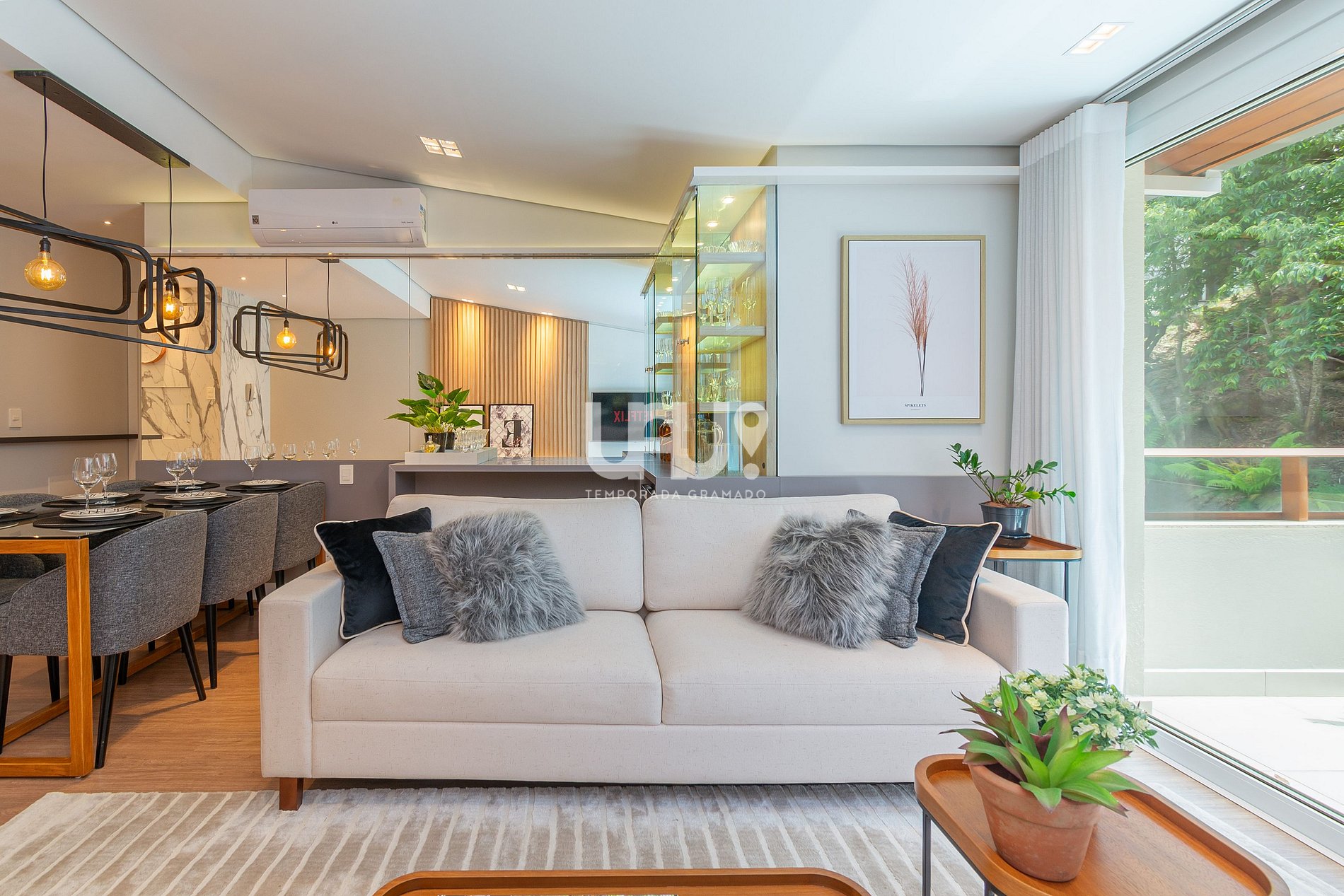 Living decorado com sofisticação, climatização para inverno e verão, sacada com vista...