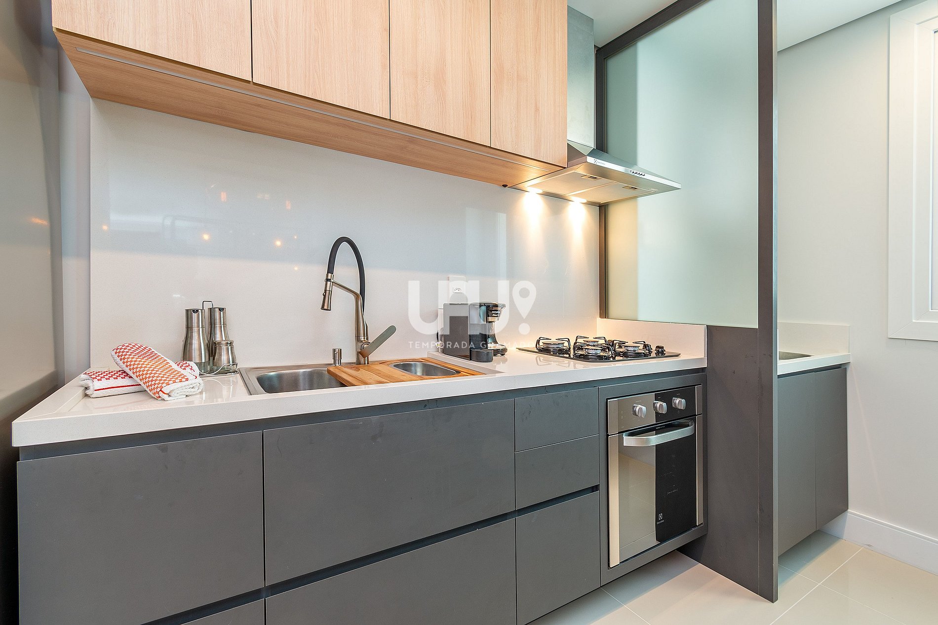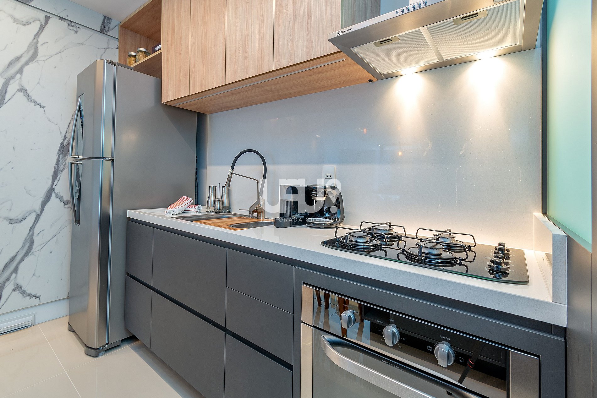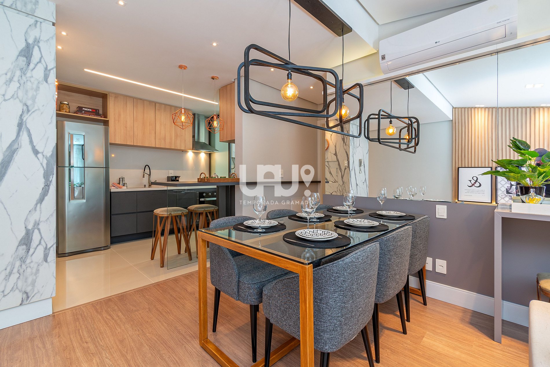 Ah! Para quem gosta de preparar aquele jantar especial, uma cozinha em estilo americano, totalmente equipada, com churrasqueira, integrada ao living...