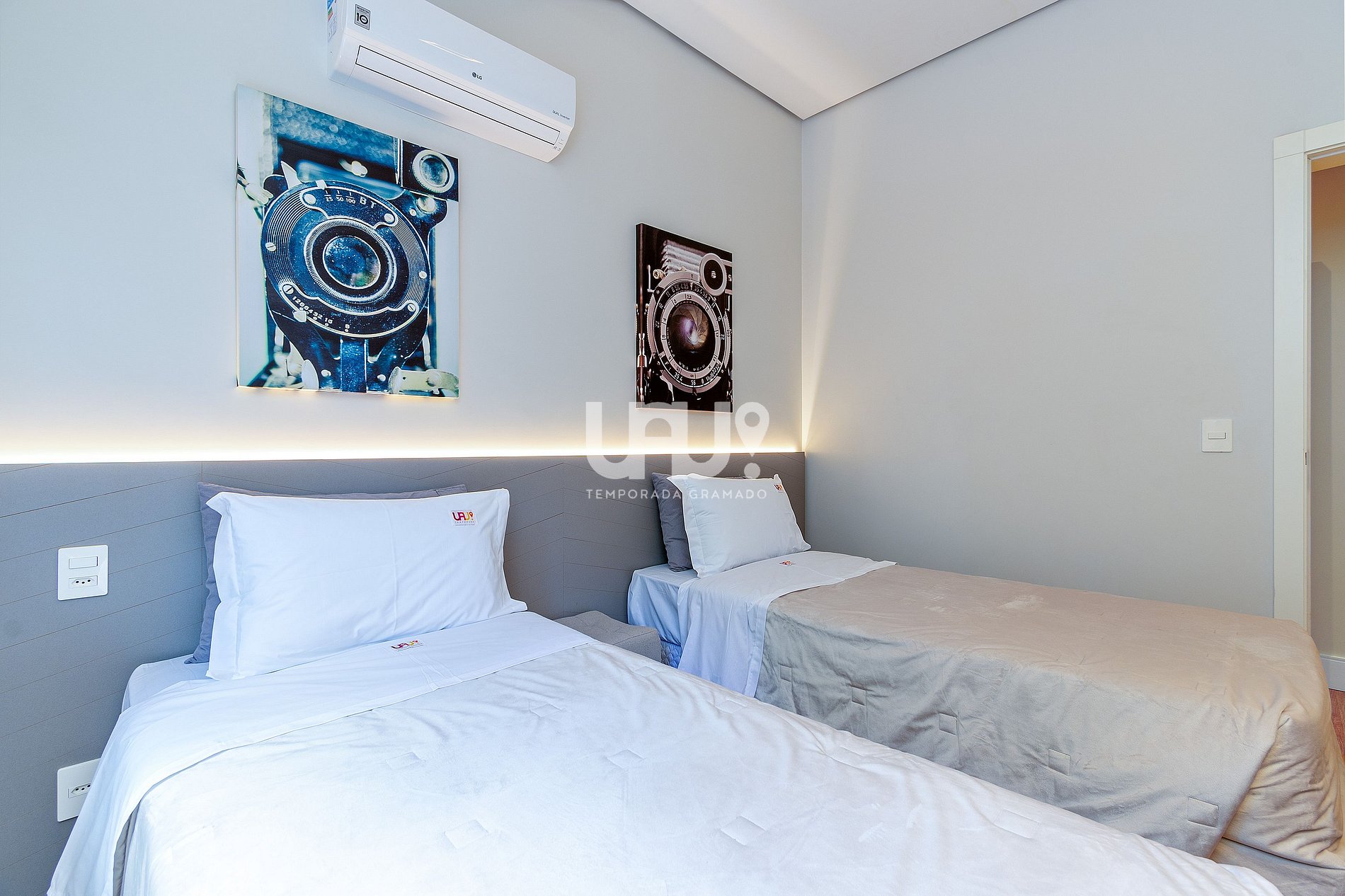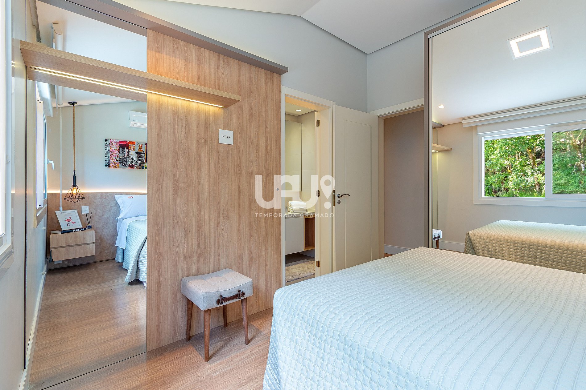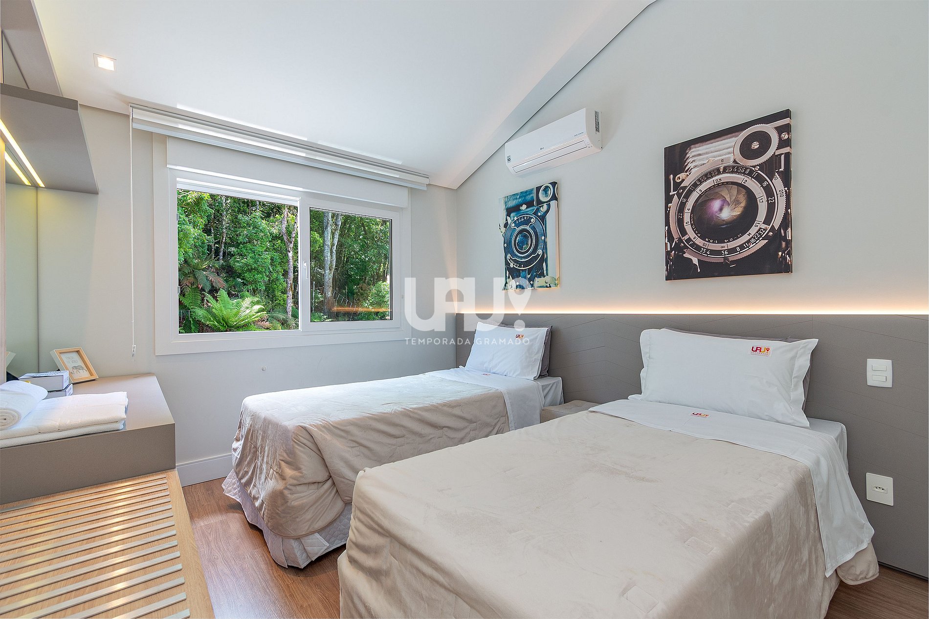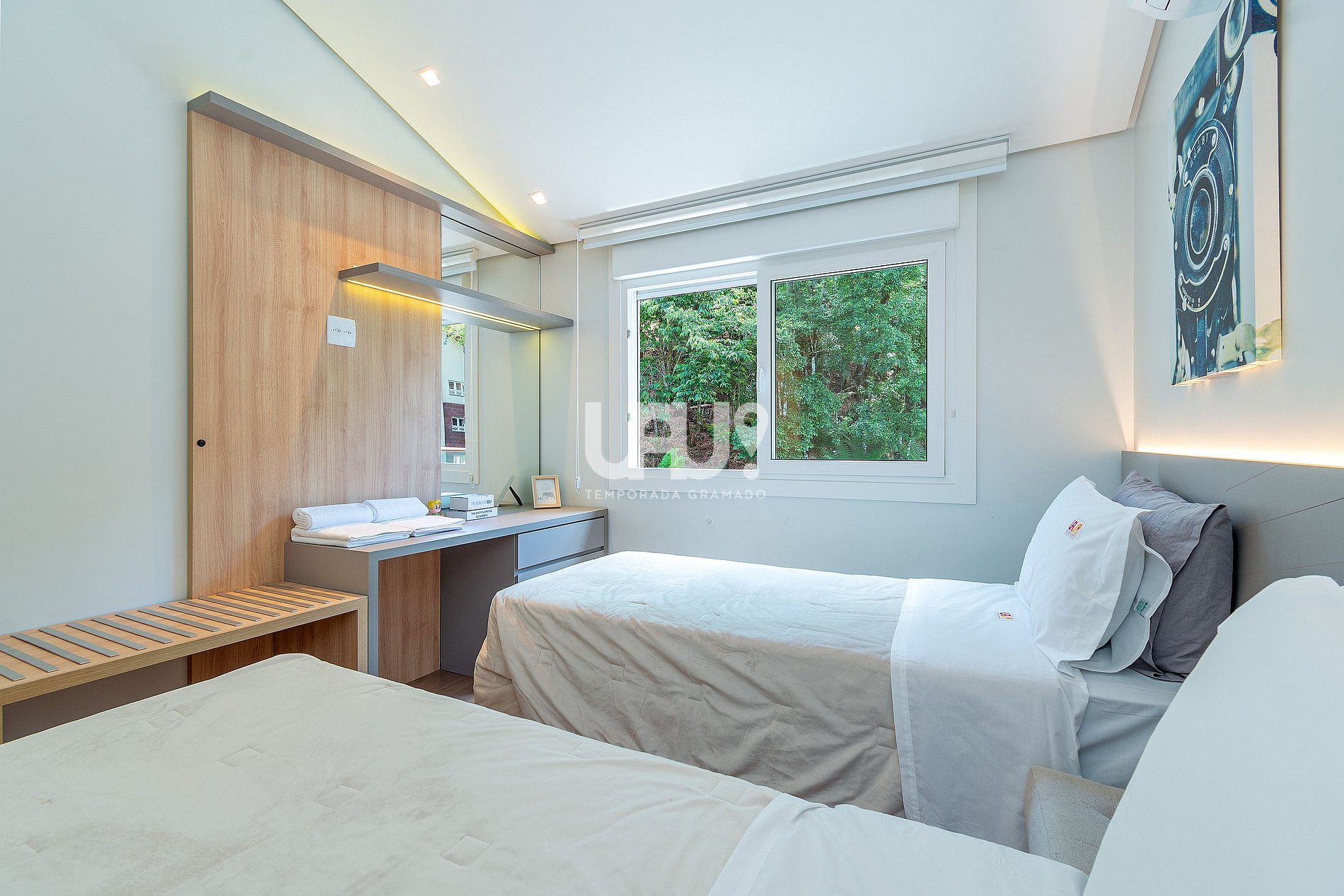 Dormitório com duas camas de solteiro (que, unidas, formam outra tamanho Queen Size), rouparia completa, banheiro completo...