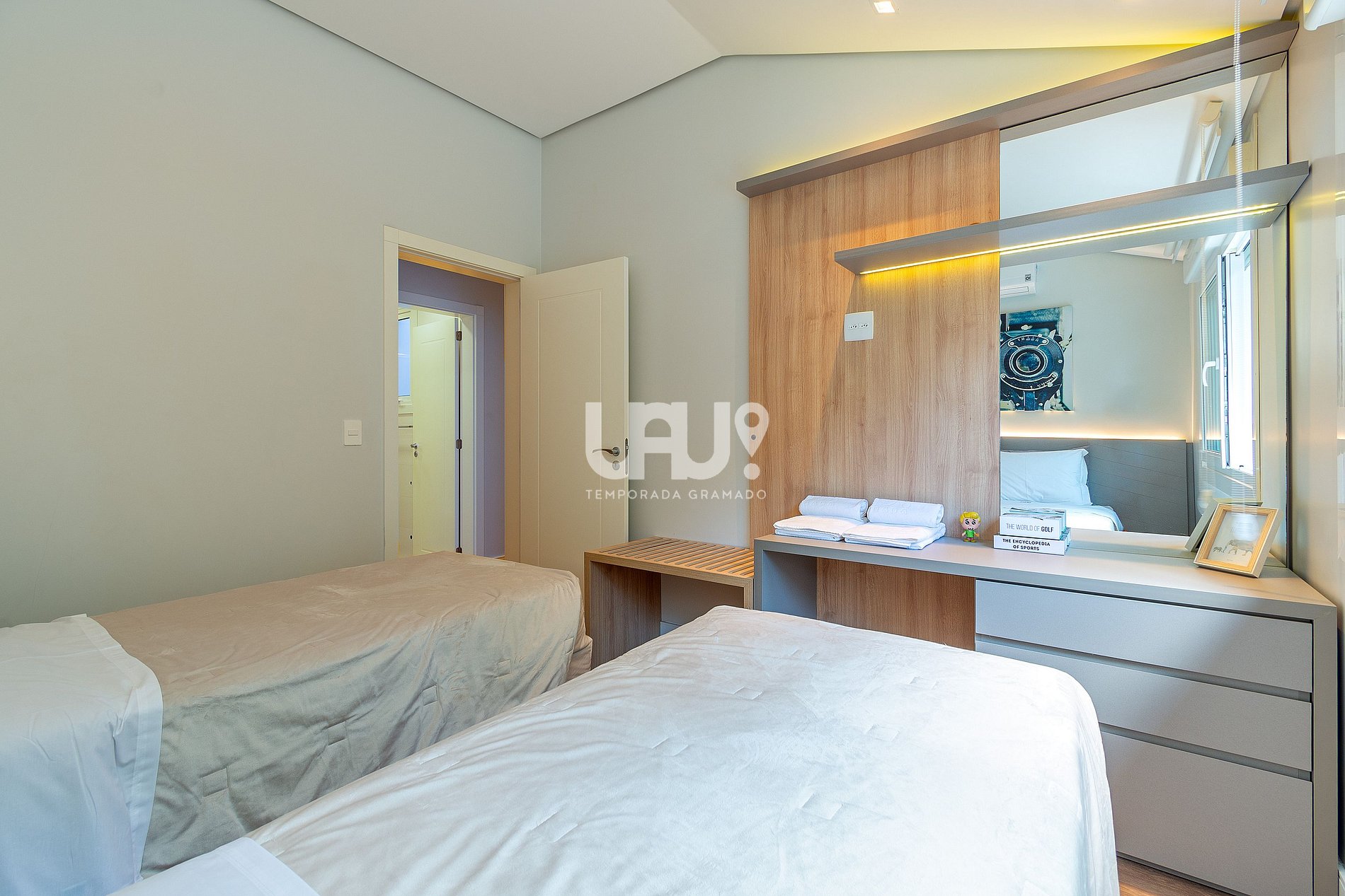 Dormitório com duas camas de solteiro (que, unidas, formam outra tamanho Queen Size), rouparia completa, banheiro completo...