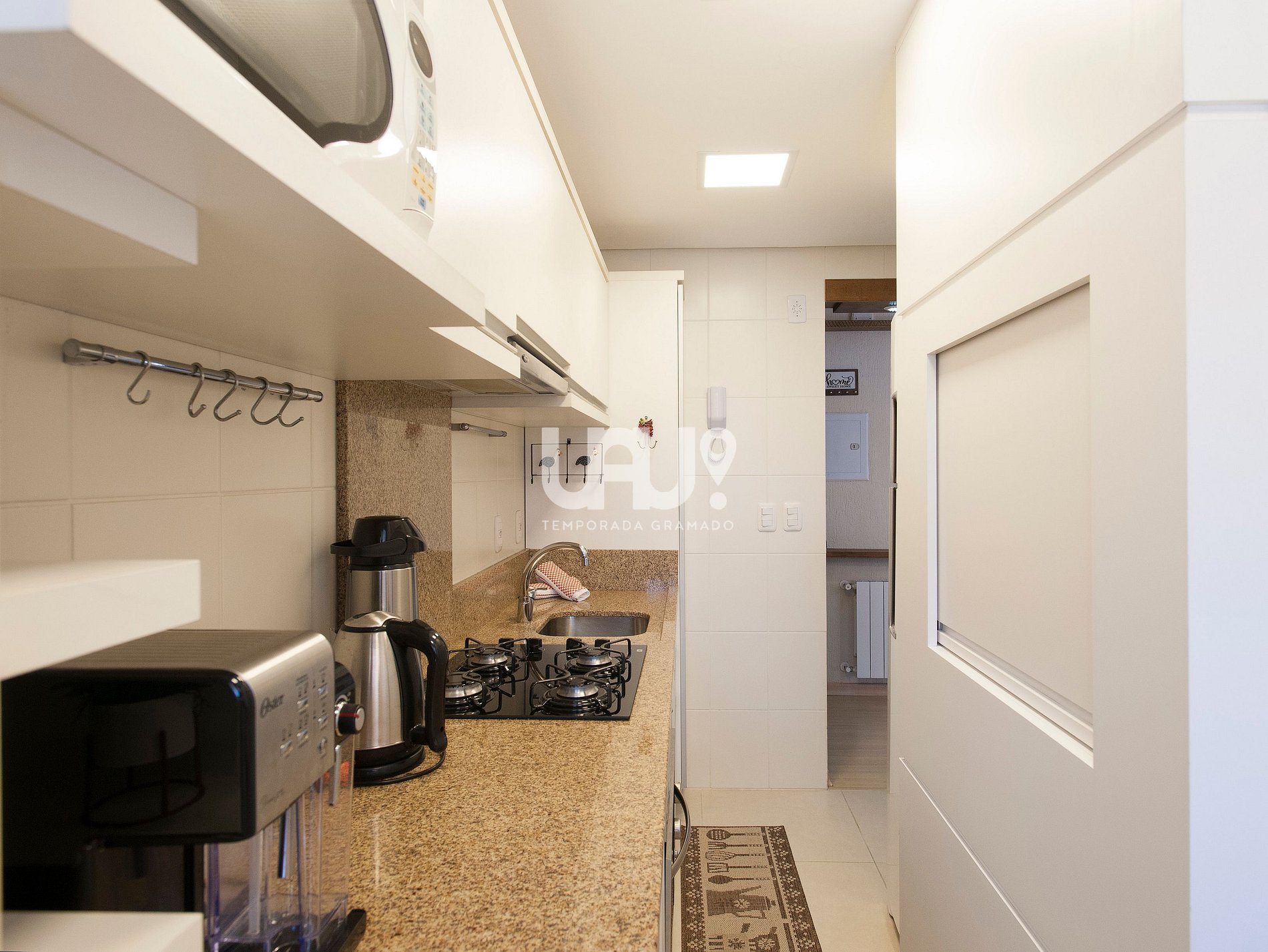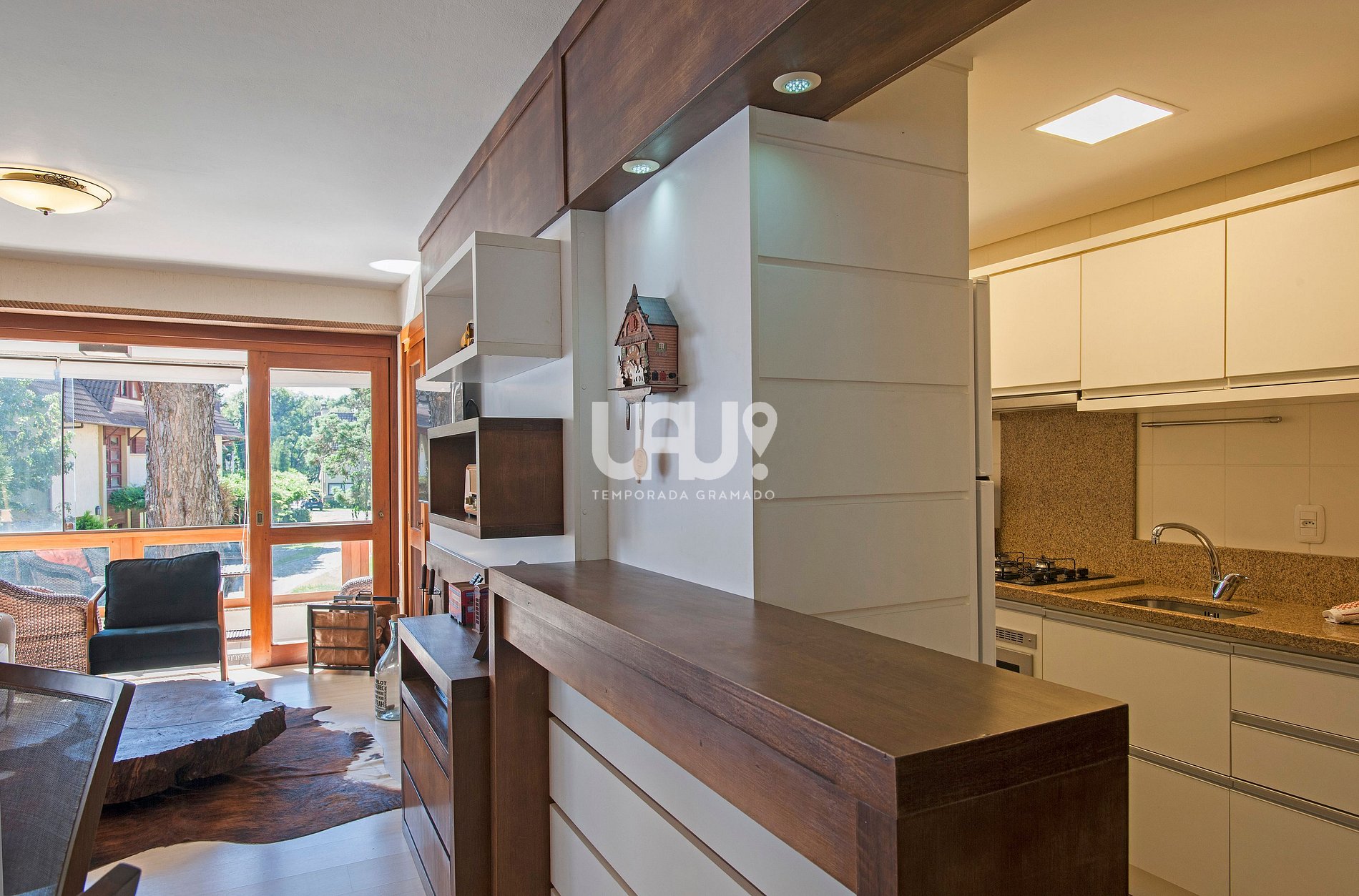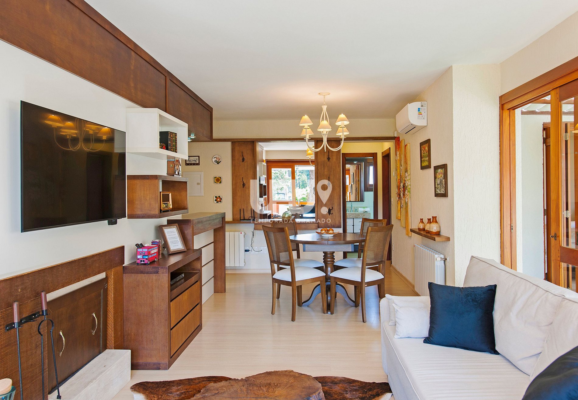Living em 2 ambientes com confortável sofá cama, lareira, sala de estar/TV, mesa de jantar com 4 cadeiras, Ar Condicionado Q/F, bancada integrada à cozinha, totalmente equipada, área de lavanderia composta com máquina lava e seca ;