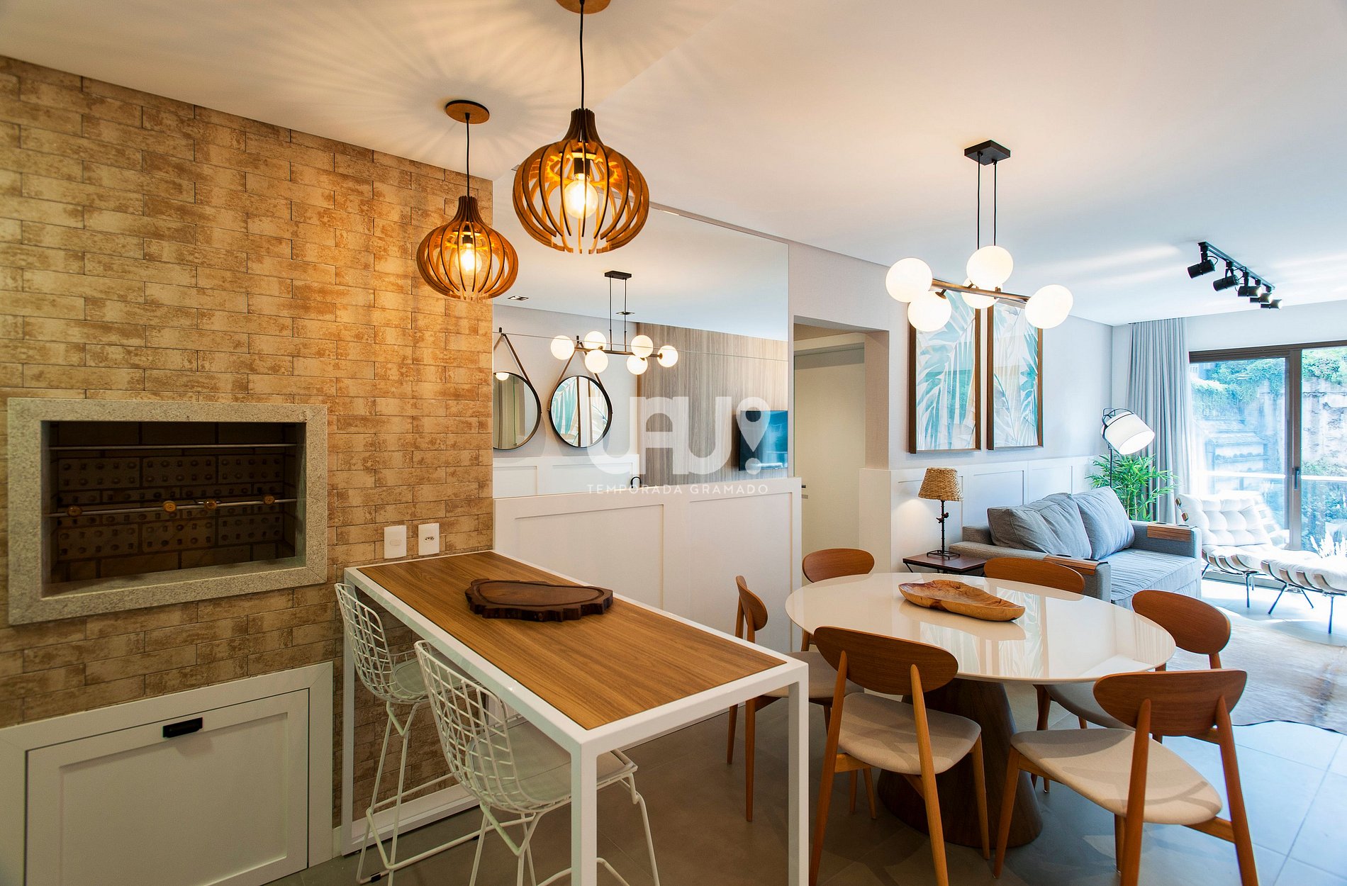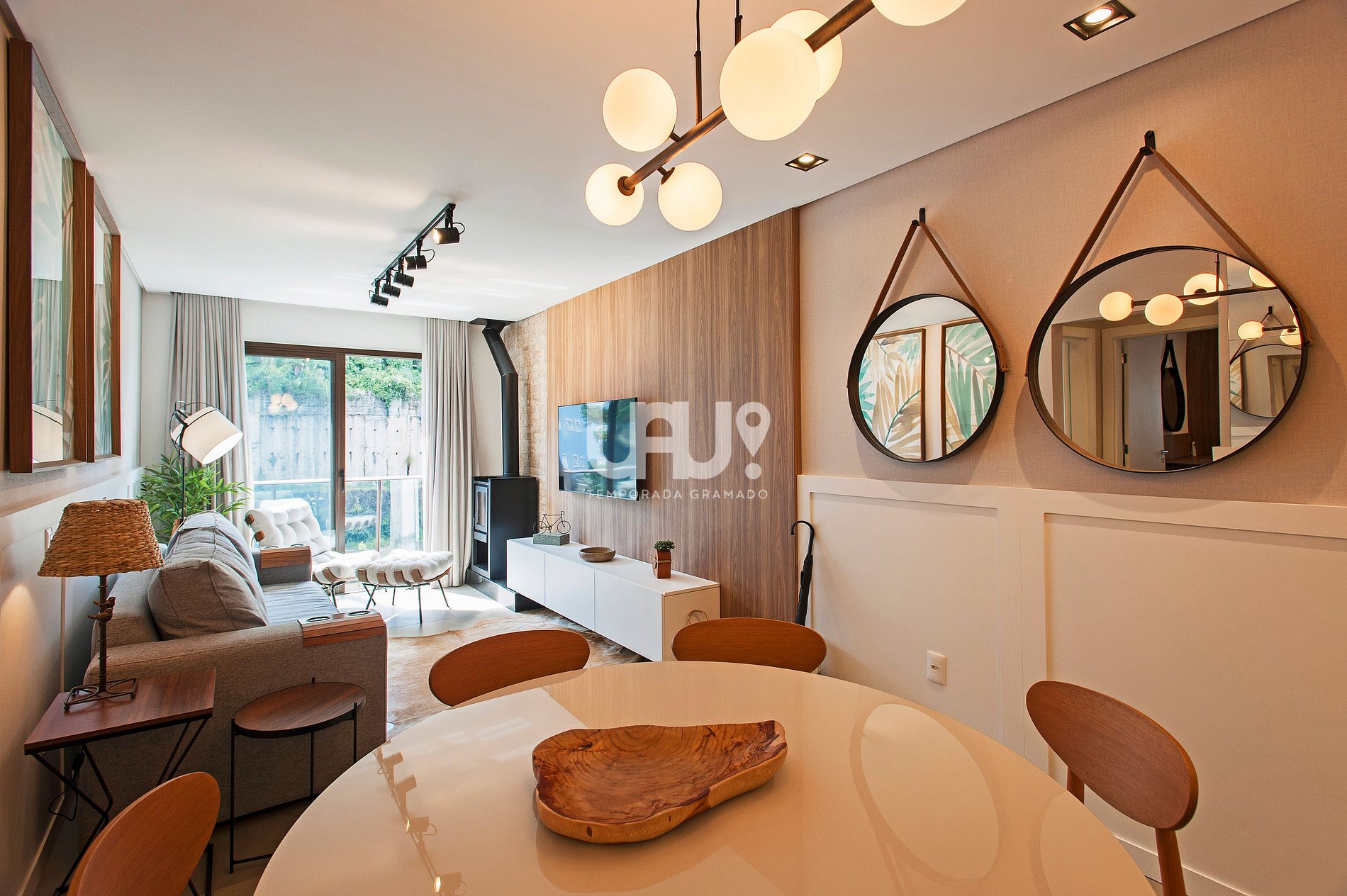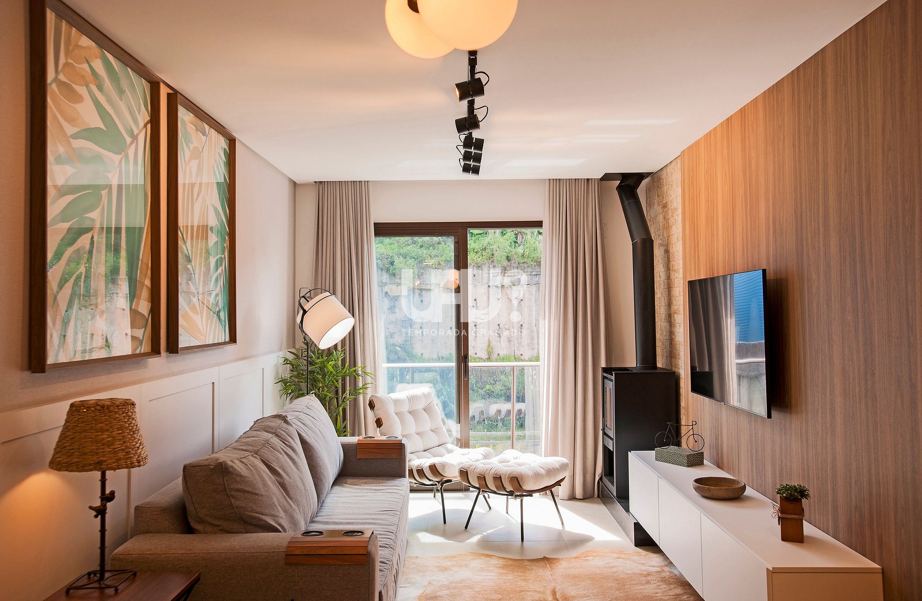 Living em dois ambientes SmartTV 55’, sofá cama, split q/f, lareira/estufa à lenha e mesa de jantar para até 6 pessoas;