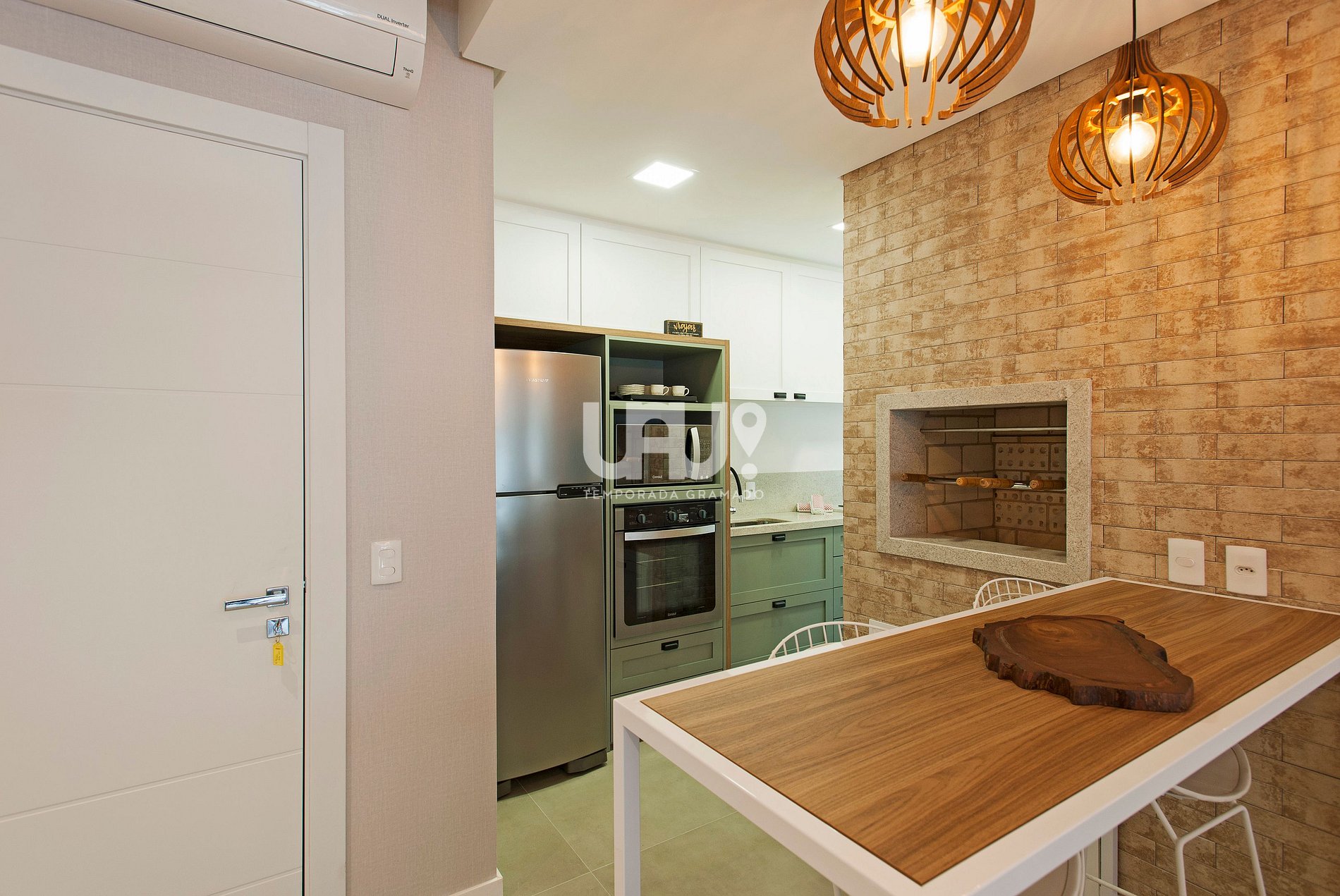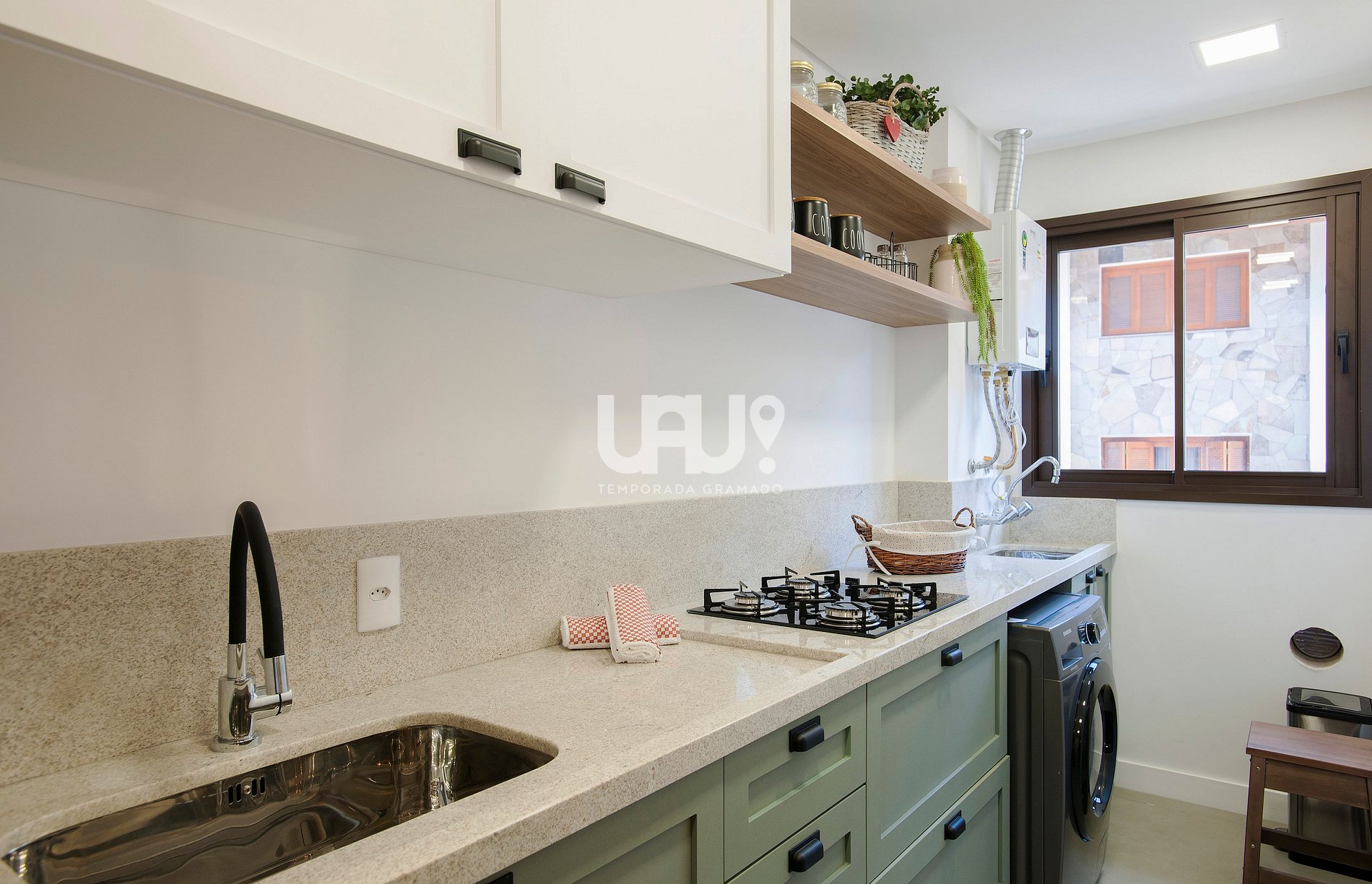 Cozinha completa, com churrasqueira e lavanderia com máquina lava e seca;