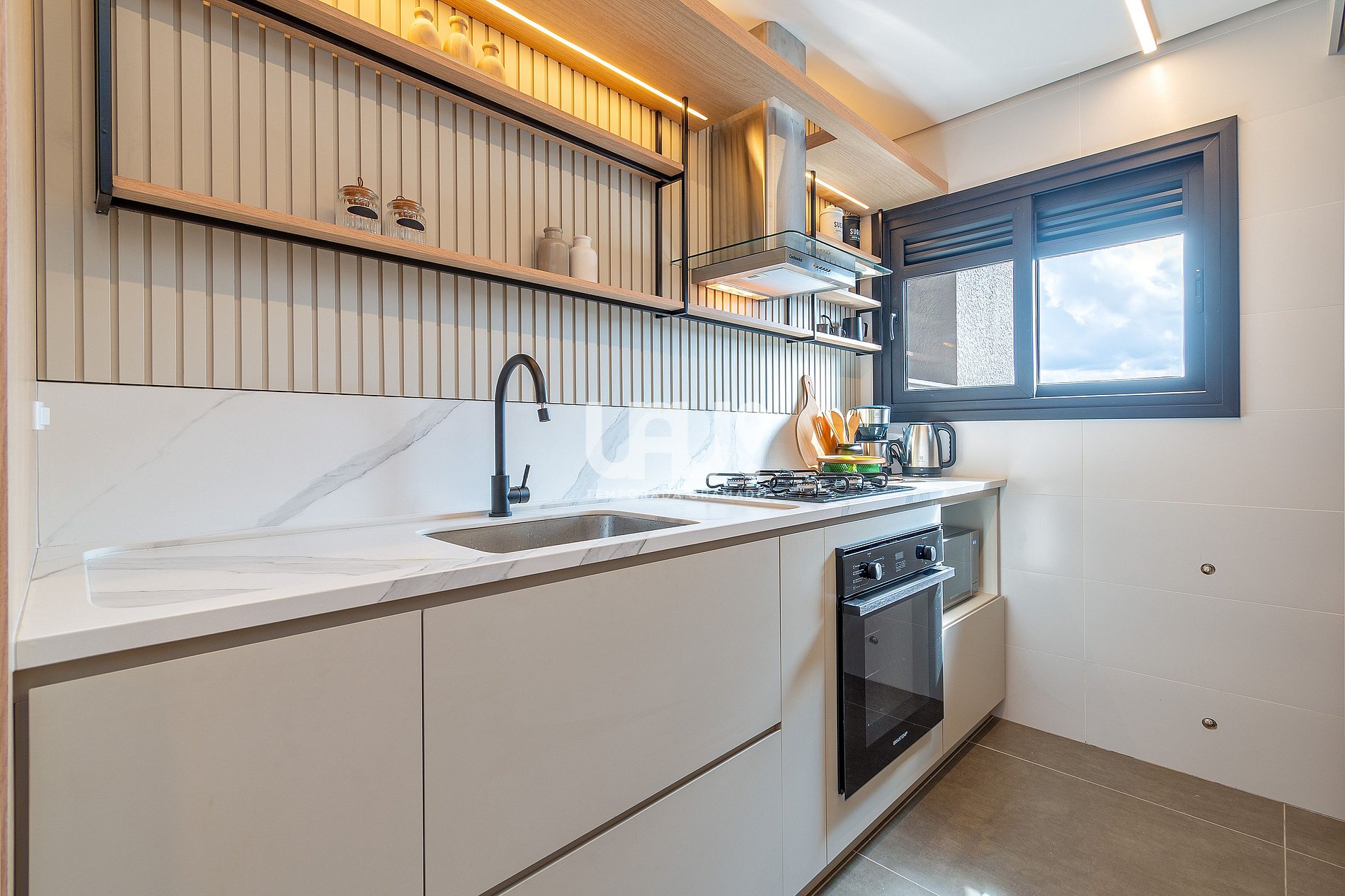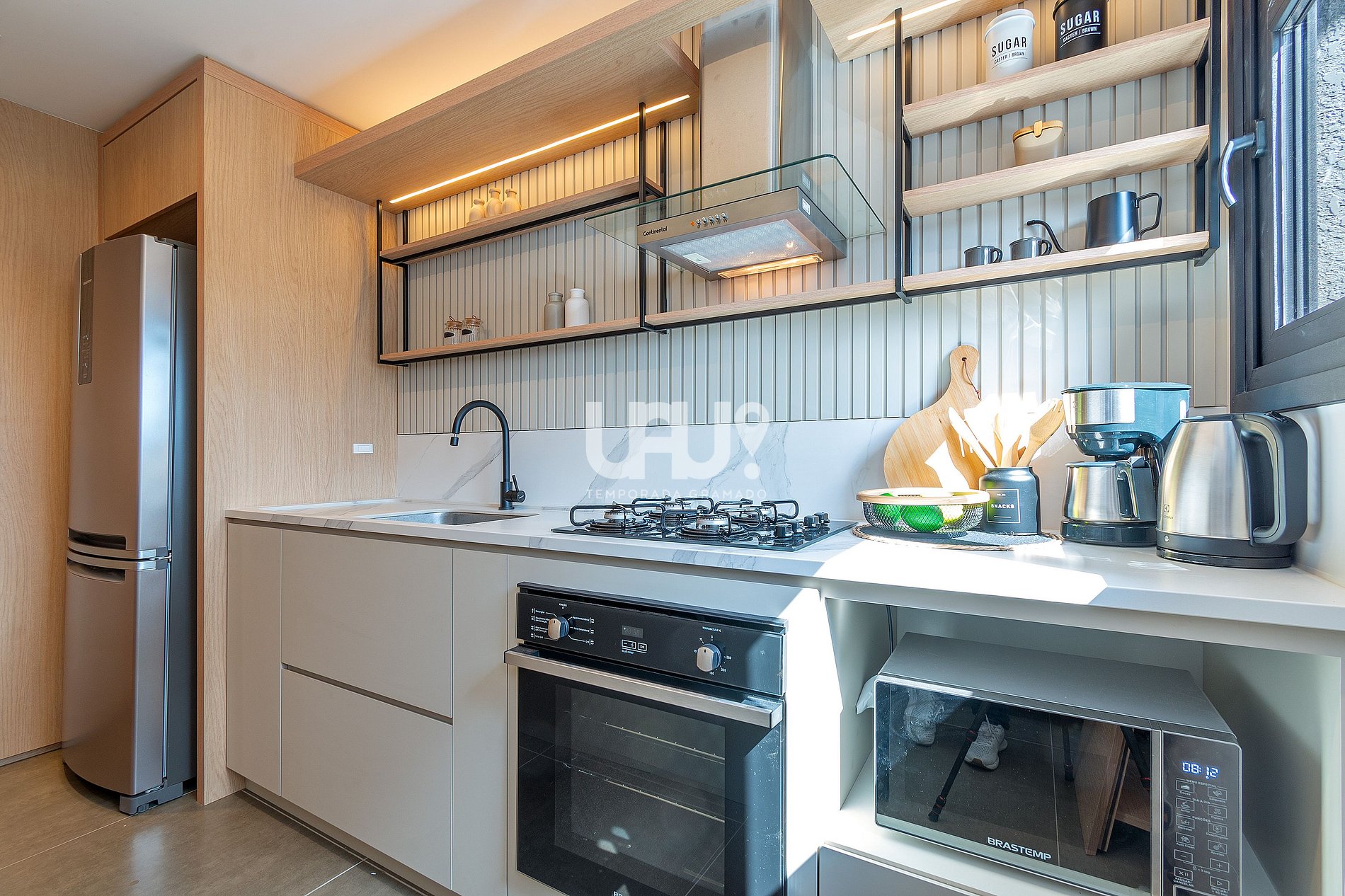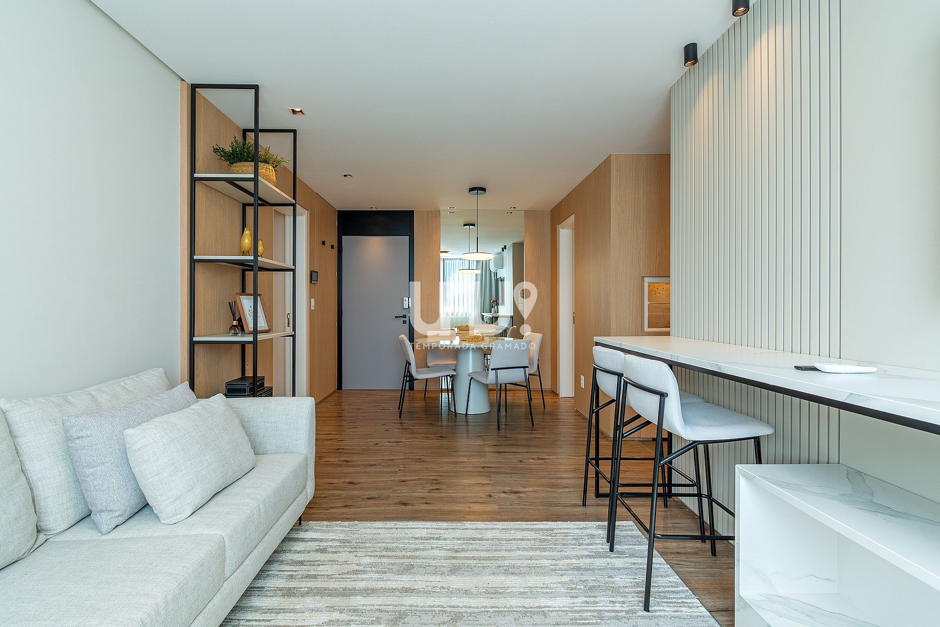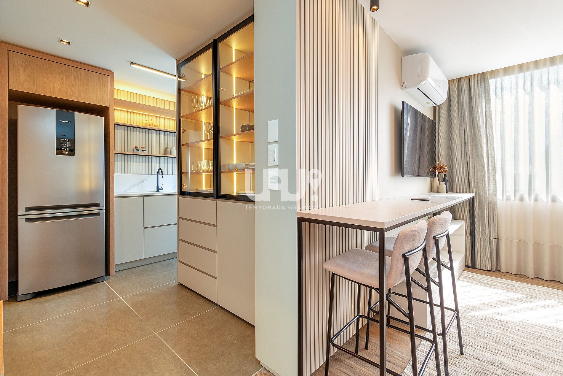 Sala de estar/jantar com SmartTV 50' e split quente, integrado à cozinha em estilo americano, com churrasqueira a carvão;