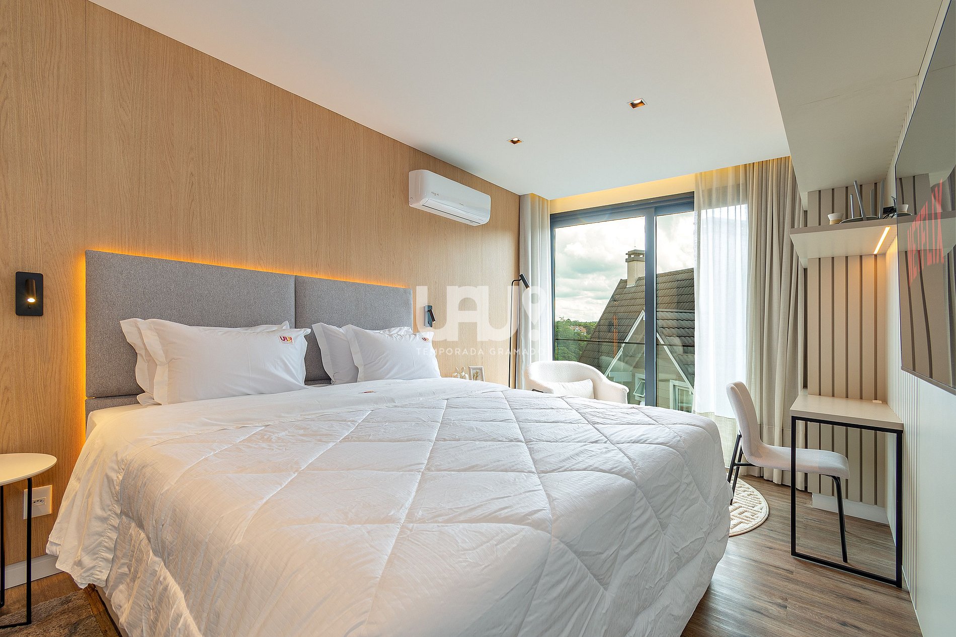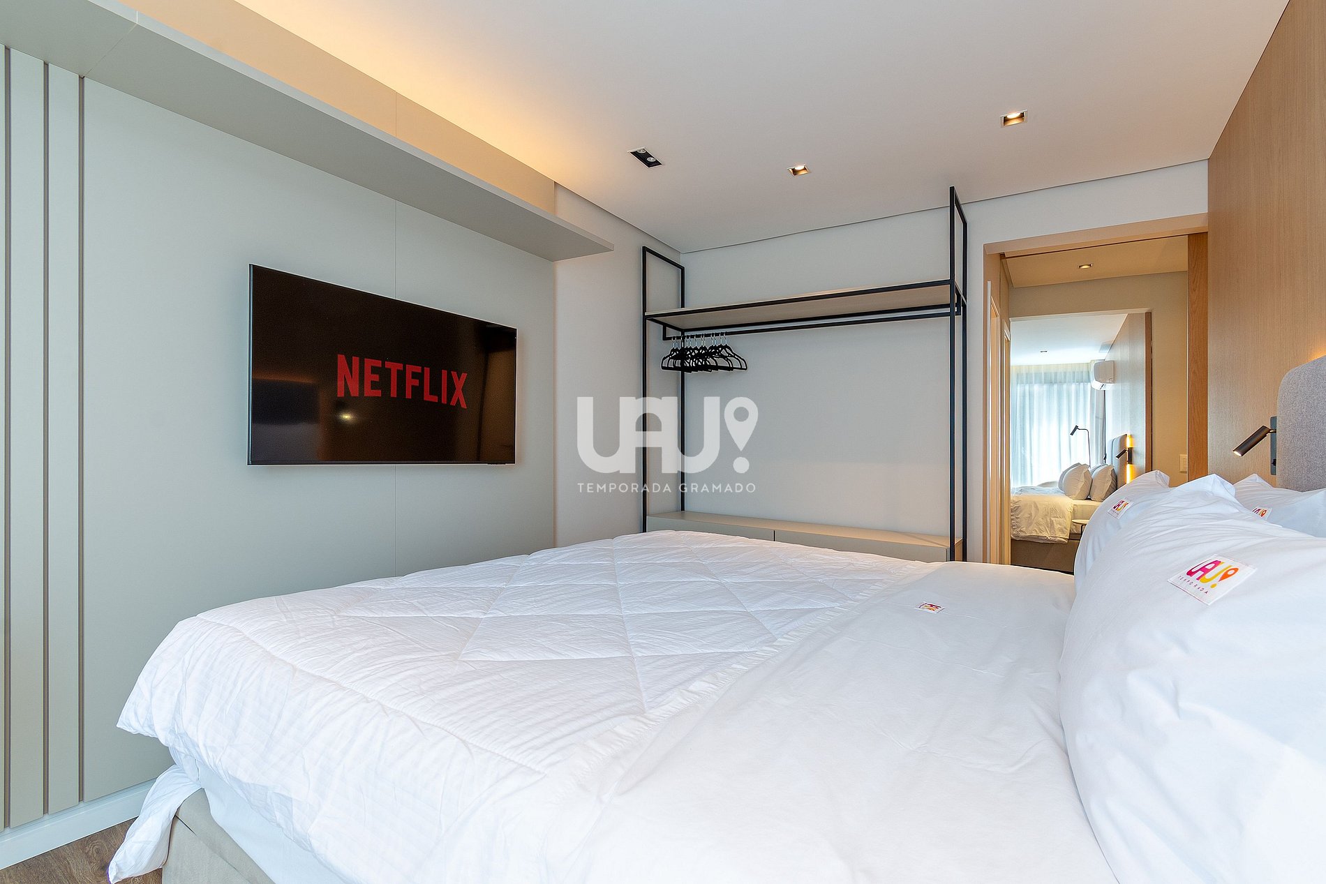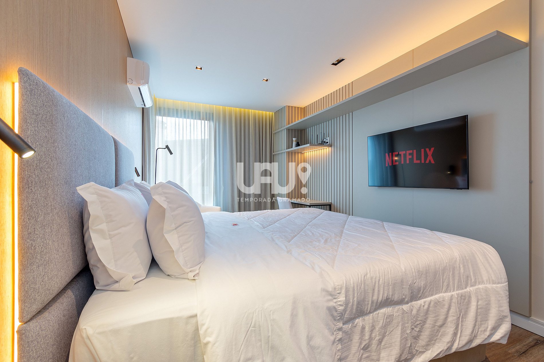 Suíte com cama King Size, SmartTV 50’, split quente e frio e rouparia completa;