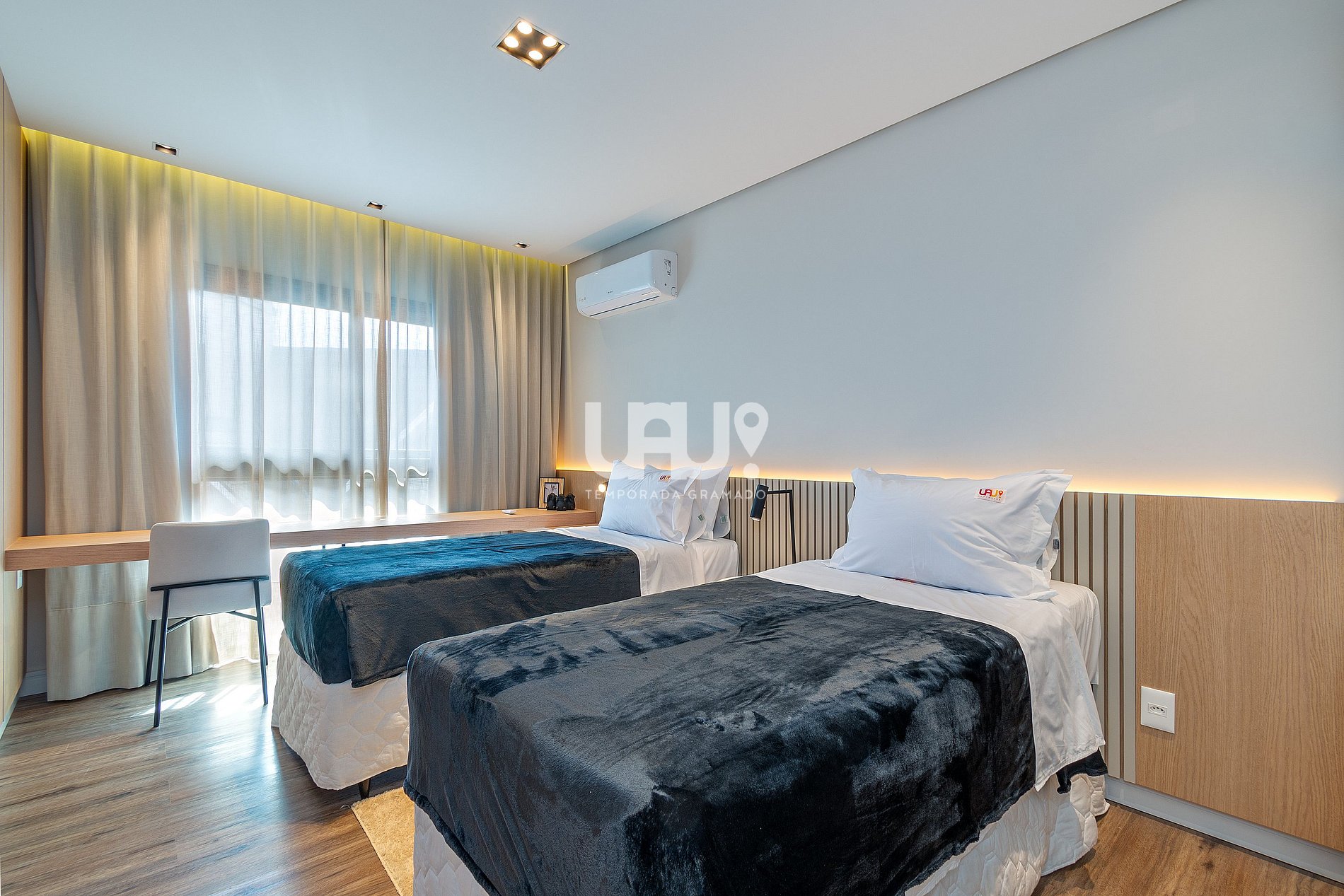 Dormitório com duas camas de solteiro (unidas formam uma cama Queen Size), cama auxiliar, SmartTV 32’ e split quente e frio;