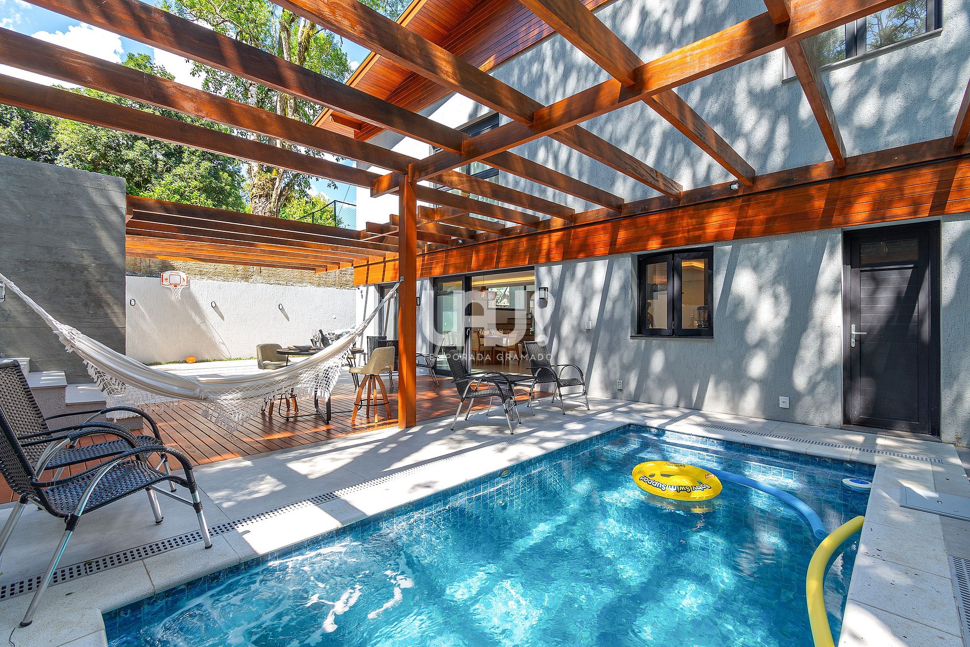 A casa acomoda até 14 hóspedes em 4 confortáveis suítes, incluindo uma Suíte Master com banheira de imersão e cama King Size. Além disso, conta com um amplo living integrado em três ambientes e uma piscina térmica privativa, garantindo conforto absoluto em todas as estações do ano.