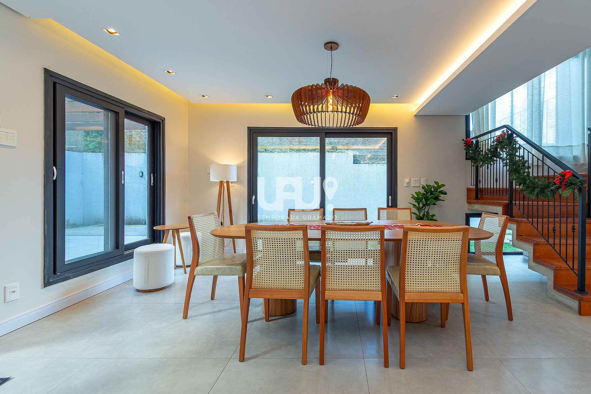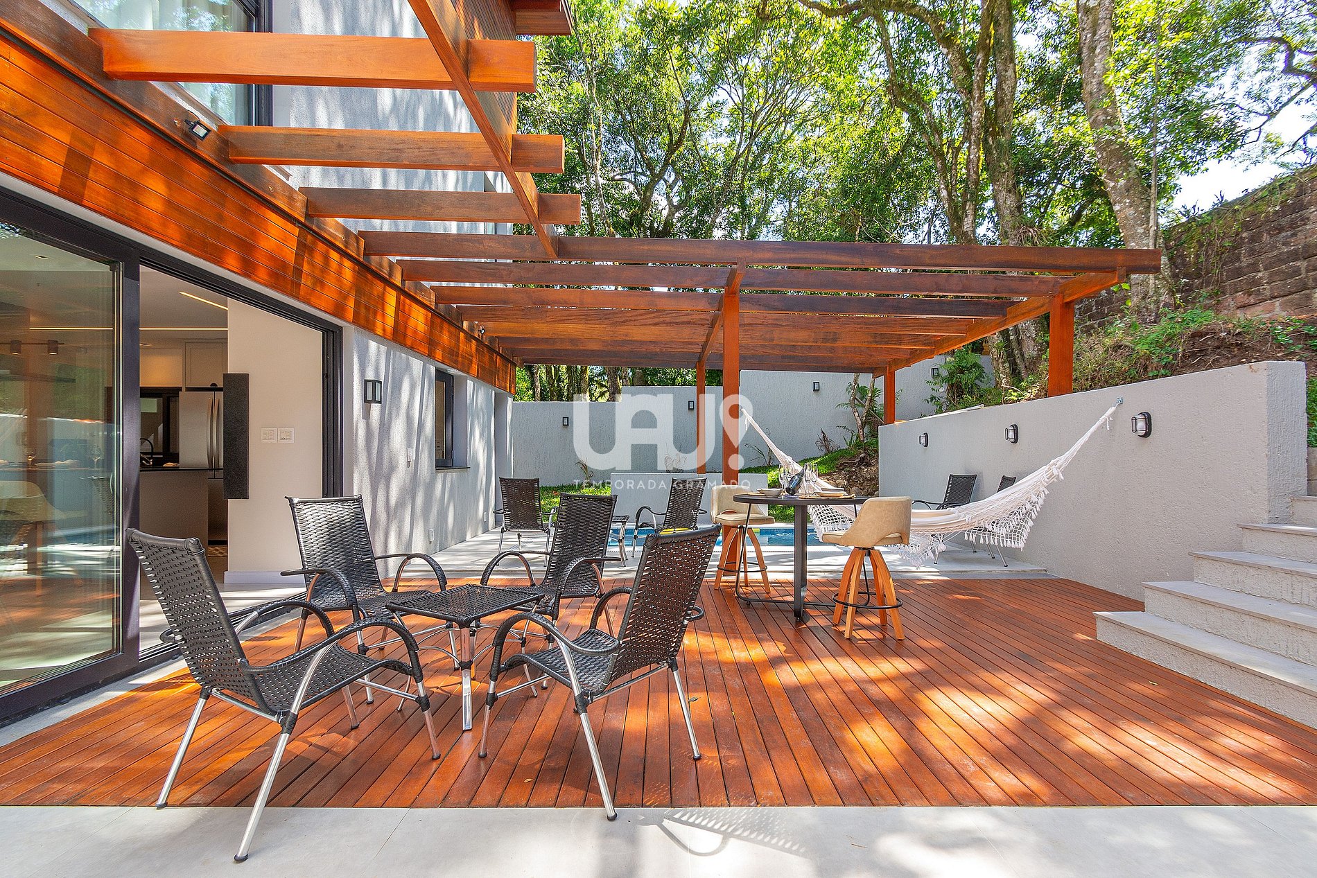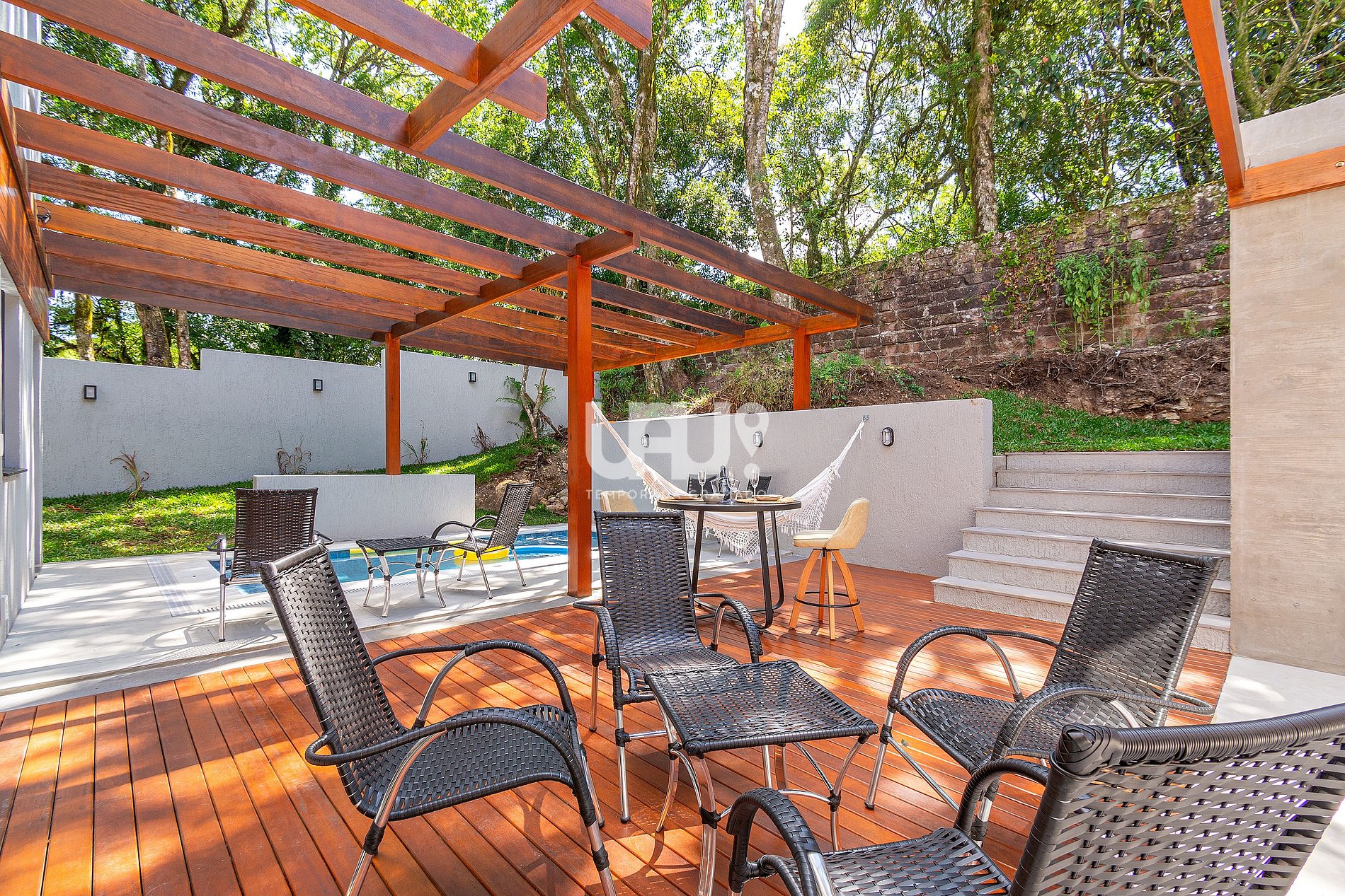 A casa também dispõe de lavanderia completa (máquina de lavar, secadora de parede e ferro de passar) e uma área externa charmosa com deck, mesas e cadeiras para momentos inesquecíveis de confraternização.