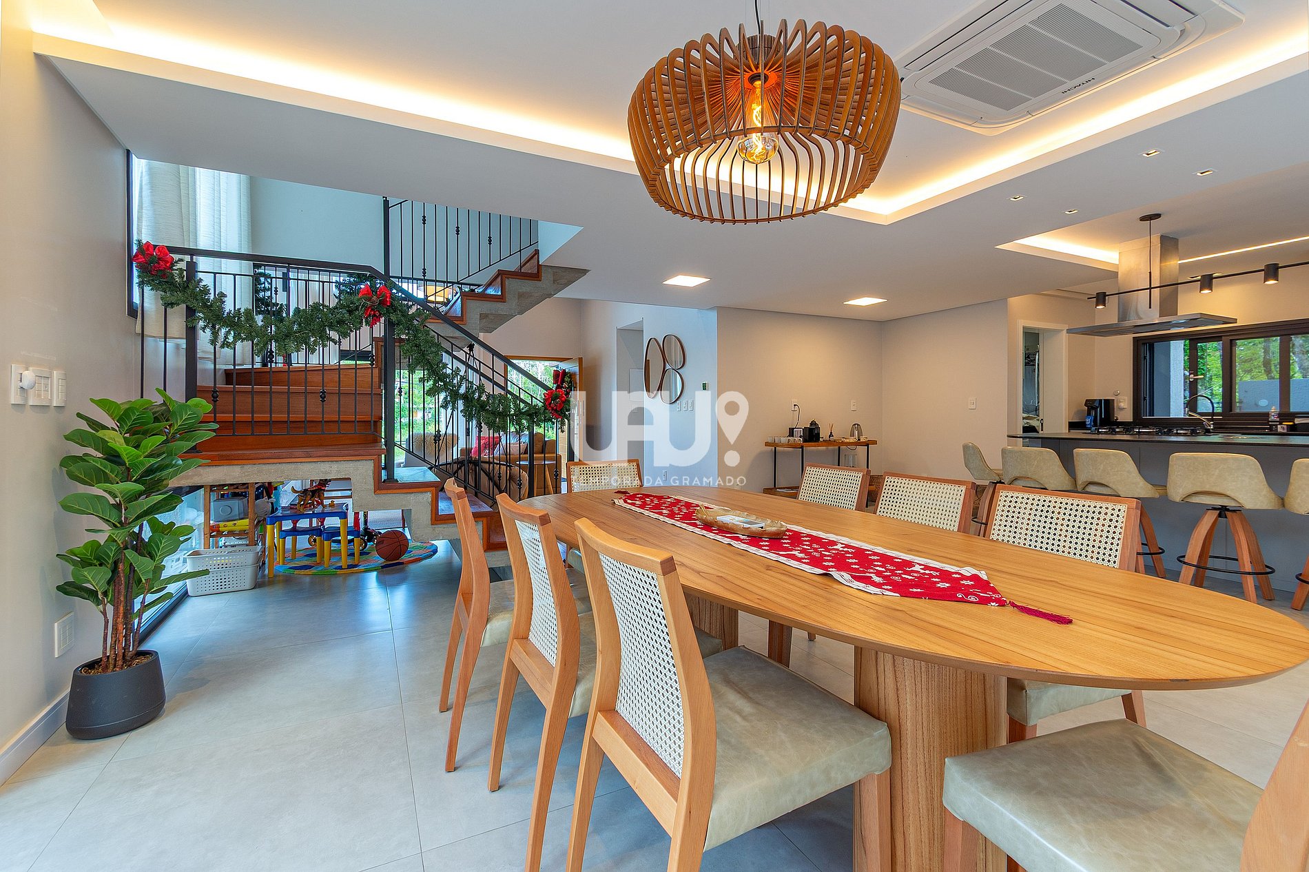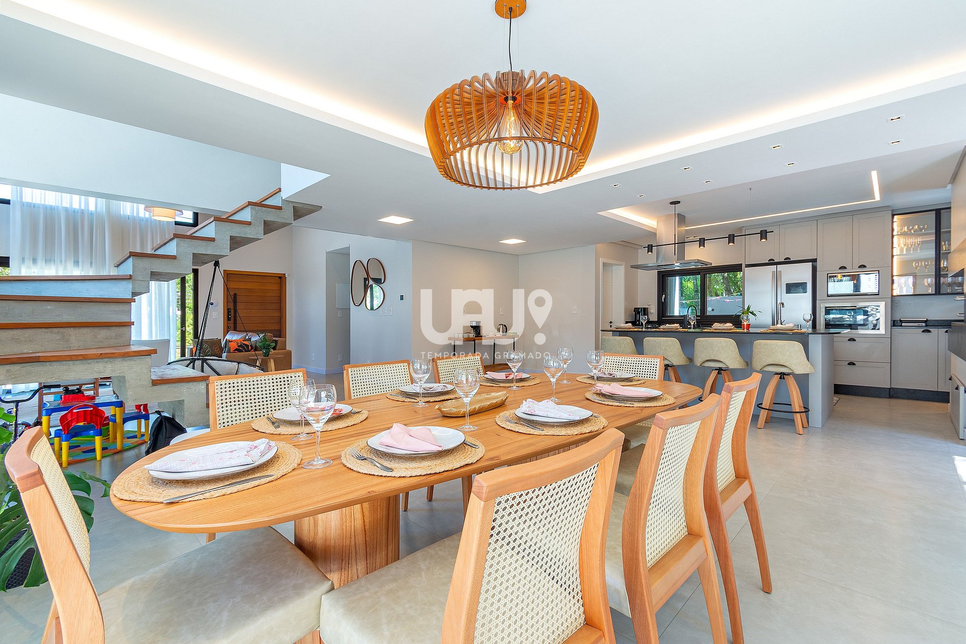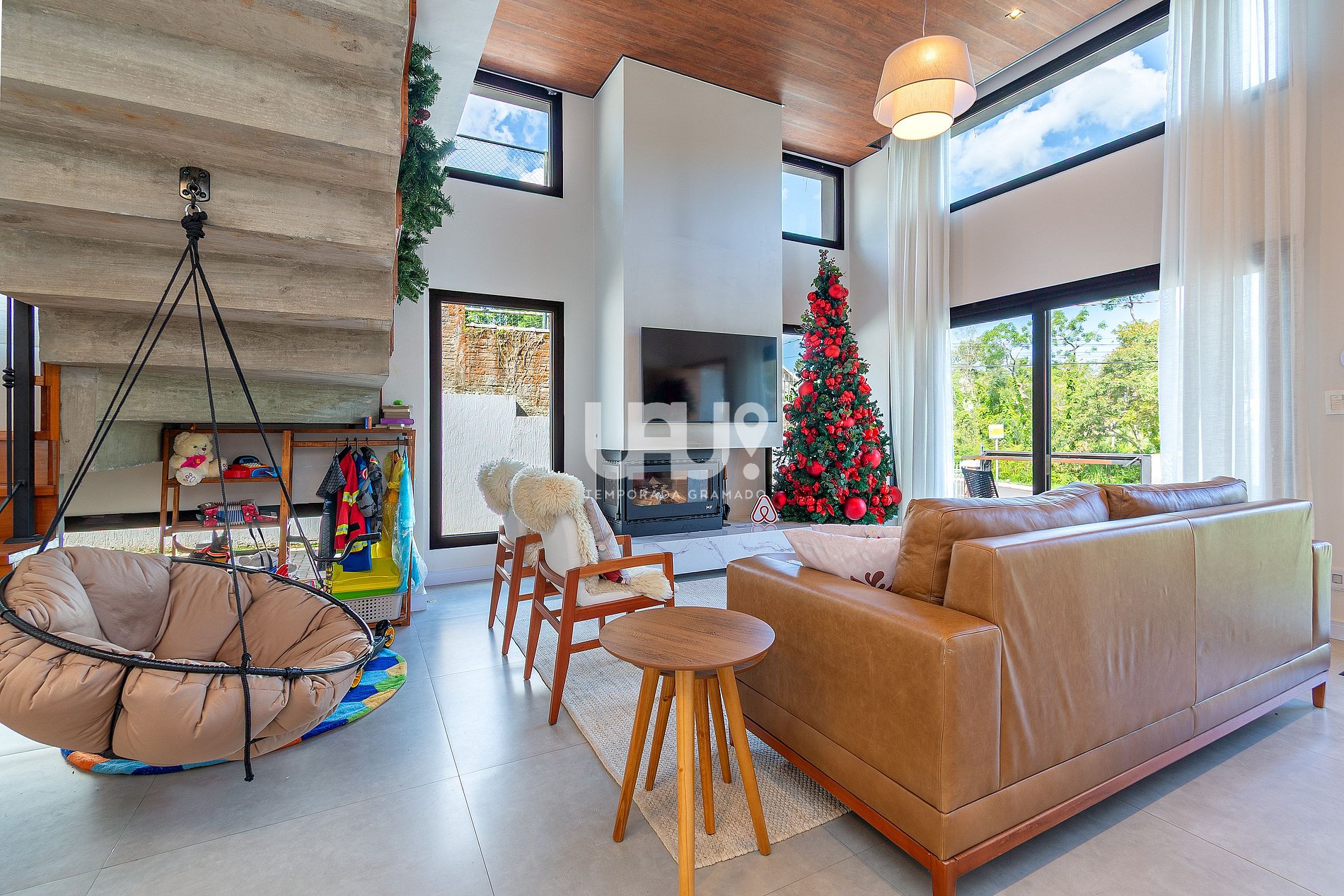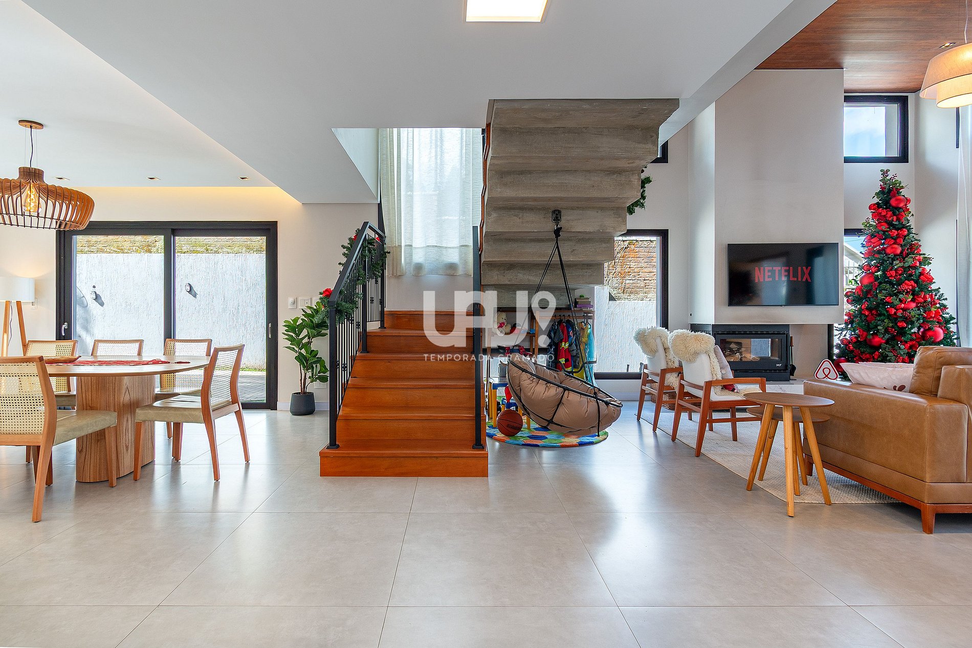 • Piscina térmica privativa (temperatura 28º a 30ºC). Em dias com temperatura externa inferior a 10ºC o aquecimento não é possível.• 4 suítes elegantes, incluindo uma master com banheira de imersão;• Living aconchegante com lareira, Smart TV 55”, sofá em couro, cadeira ninho suspensa e brinquedoteca integrada para os pequenos;• Cozinha gourmet equipada, com refrigerador side by side, forno elétrico, air fryer, cafeteira elétrica, sanduicheira, liquidificador, jarra elétrica, purificador de água refrigerado e utensílios completos;• *Living e cozinha também climatizadas com ar-condicionado quente e frio;*• Espaço para churrasco, com grelha, espetos rotativos e bifeteira;• Wi-Fi ultra-rápido (1.000Mb);• Garagem para até 5 carros;No térreo, além do living integrado, a casa possui um lavabo requintado e uma suíte.